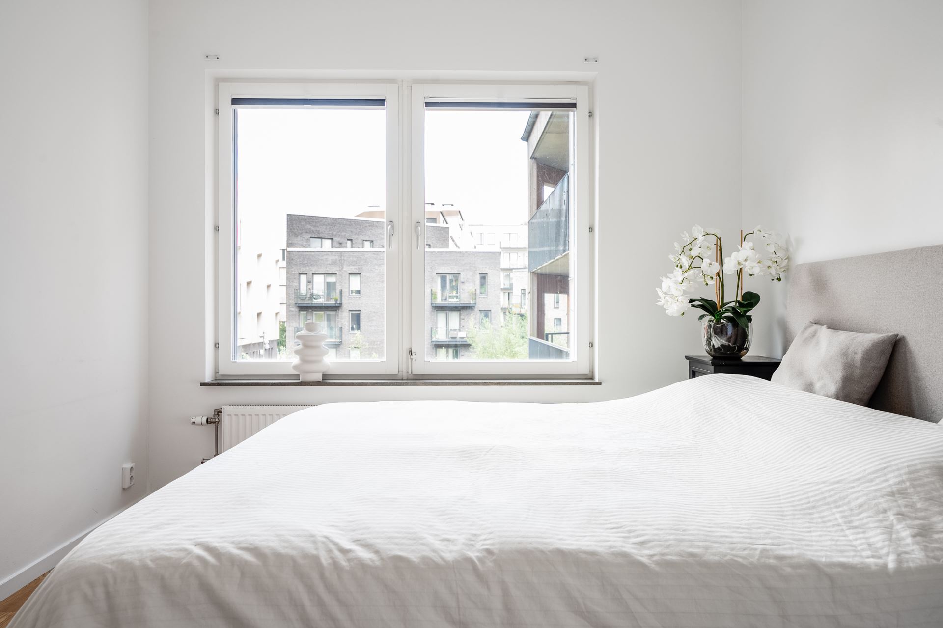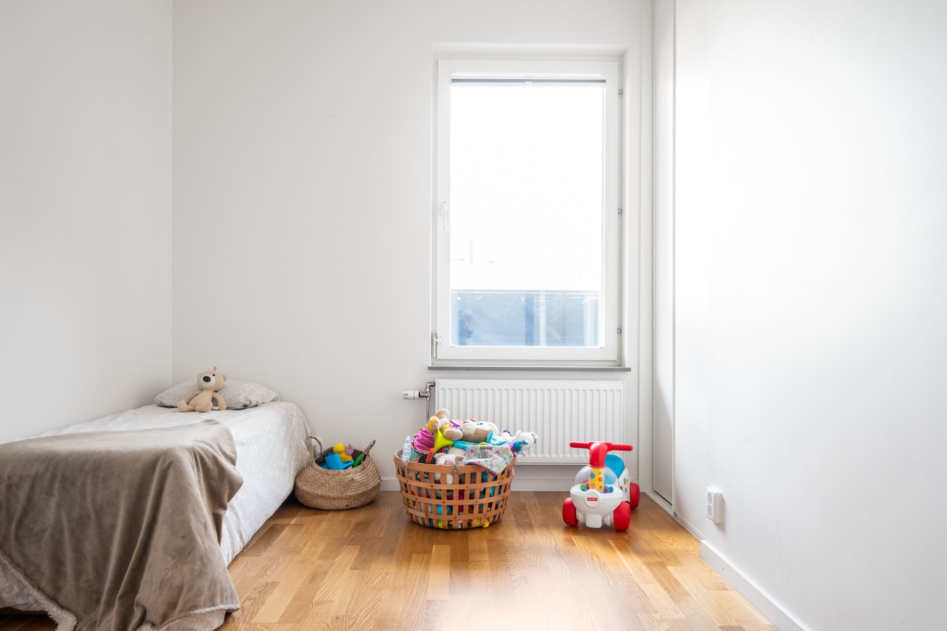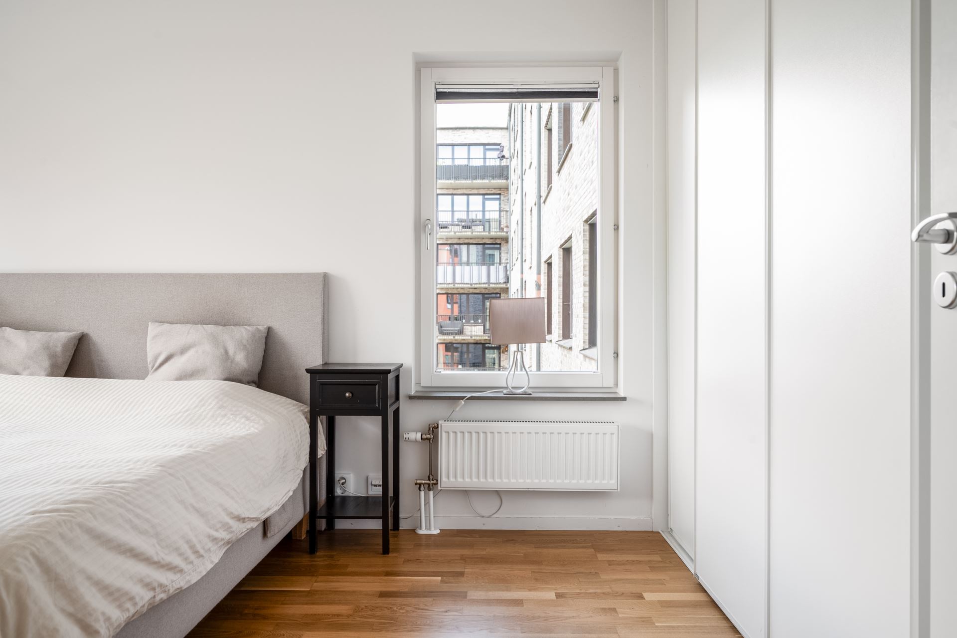 Vägg i vägg med vardagsrummet finner vi det mindre sovrummet som passar perfekt som barnrum, gästrum eller hemmakontor. Liksom resterande av lägenheten återfinns även här släta vita väggar tillsammans med ekparkett på golv. Här finns dessutom gott om garderobsförvaring.