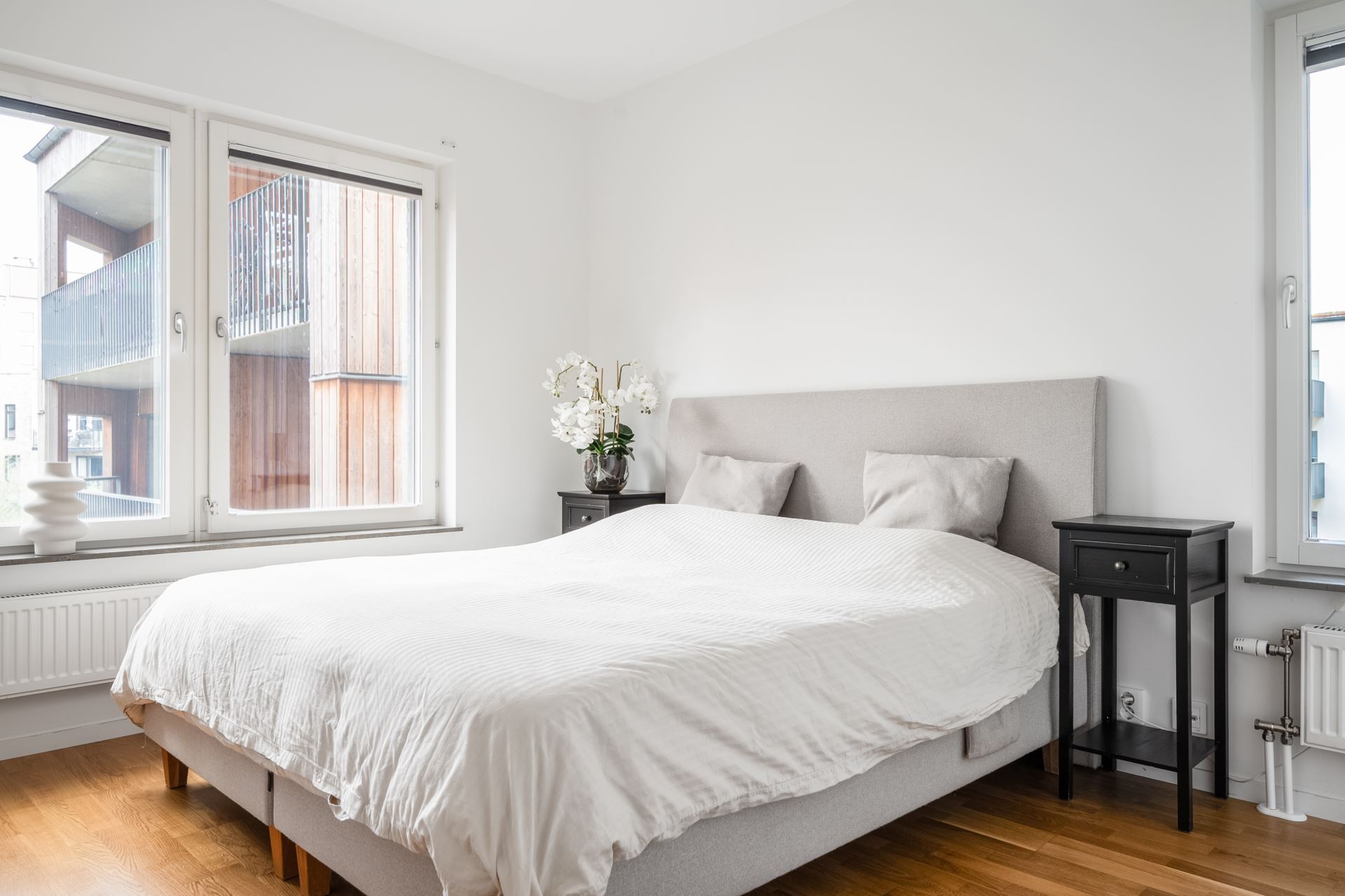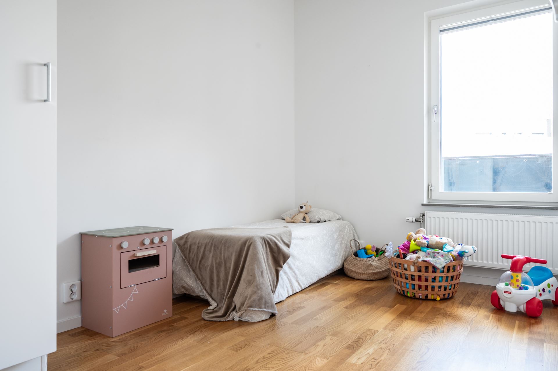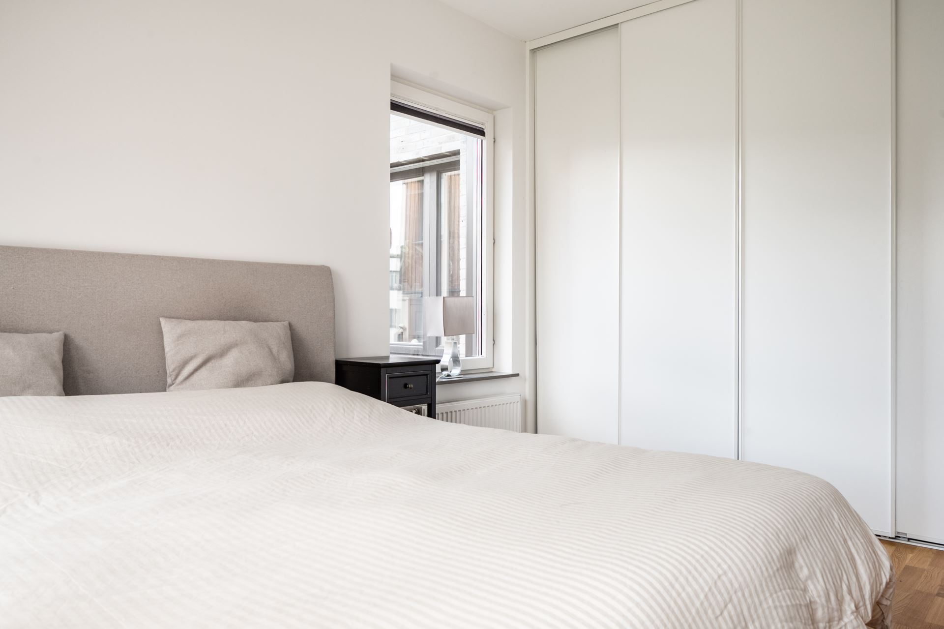 Vägg i vägg med vardagsrummet finner vi det mindre sovrummet som passar perfekt som barnrum, gästrum eller hemmakontor. Liksom resterande av lägenheten återfinns även här släta vita väggar tillsammans med ekparkett på golv. Här finns dessutom gott om garderobsförvaring.