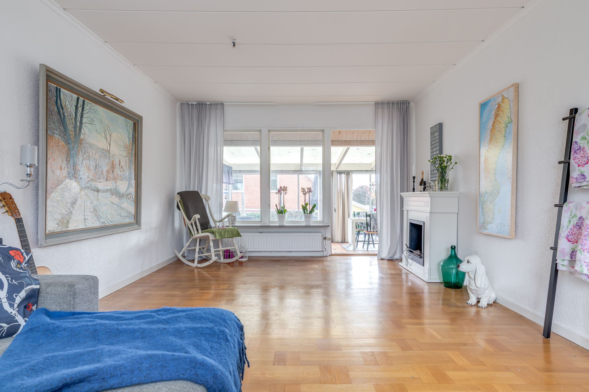 Parkettgolv ger en varm grund, plats för både stor soffgrupp och matsalsdel.