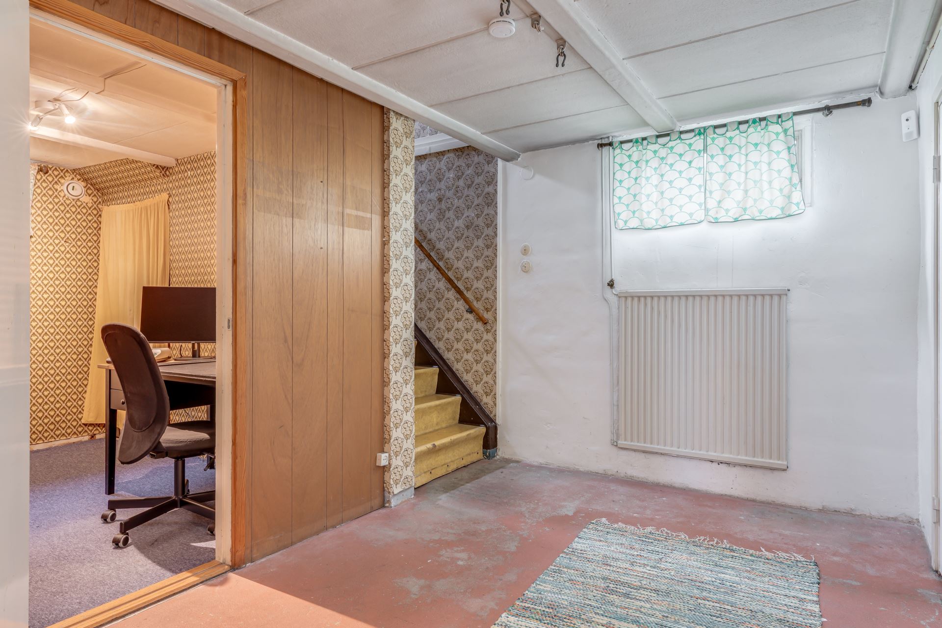 Fönster ger naturligt ljus, flera dörrar vidare till källarens rum.