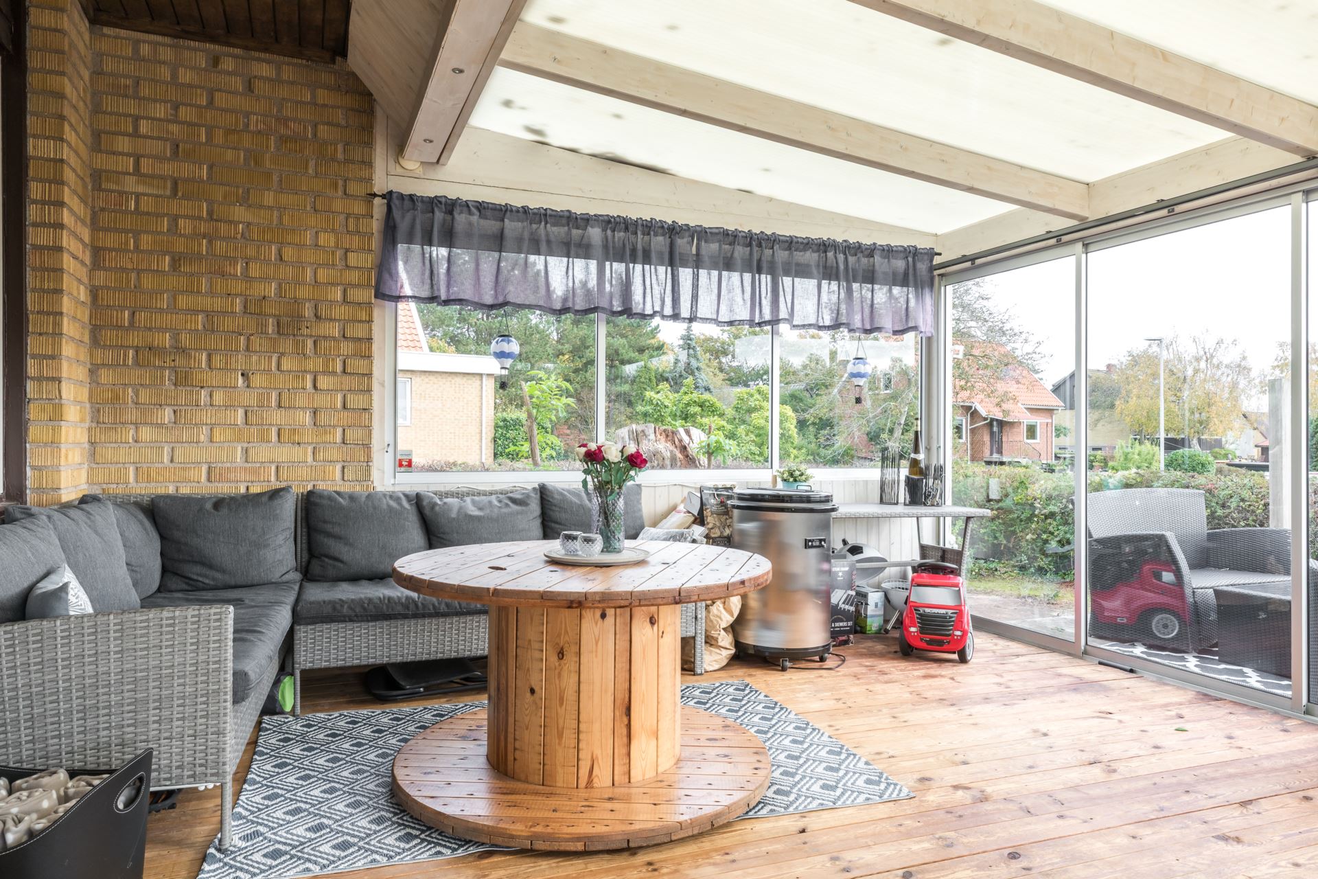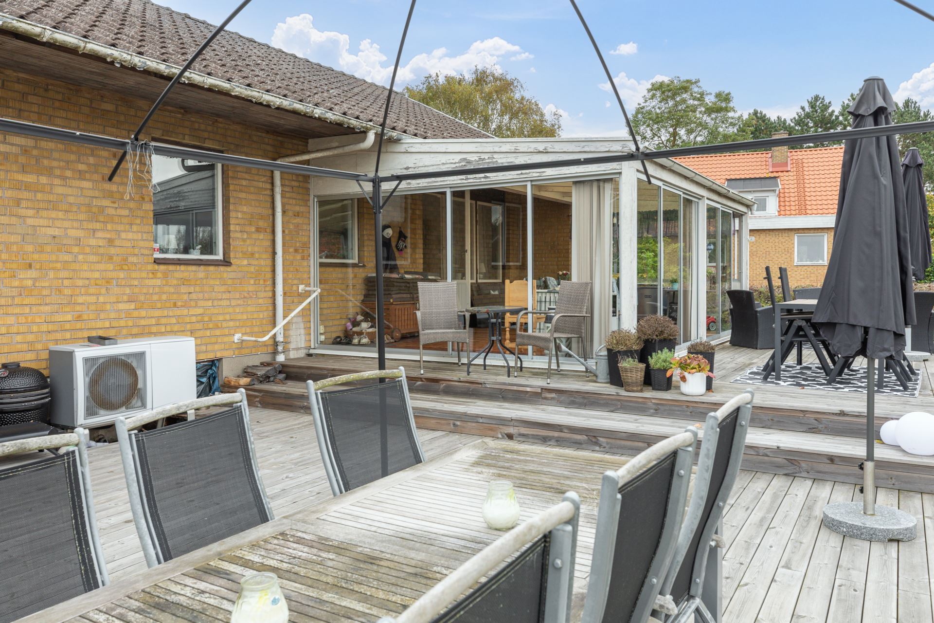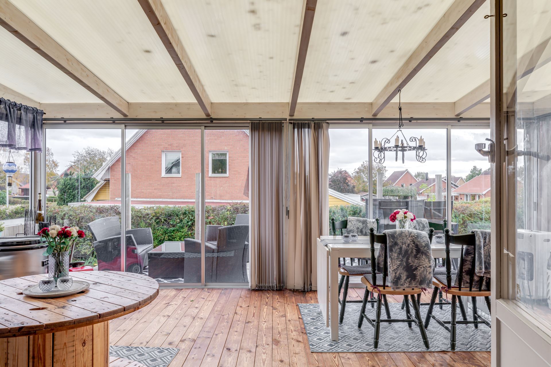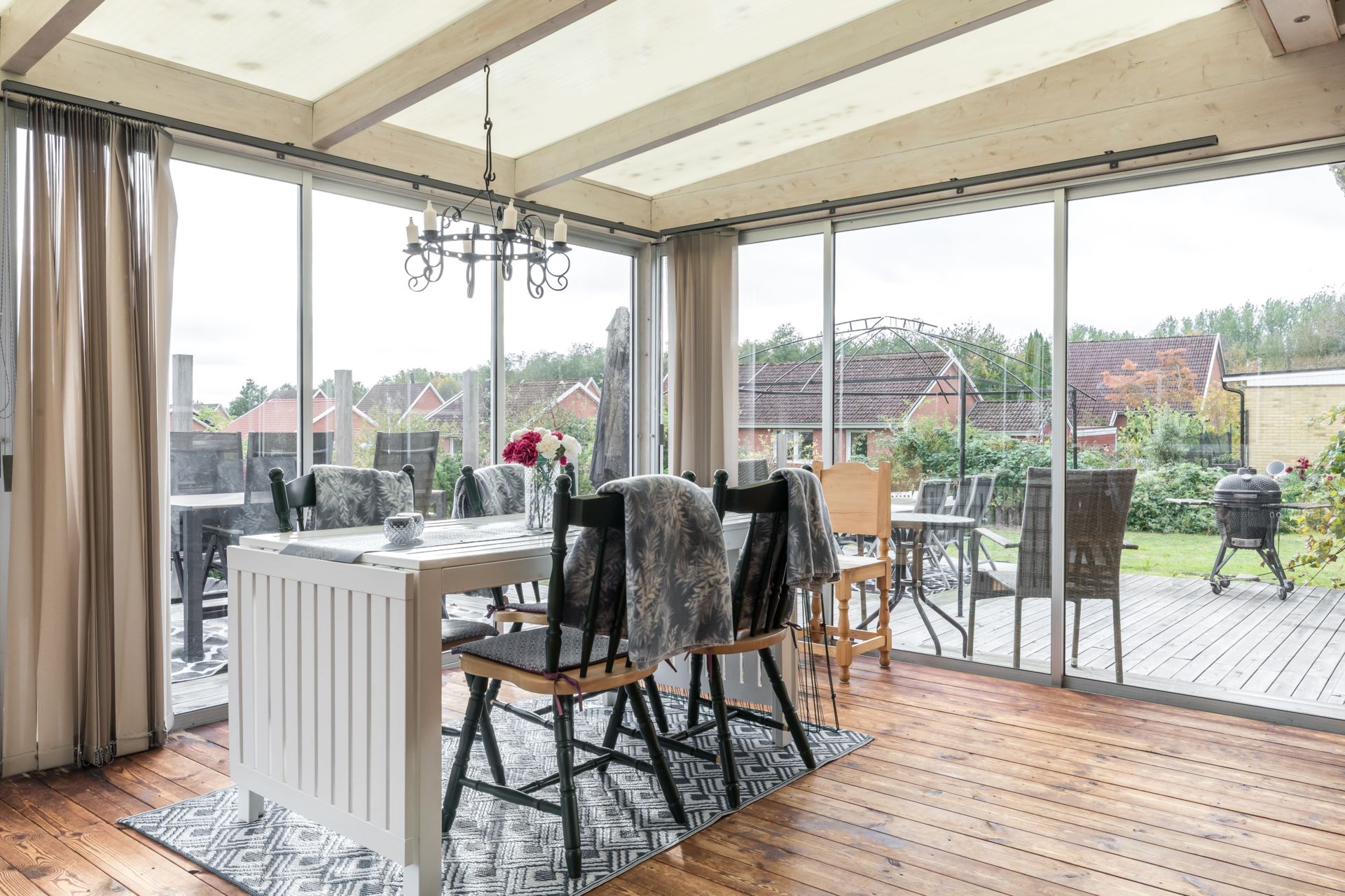 Stort inglasat uterum i anslutning till vardagsrummet, skjutpartier mot trädäck.