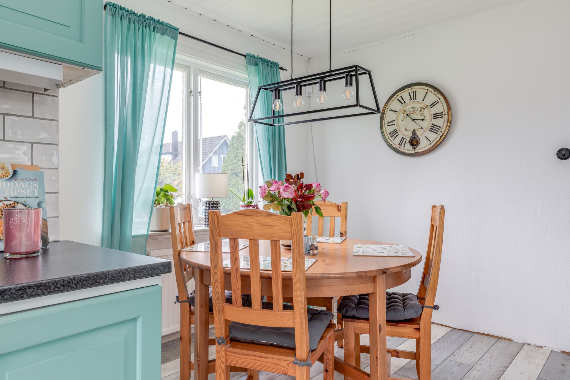 Matplats vid fönster med trevlig utblick mot trädgården, plats för 4–6 personer.
