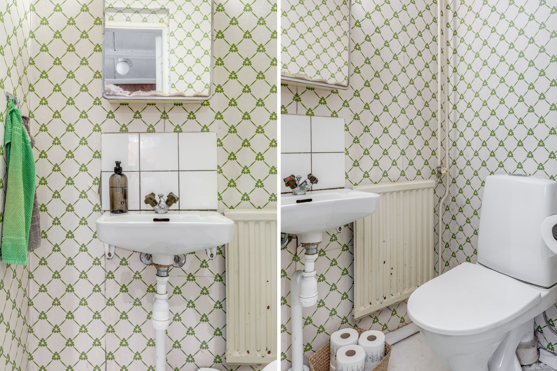 Praktisk wc i anslutning till källarplan, utrustad med tvättställ och wc.