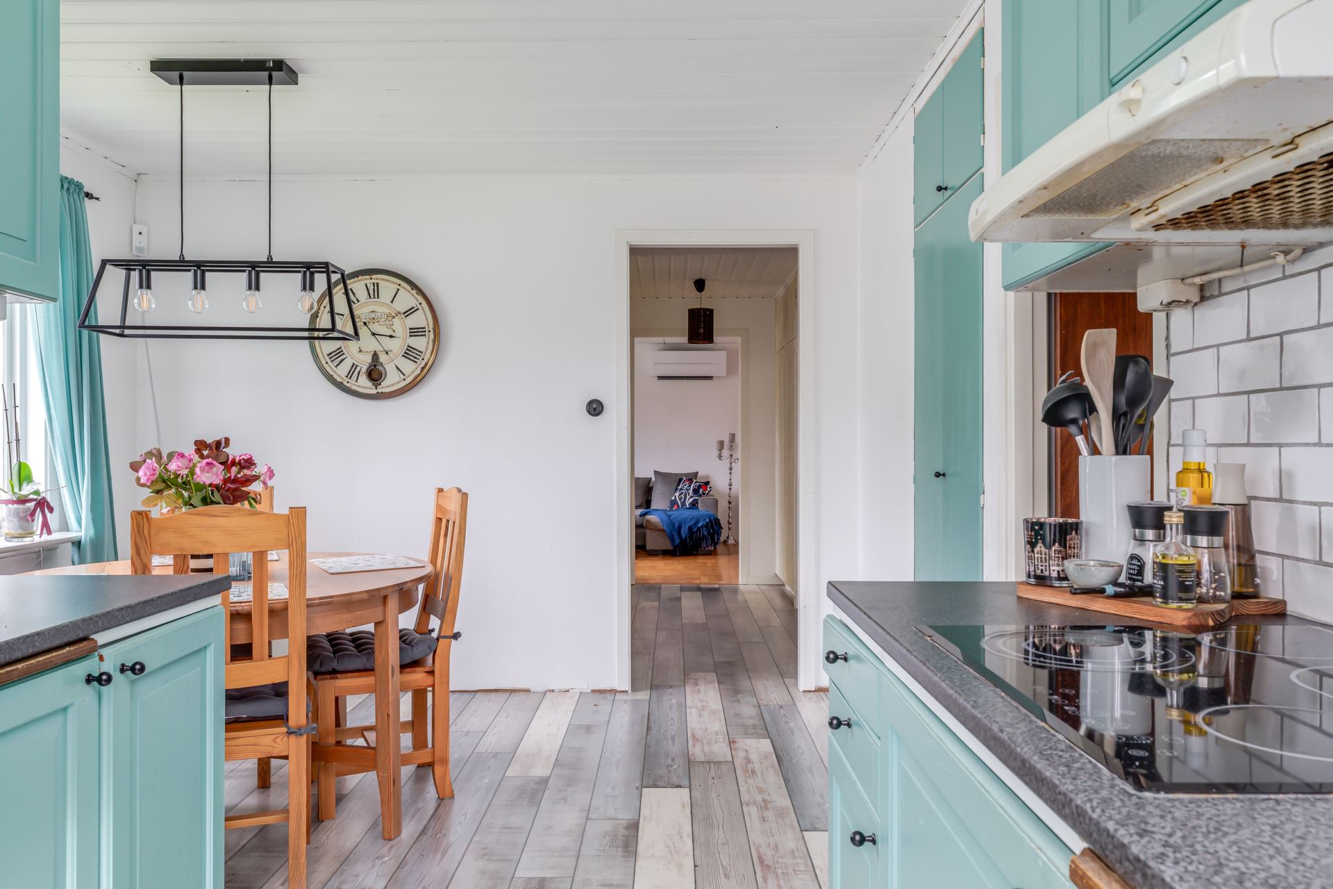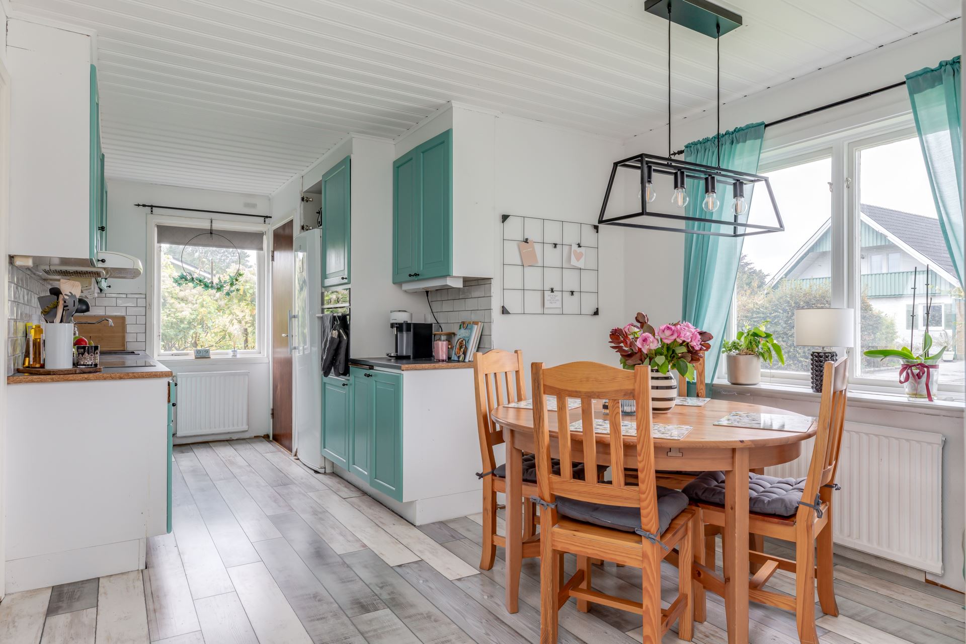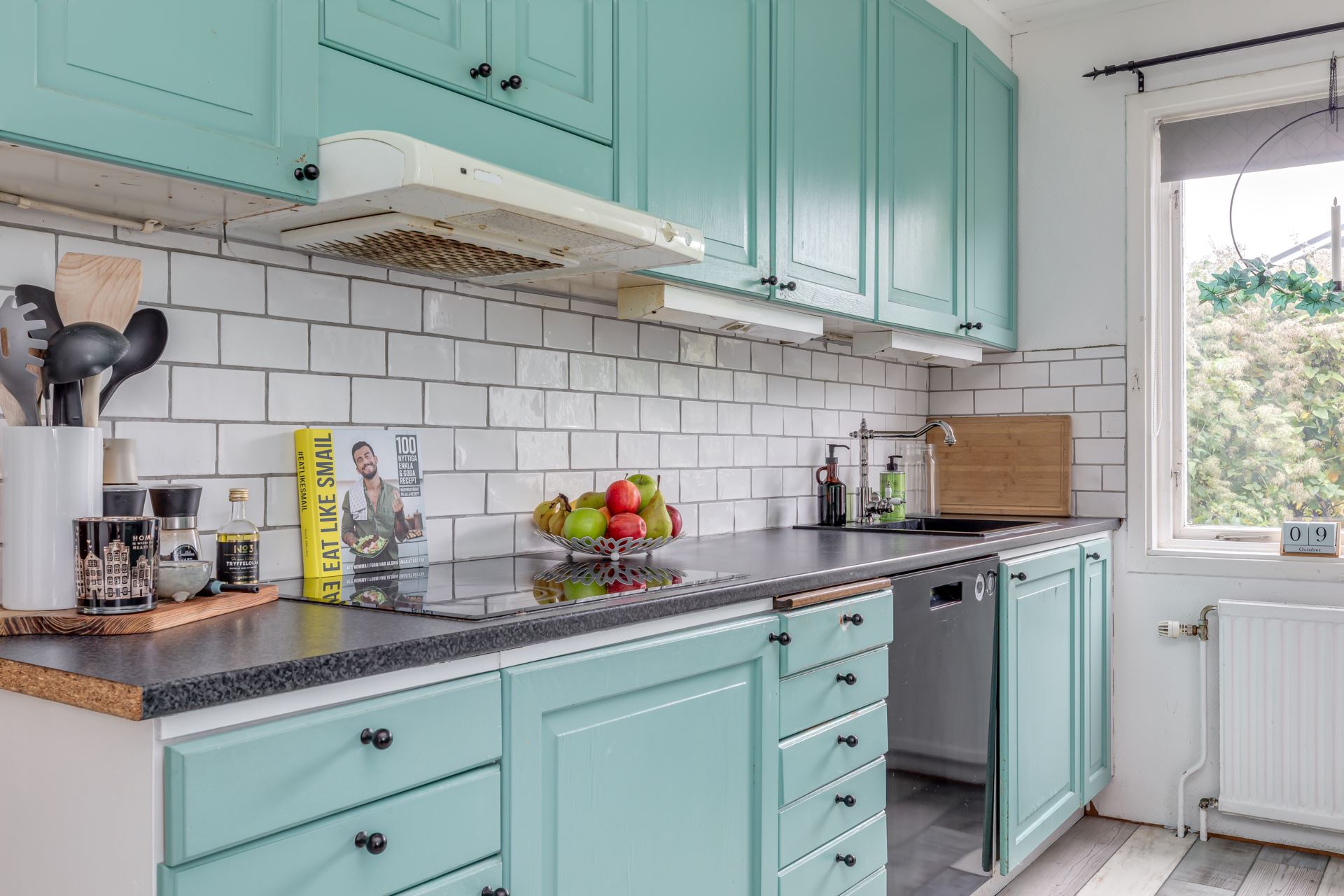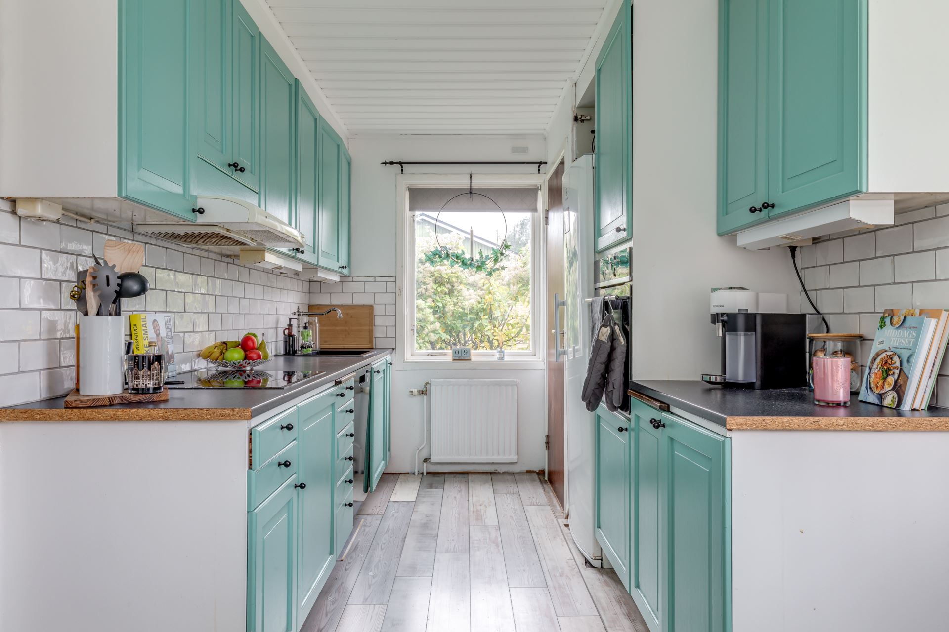 Vita kakelplattor och målade luckor ger en hemtrevlig känsla.