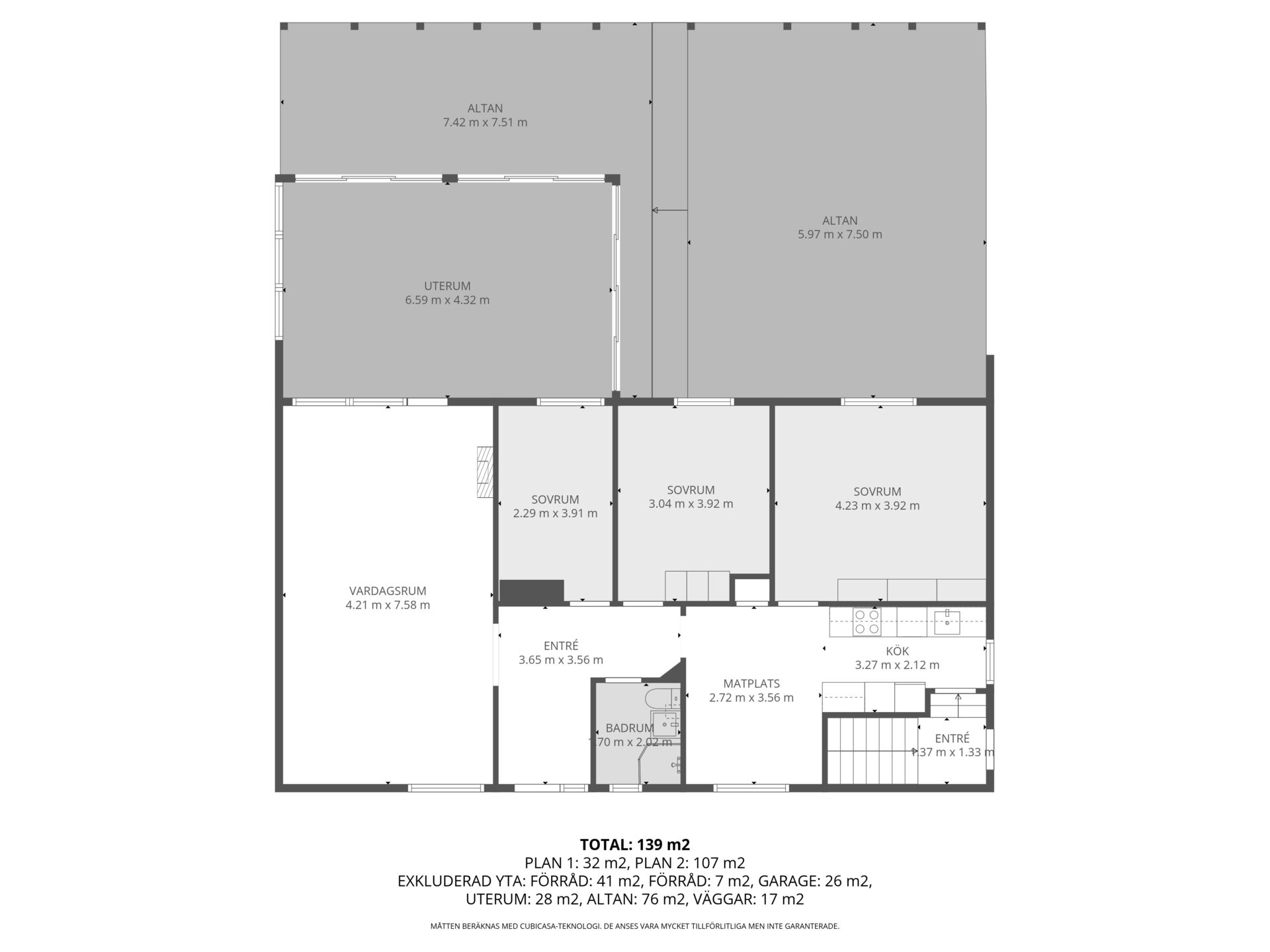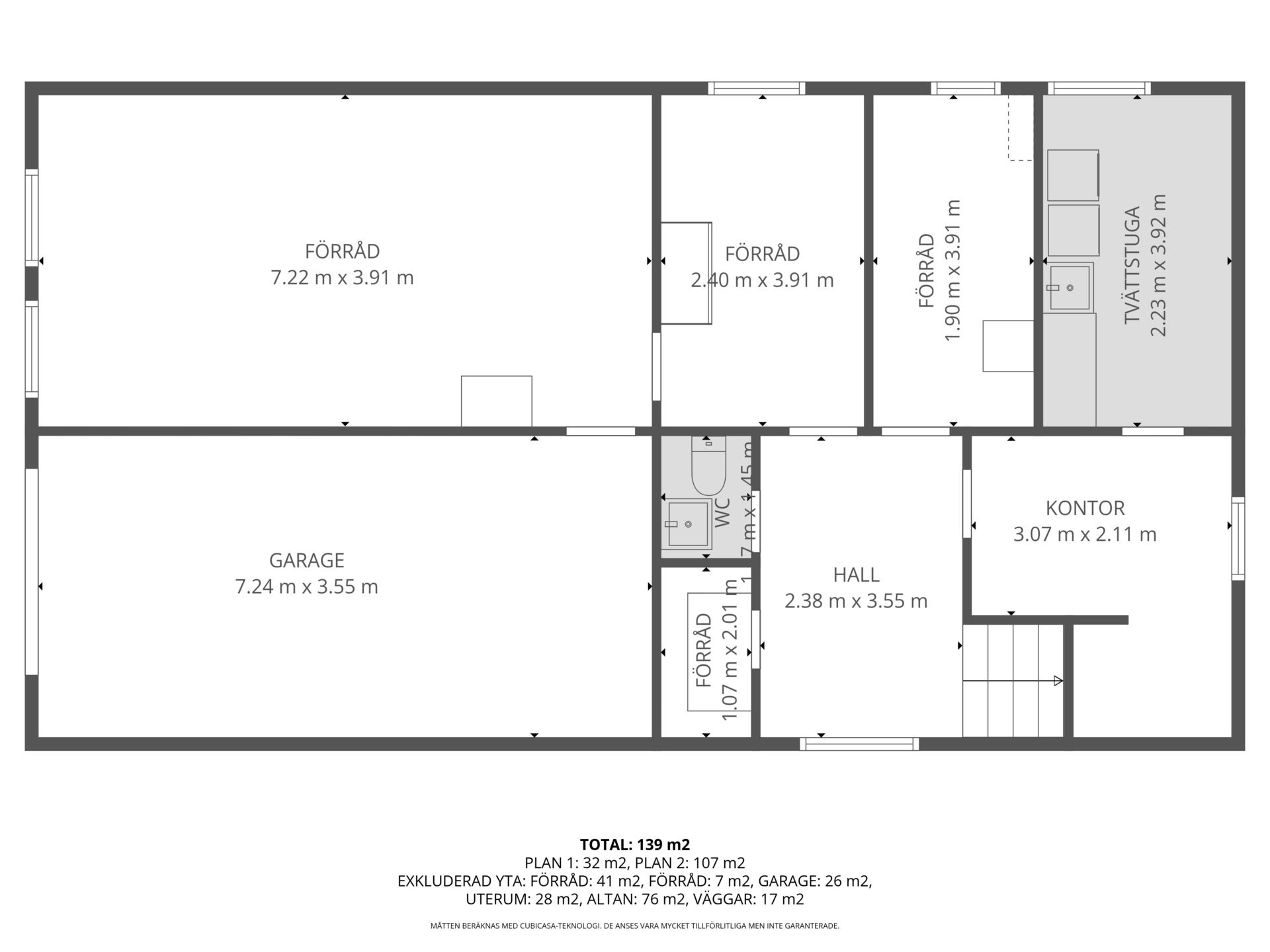Plats för bil, cyklar och verktyg, direktaccess vidare in i huset.