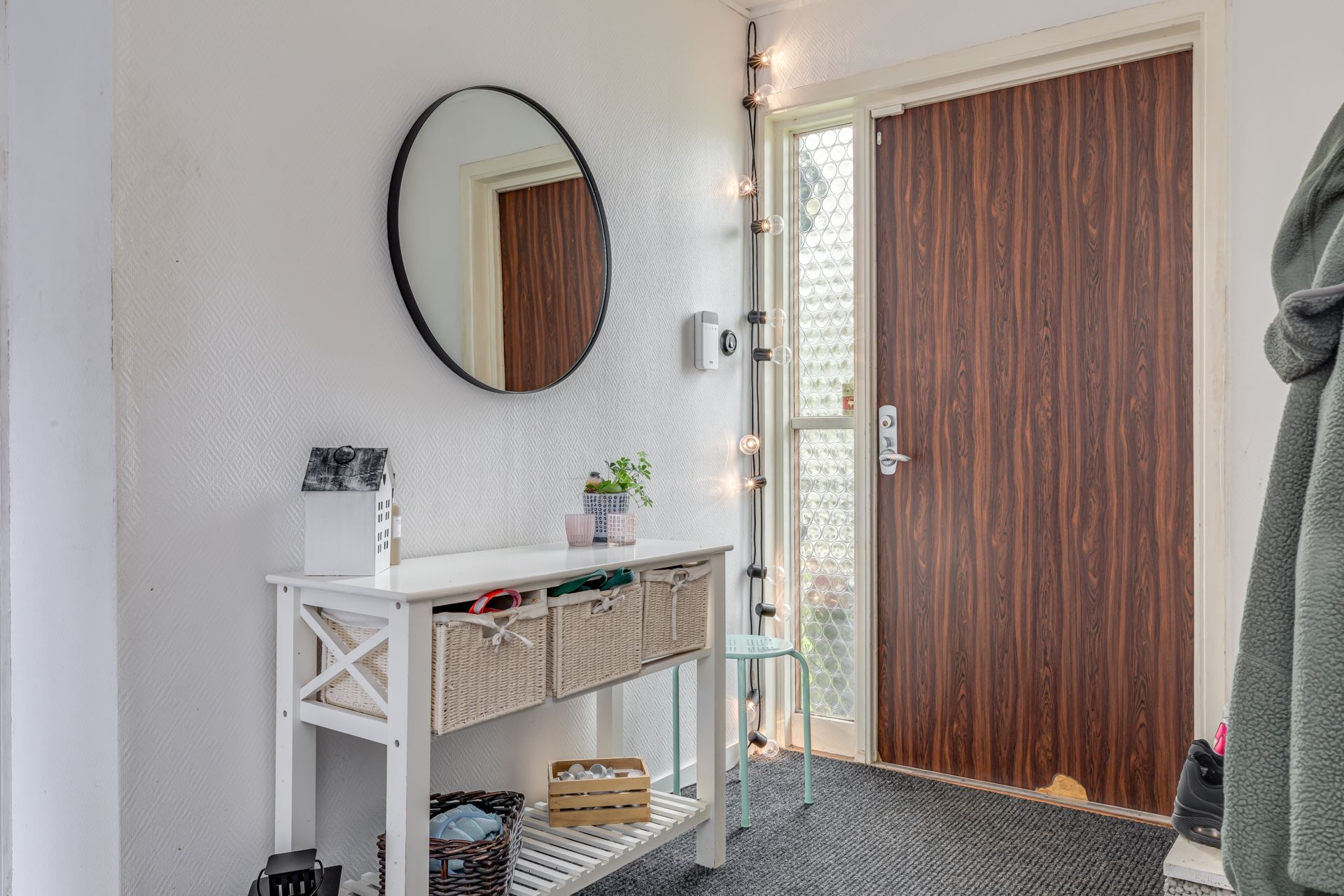 Välkomnande hall med plats för skor, krokar och avhängning, fönster släpper in dagsljus.