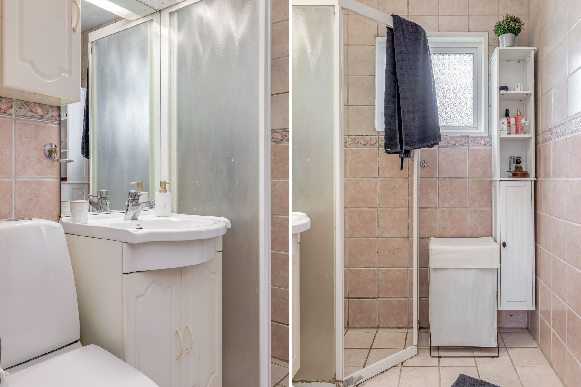 Kakel på vägg och klinker på golv, inrett med duschhörna, wc och tvättställ.