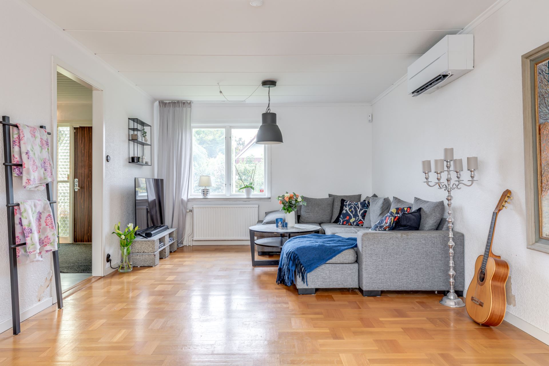 Rymligt och lättmöblerat vardagsrum med fint ljus från två väderstreck.
