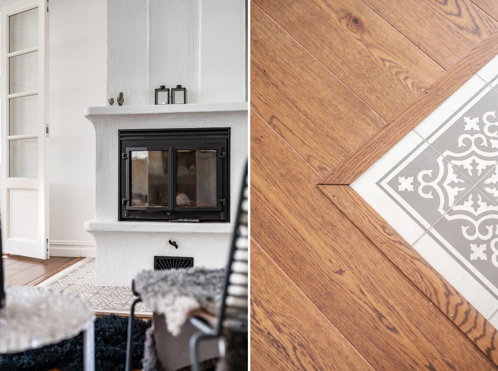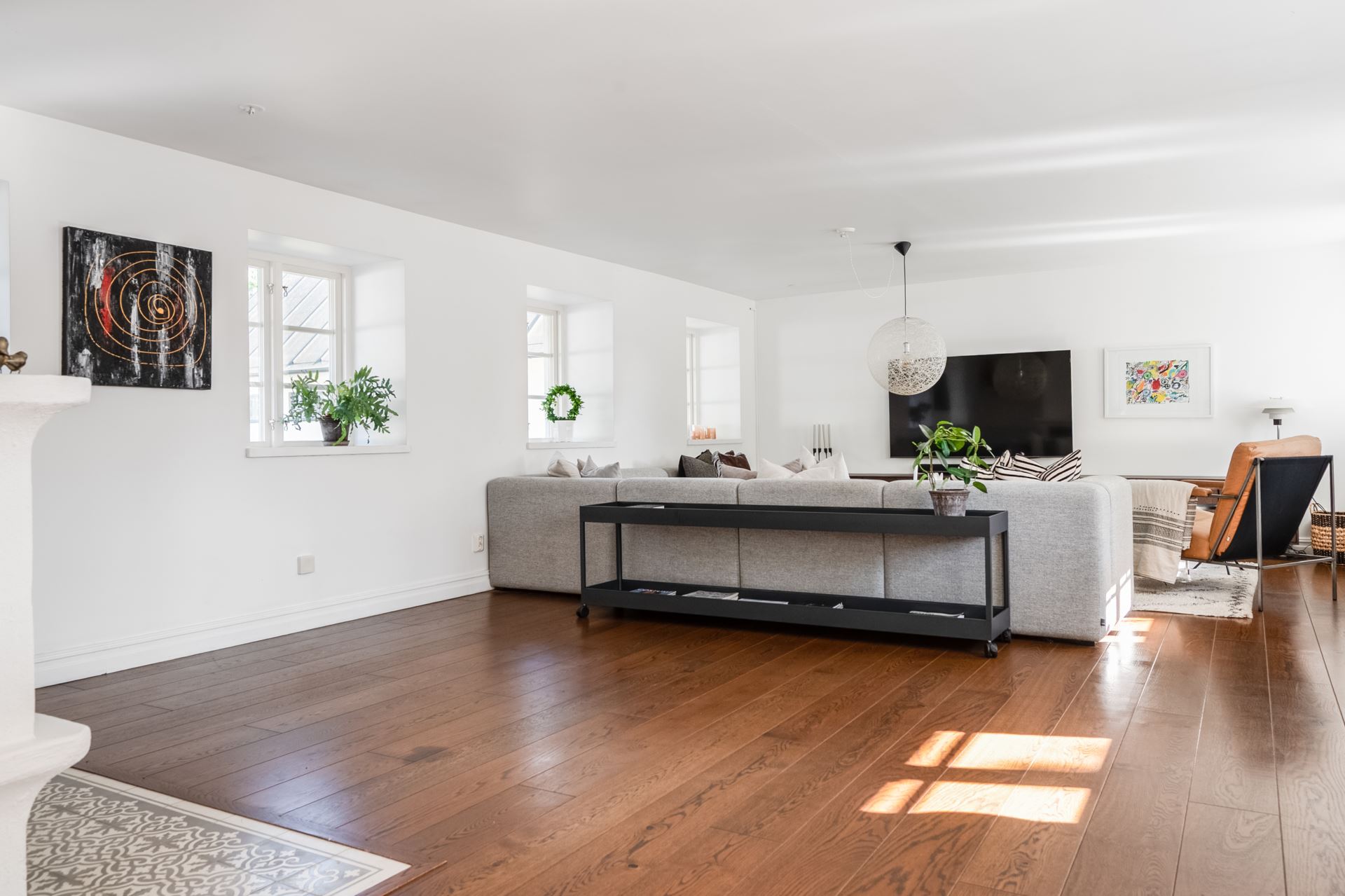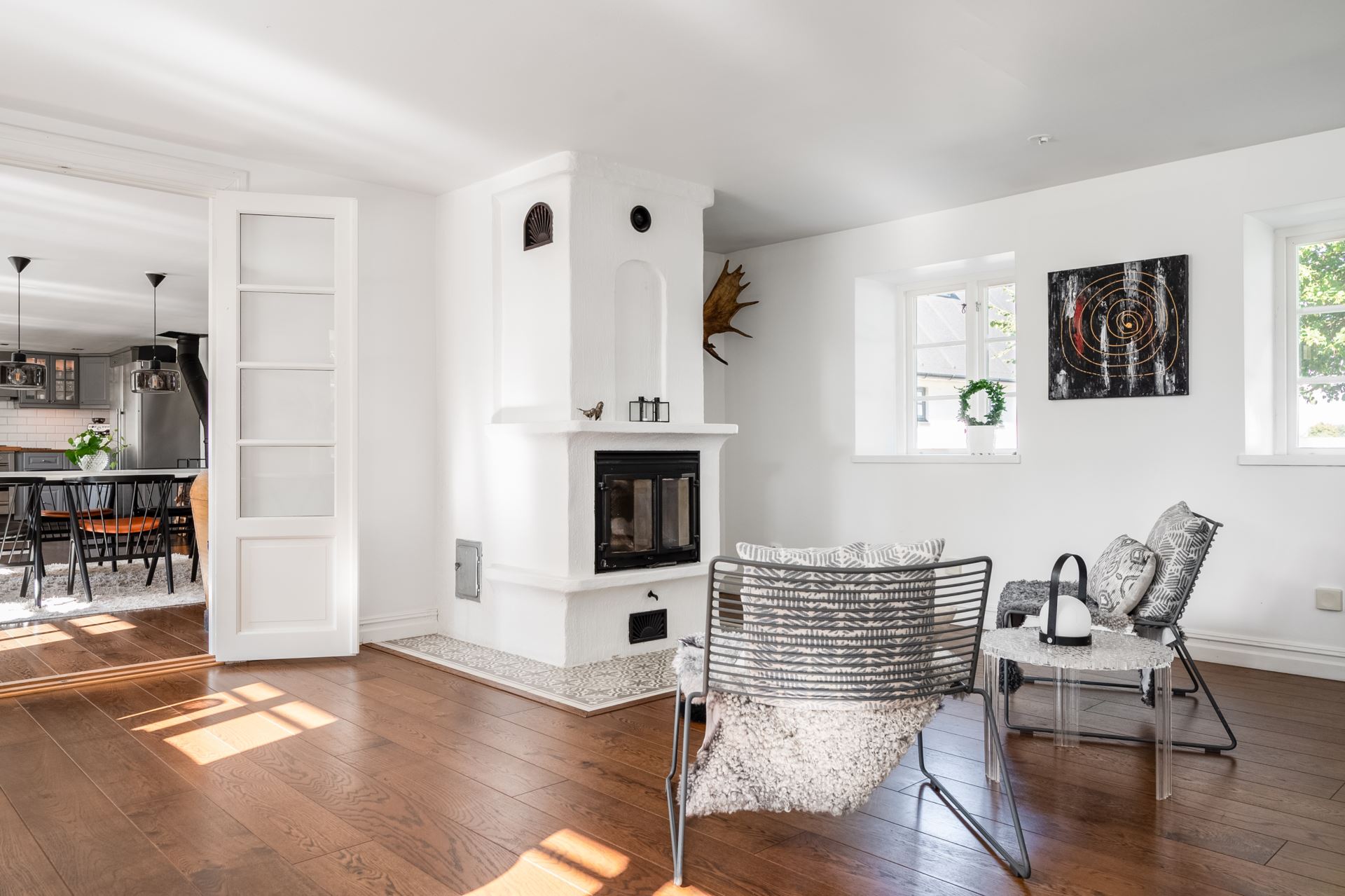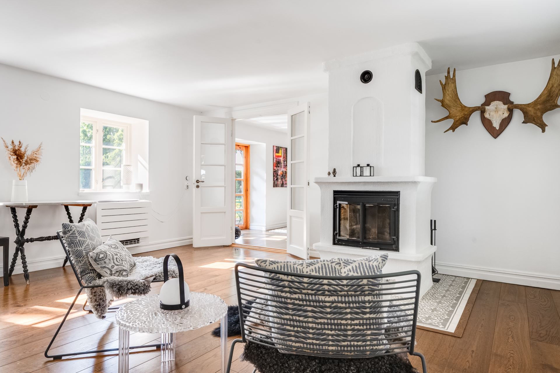 Vardagsrum: Kährs plankgolv och vita väggar. Dubbla dörrar med glas öppnar upp till vardagsrummet och bjuder in till ett rymligt rum med generösa kvadratmeter. En murad spis förstärker den charmiga atmosfären och skapar en naturlig samlingspunkt. Här finns gott om plats för möblering med soffgrupp, fåtöljer och mer. Det genomgående ljusinsläppet från flera djupa fönster skapar en ljus och inbjudande känsla.
