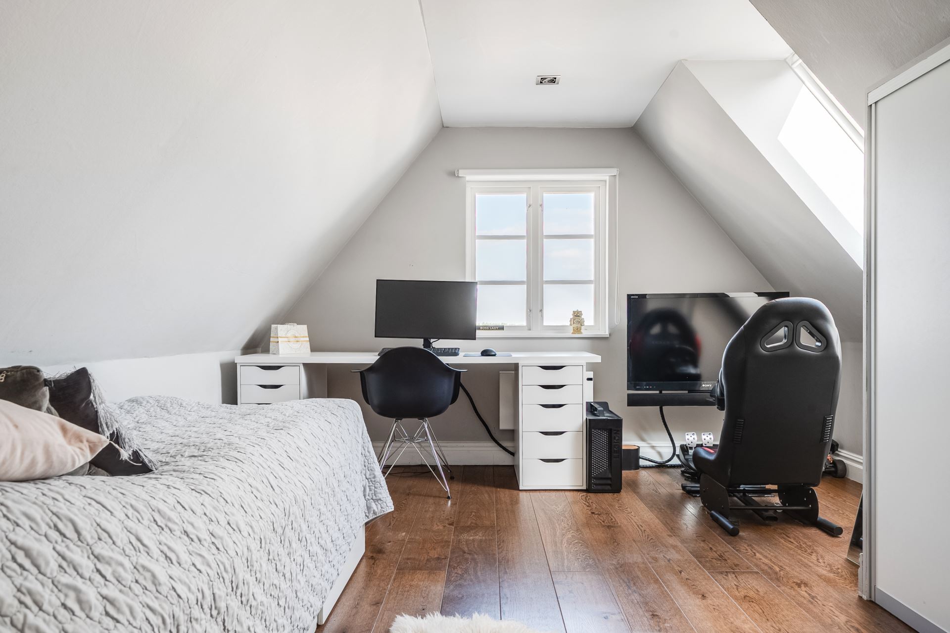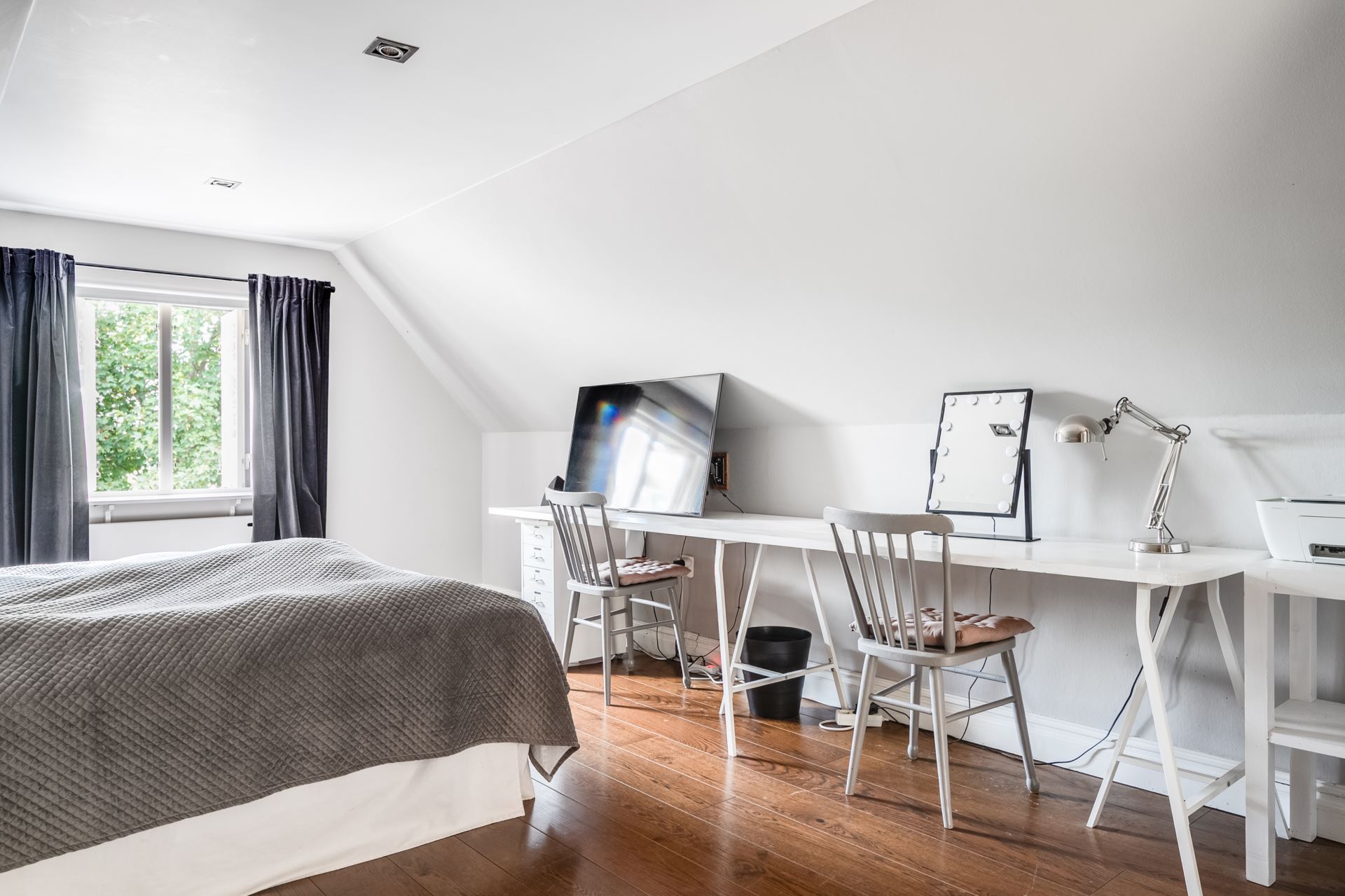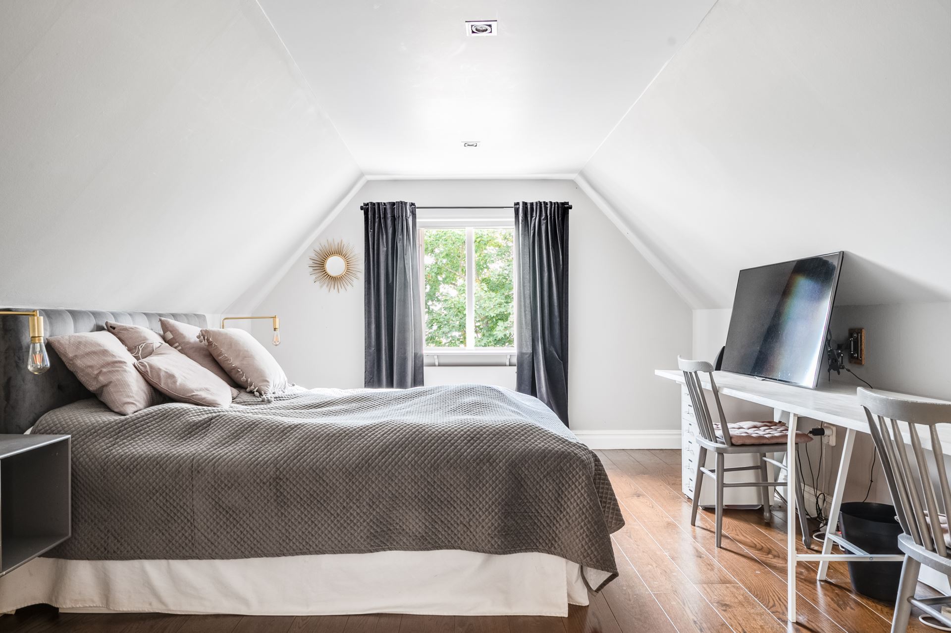 Sovrum 4: Kährs plankgolv och vita väggar. Detta sovrum ligger i den andra gaveln och har ett fint ljusinsläpp. Rummet erbjuder plats för både skrivbord och säng, samt förvaring i en inbyggd garderob.