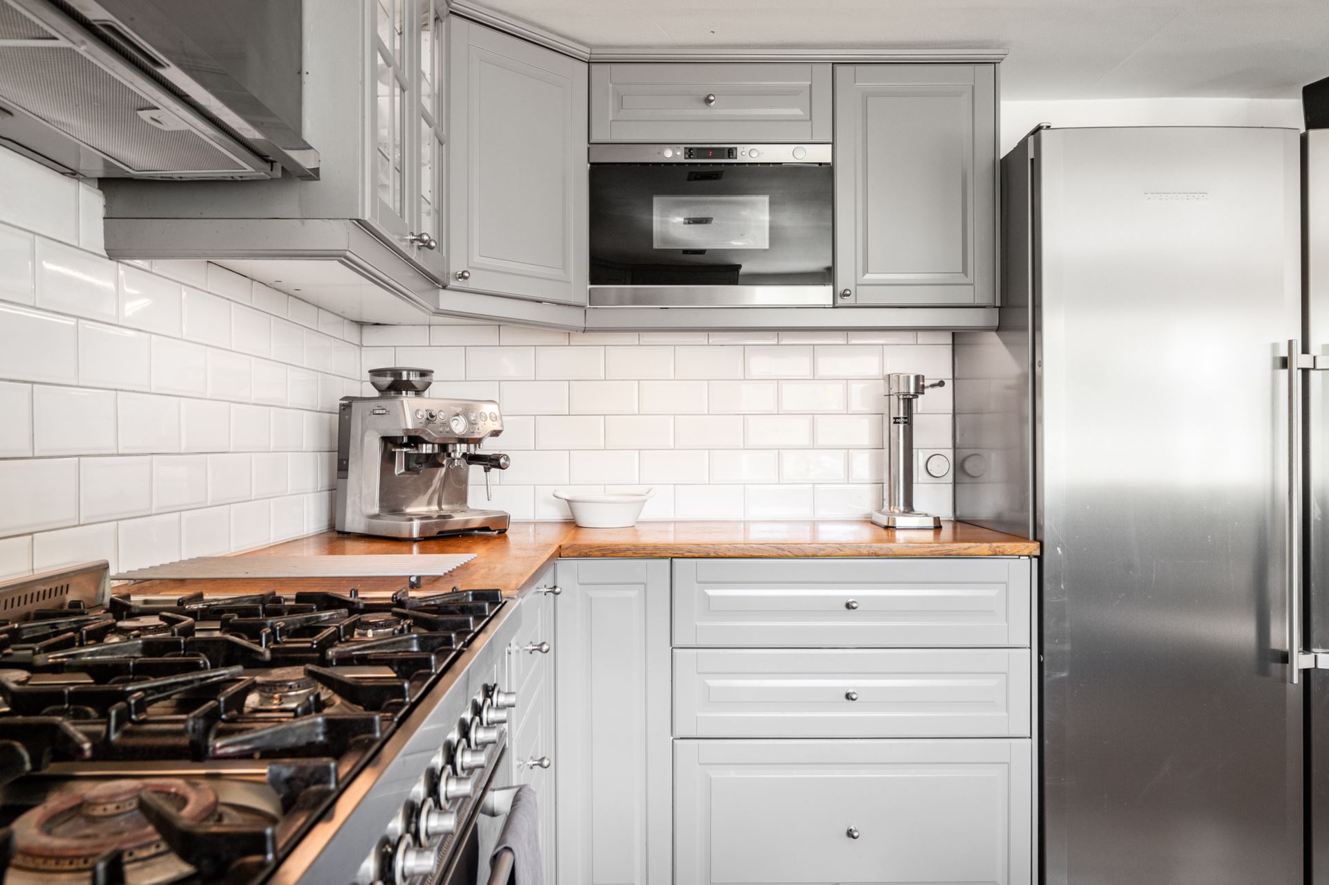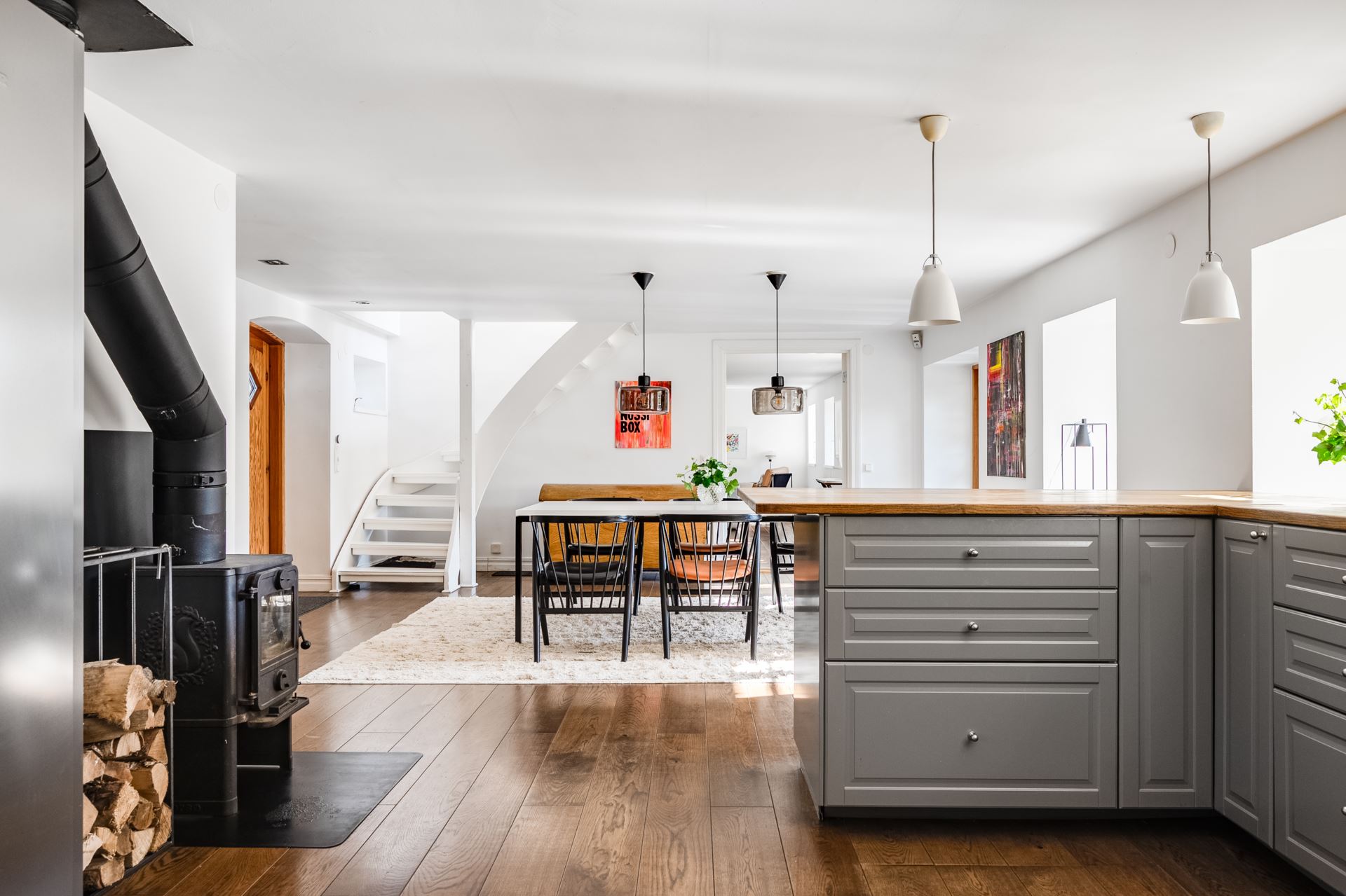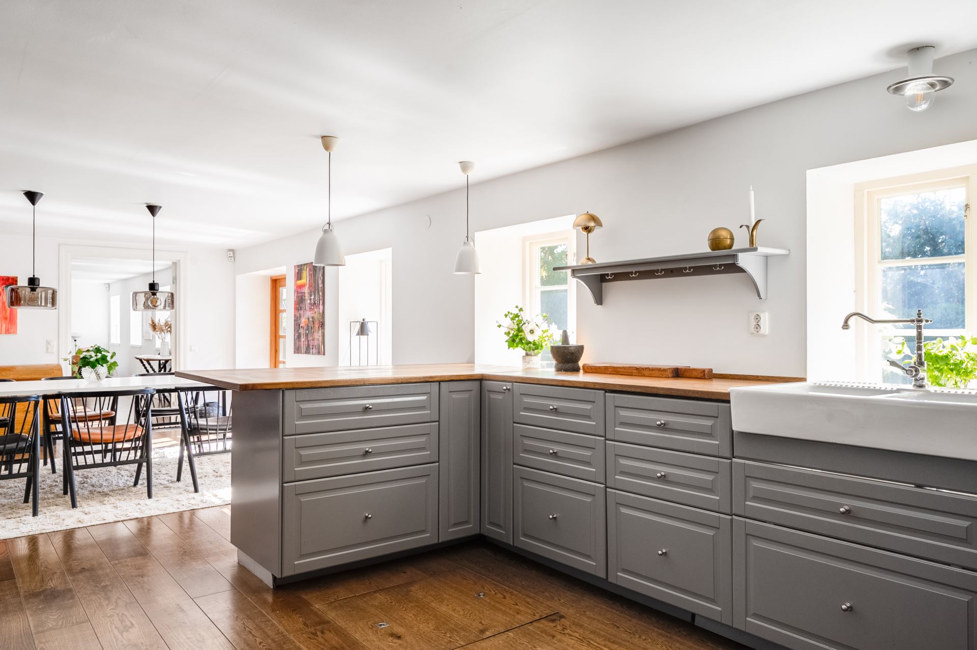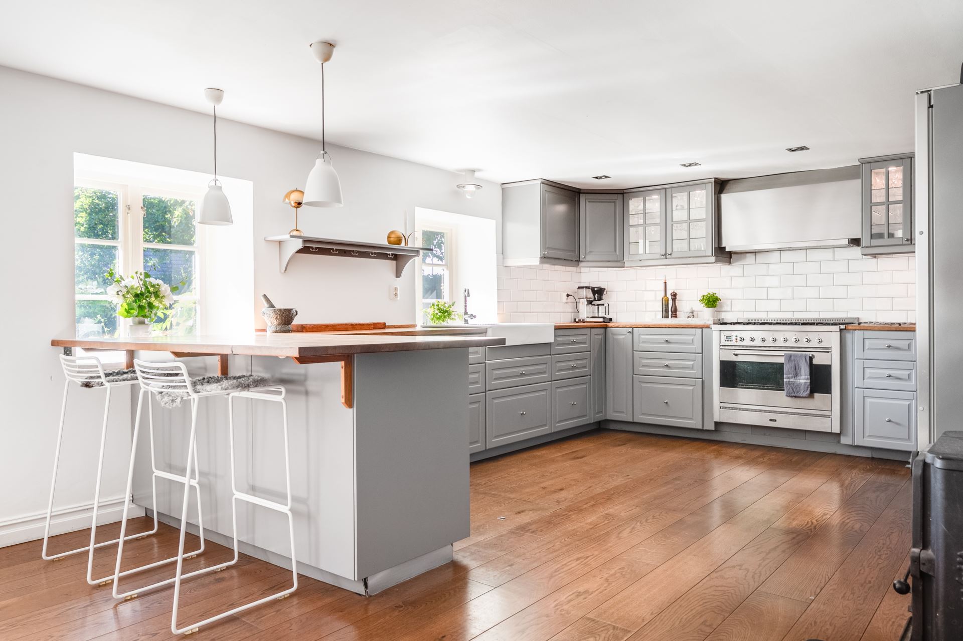 Kök: Kährs plankgolv och vita väggar. Stilrent kök med generös arbetsyta och smart förvaring bakom gråa luckor och vitrinskåp. Den hårdvaxoljade ekbänkskivan och det franska metrokaklet skapar en tidlös känsla, medan köksön med plats för två barstolar gör köket både socialt och praktiskt. Köket är utrustat med kyl och frys från Liebherr, diskmaskin, fläkt och mikrovågsugn från IKEA samt gashäll och ugn från exklusiva Ilve.