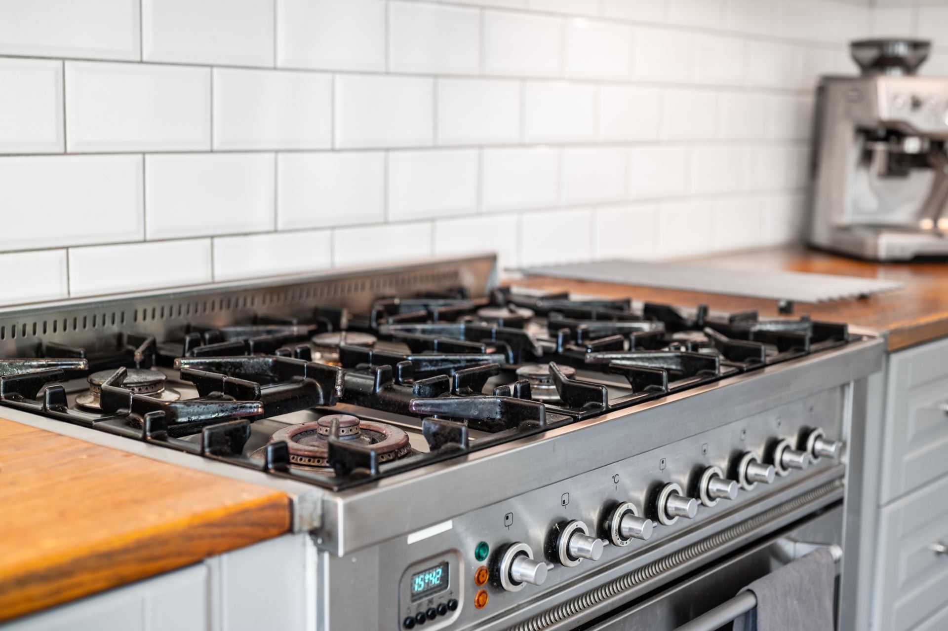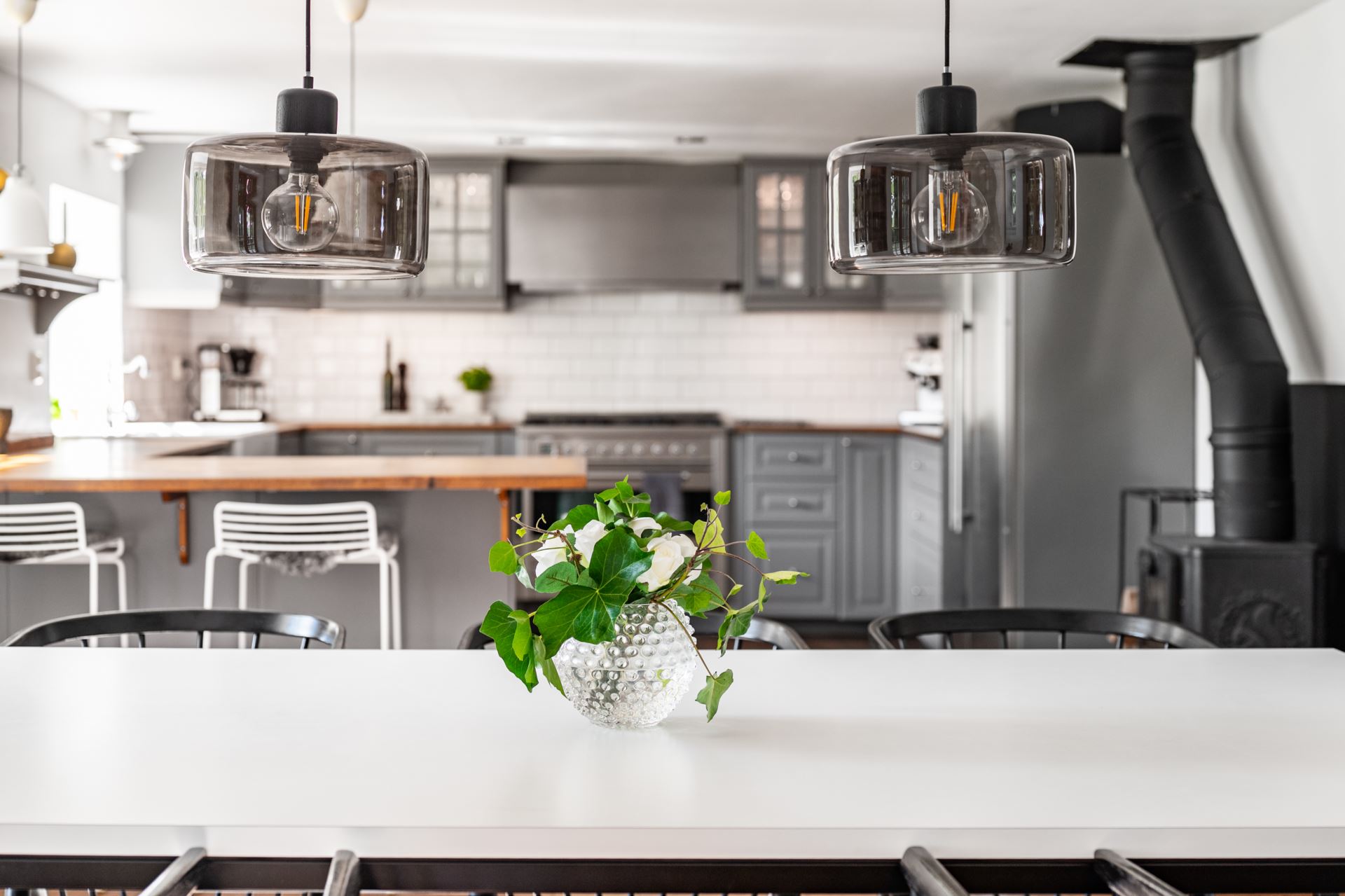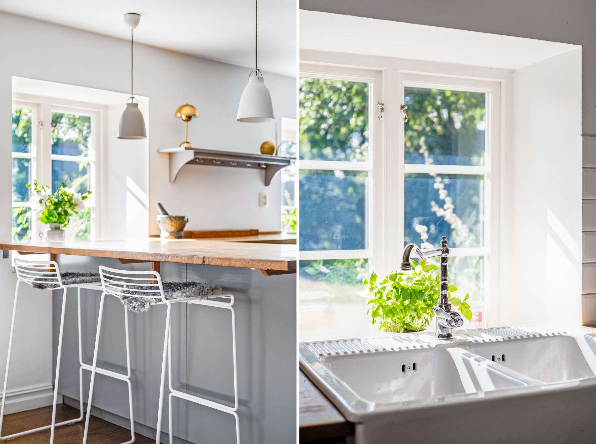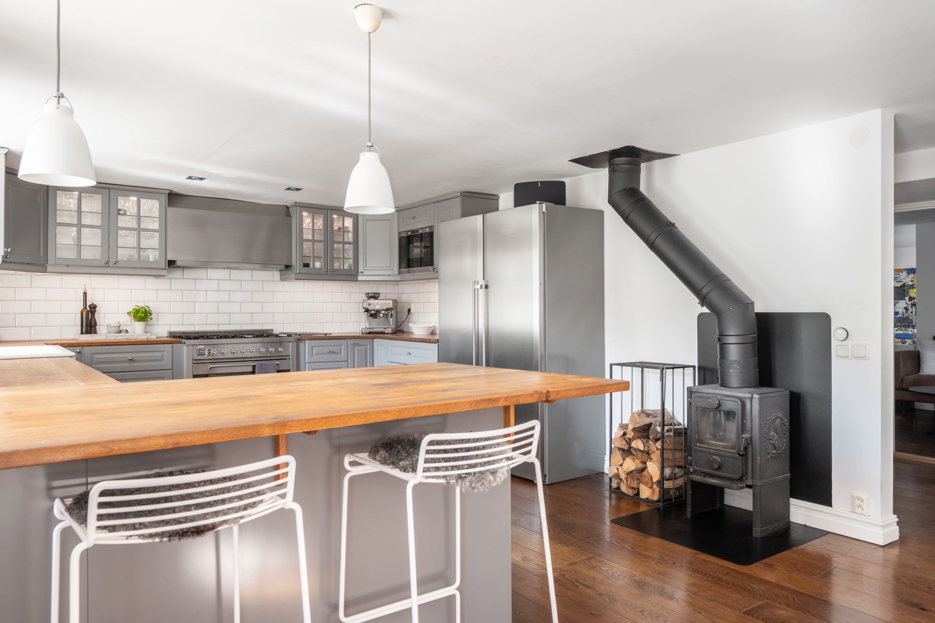 Kök: Kährs plankgolv och vita väggar. Stilrent kök med generös arbetsyta och smart förvaring bakom gråa luckor och vitrinskåp. Den hårdvaxoljade ekbänkskivan och det franska metrokaklet skapar en tidlös känsla, medan köksön med plats för två barstolar gör köket både socialt och praktiskt. Köket är utrustat med kyl och frys från Liebherr, diskmaskin, fläkt och mikrovågsugn från IKEA samt gashäll och ugn från exklusiva Ilve.