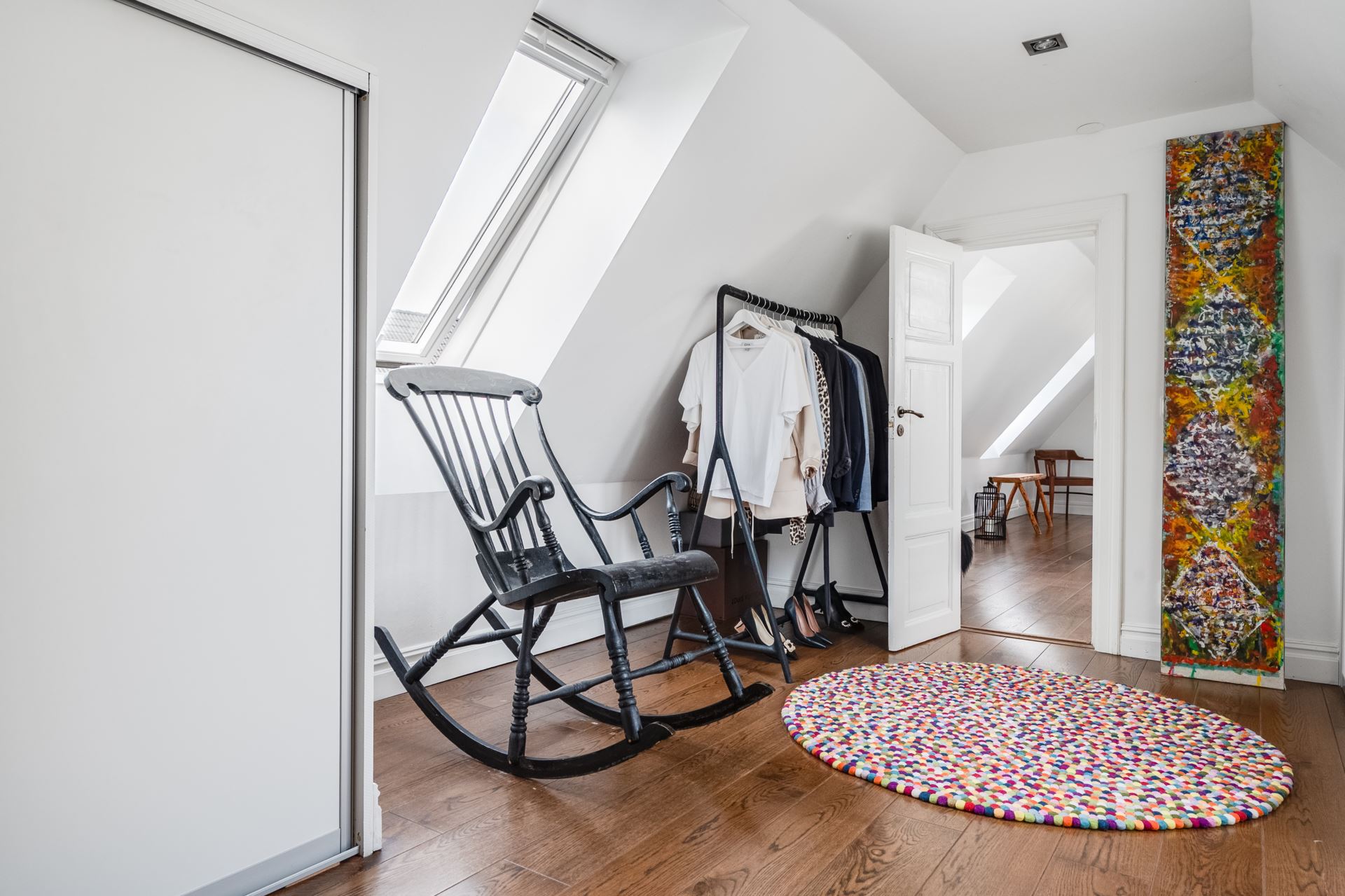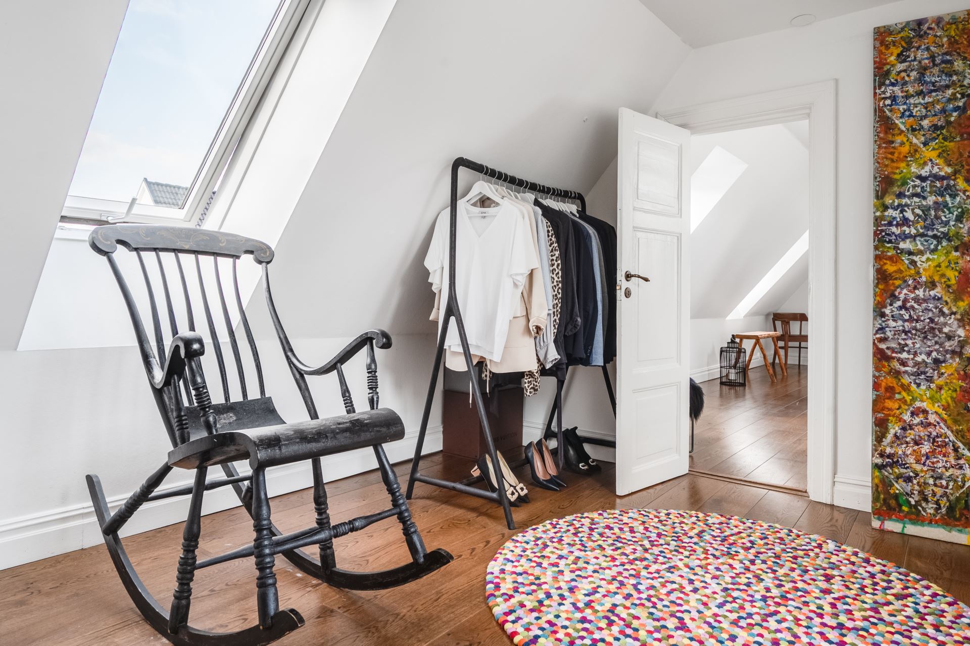 Sovrum 3: Kährs plankgolv och vita väggar. Rummet erbjuder generösa förvaringsmöjligheter med flera inbyggda garderober bakom vita skjutdörrar. Ett genomgående ljusinsläpp från två takfönster (Velux).