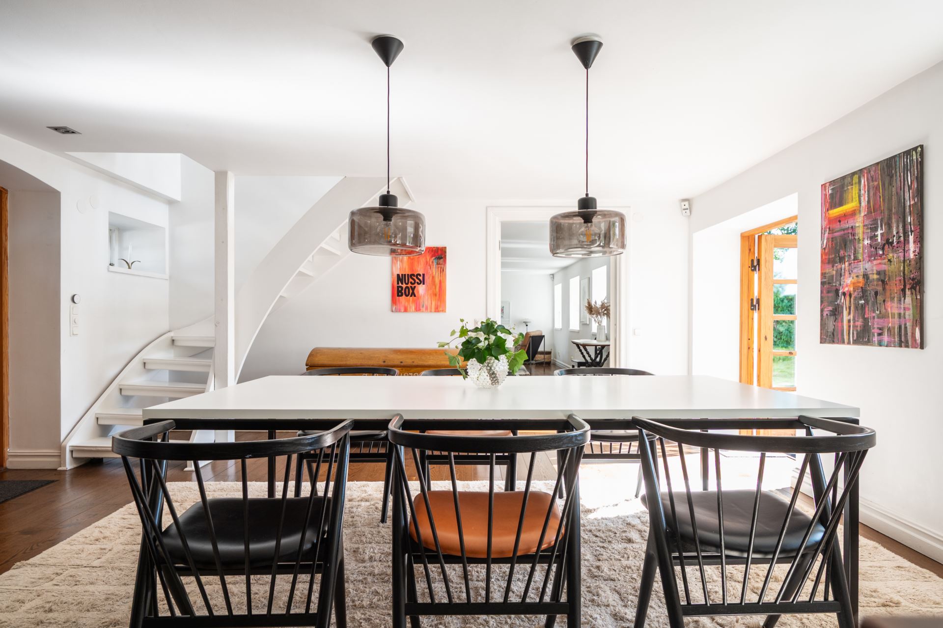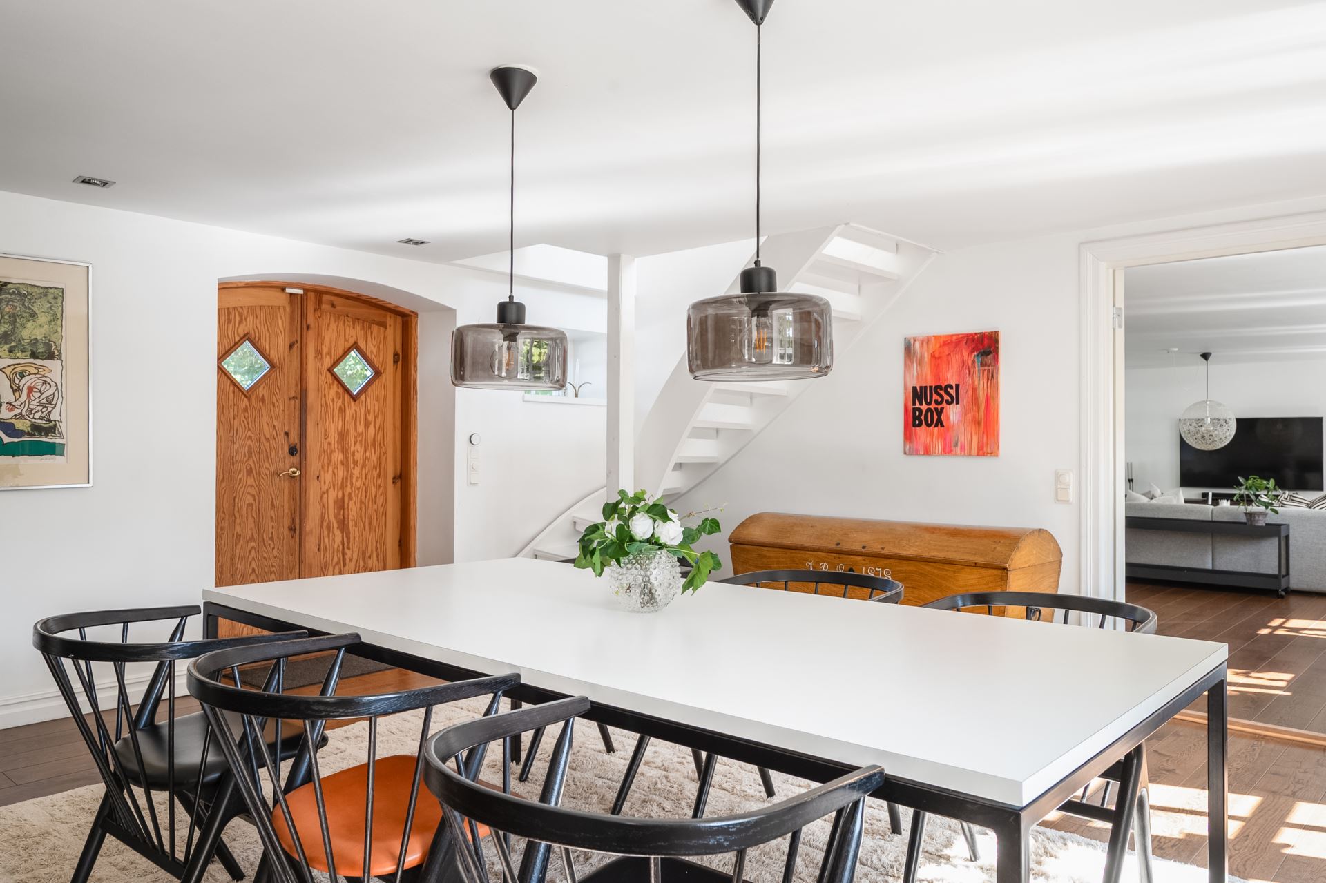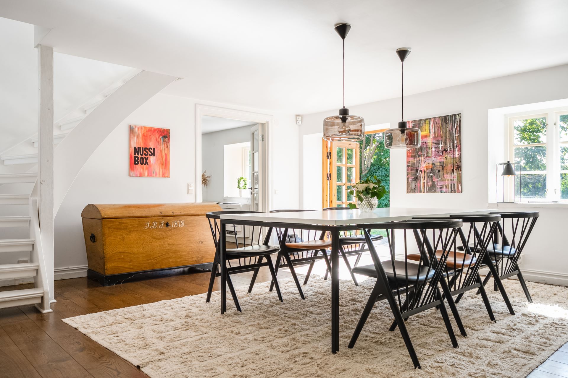 Rummet har en mysig braskamin, plats för ett gediget matbord samt fönster och altandörrar som ger ett fint ljusinsläpp. En trappa leder upp till andra våningen, och entrédörren ger smidig access till huset.