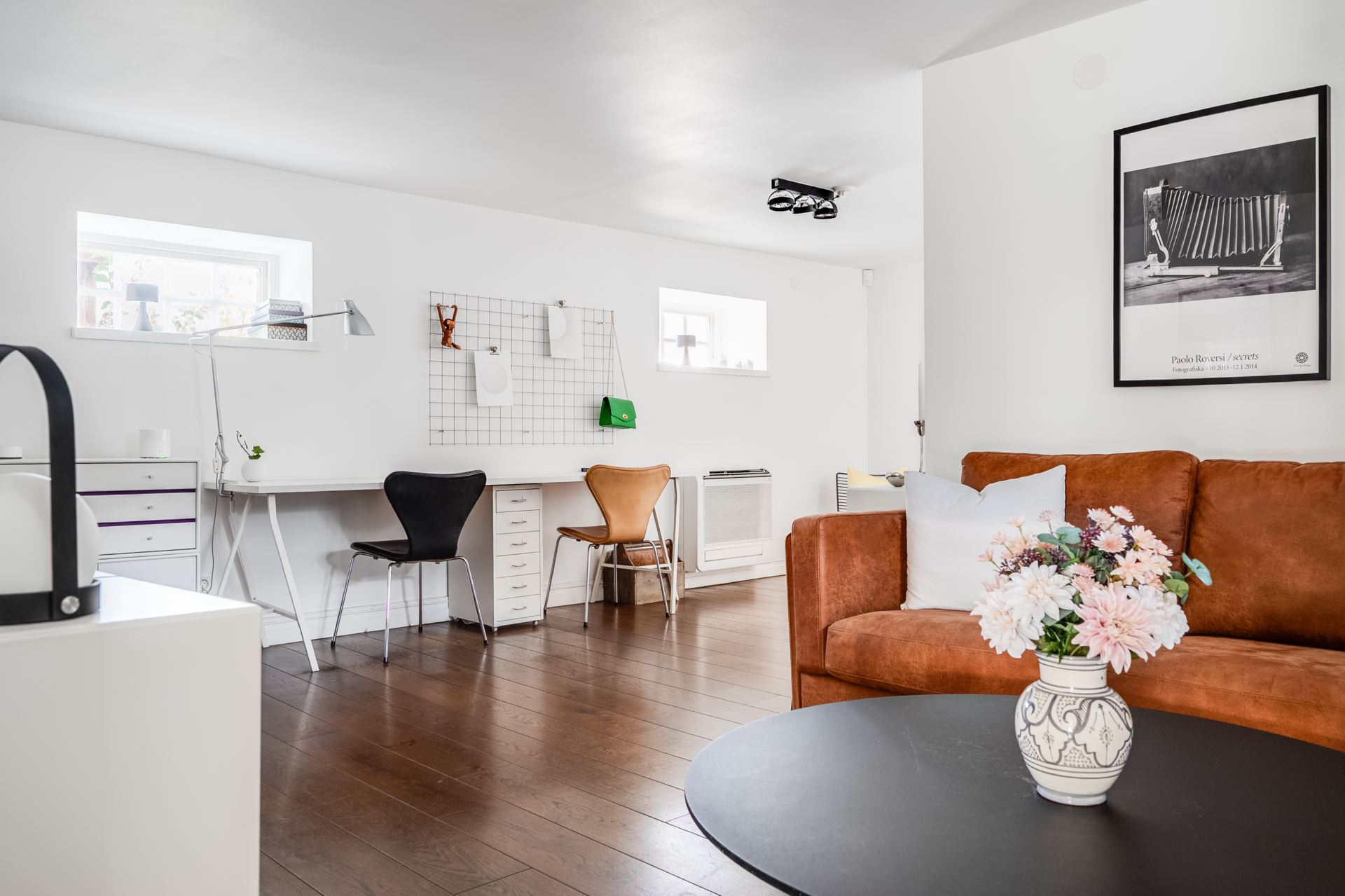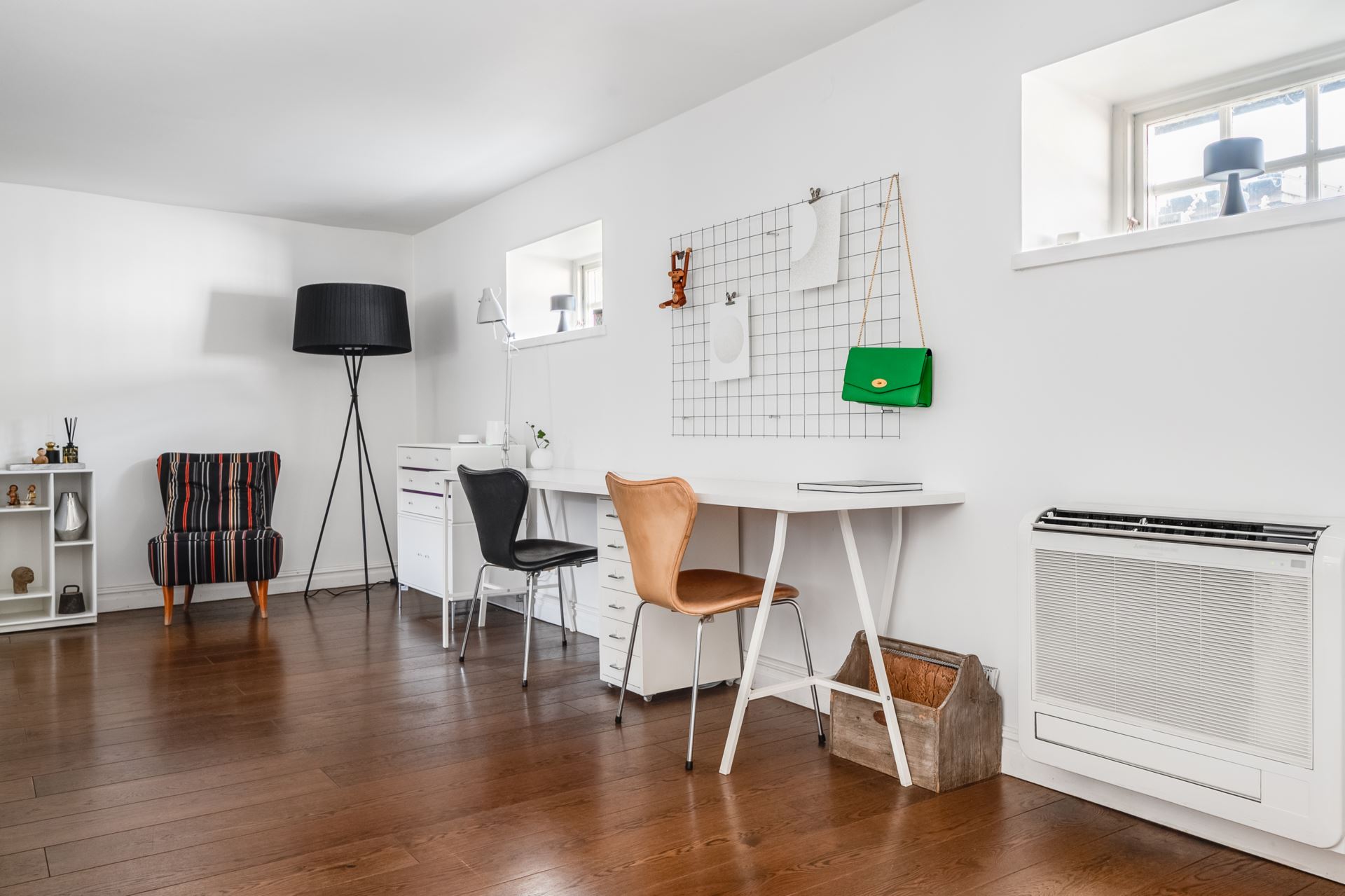 Allrum: Kährs plankgolv och vita väggar. Detta rum är mångsidigt och kan användas efter behov och önskemål.