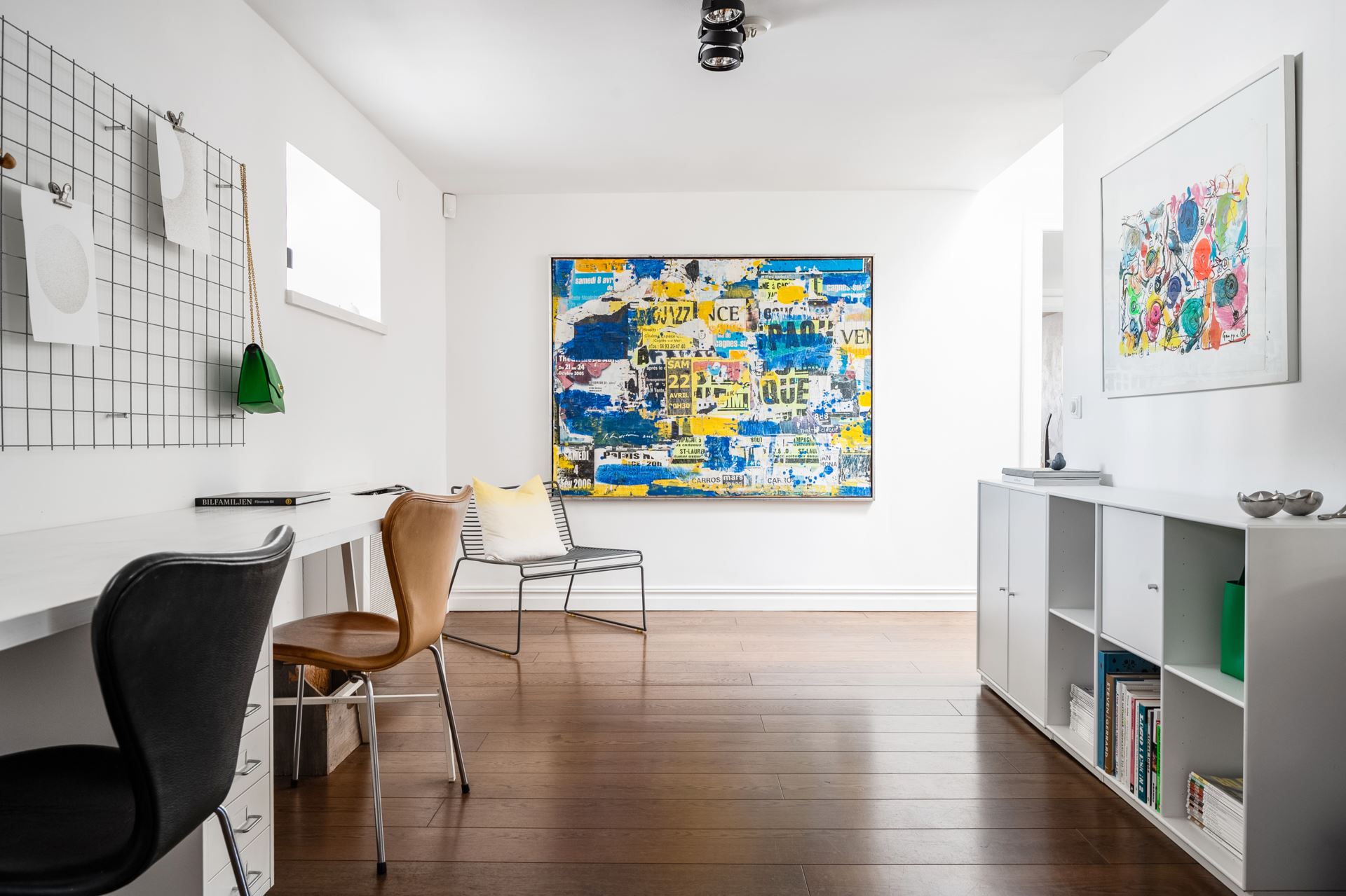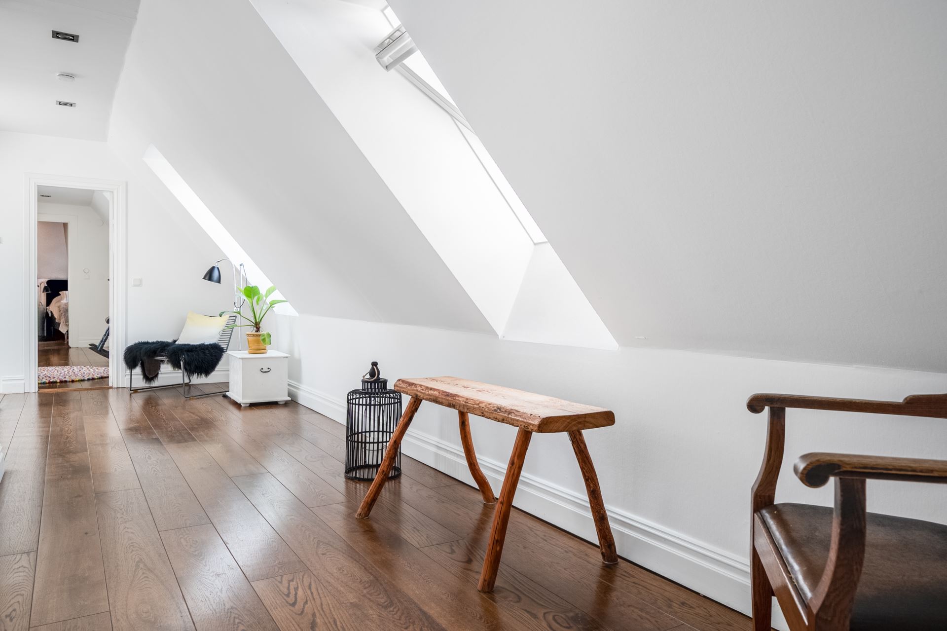 Allrum 2: Kährs plankgolv och vita väggar. Trappan från entrén på nedervåningen leder upp till detta allrum, som i sin tur ger access till sovrum 3 och 4 samt badrum 2.