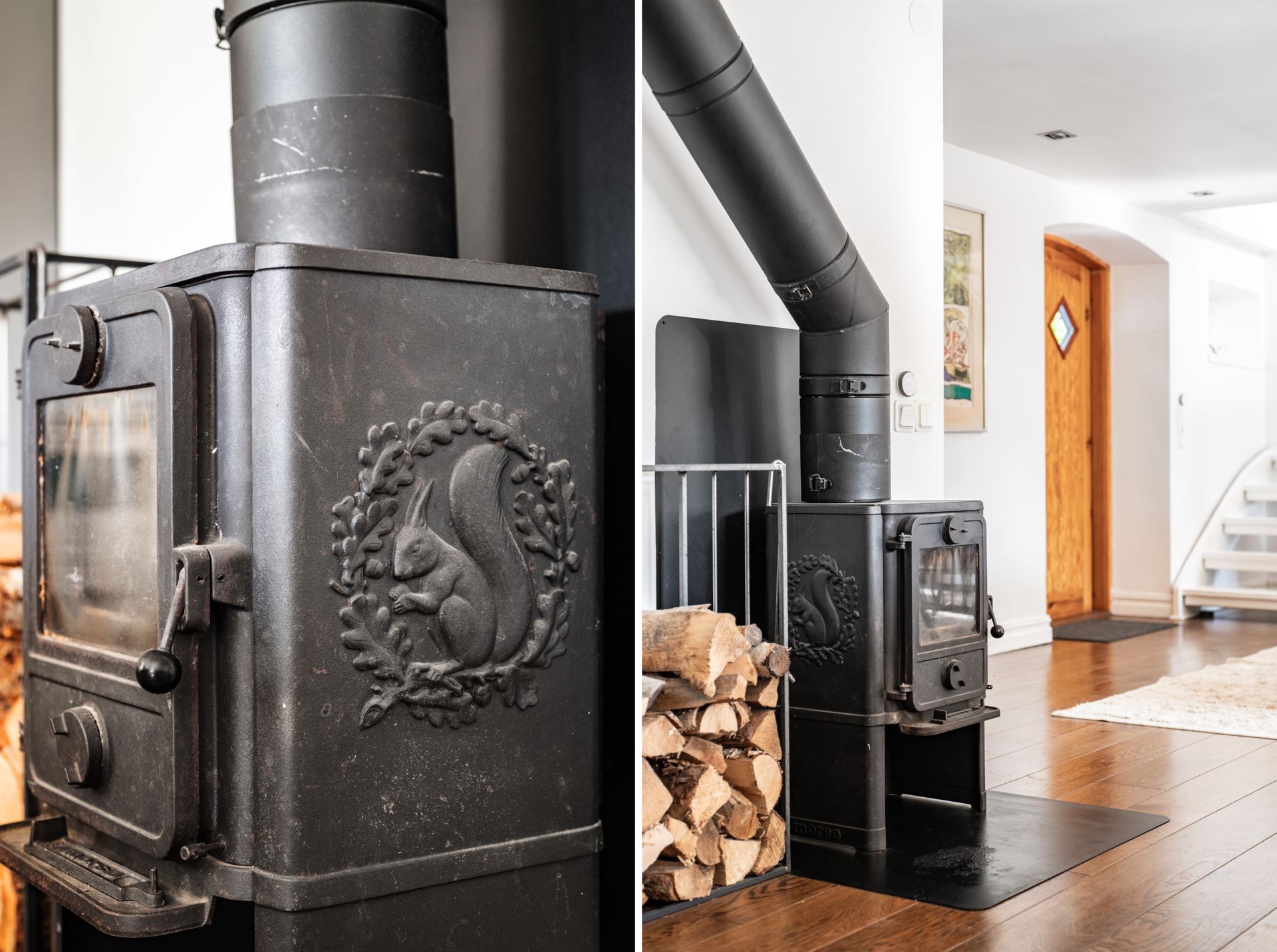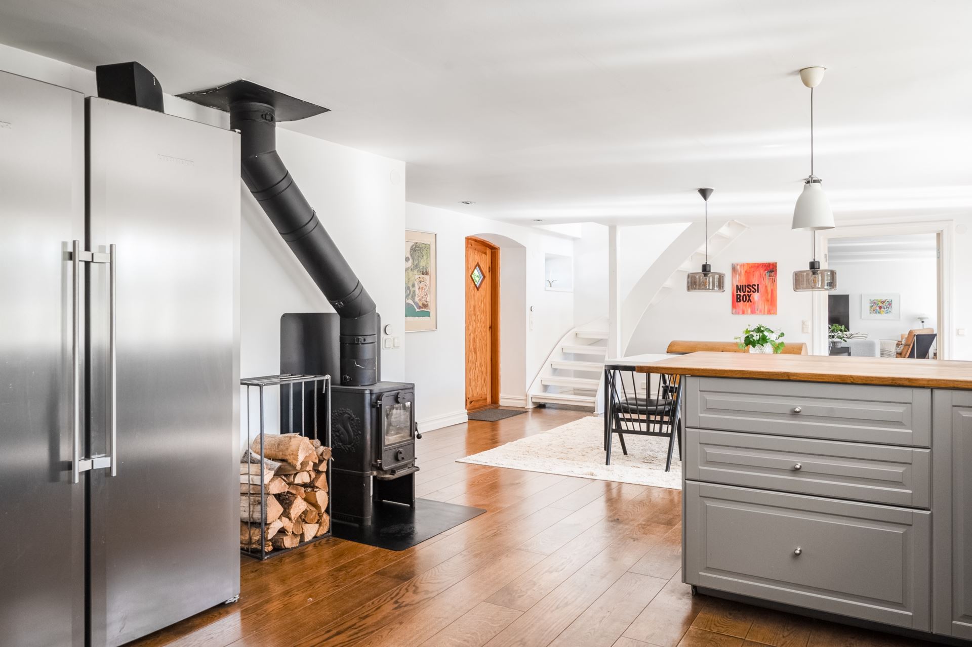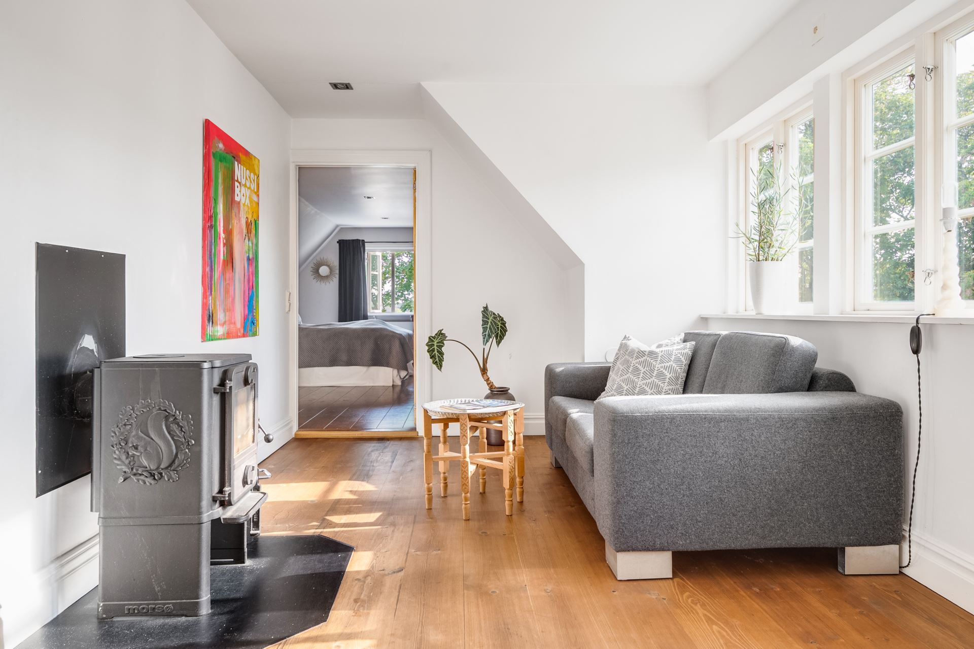 Allrum 1: Gammalt plankgolv och vita väggar. En trappa upp från kök och matplats leder till allrummet i ena vinkeln av huset. Här finns gott om plats för möblering med soffa och mer. En braskamin skapar en mysig och trivsam atmosfär.