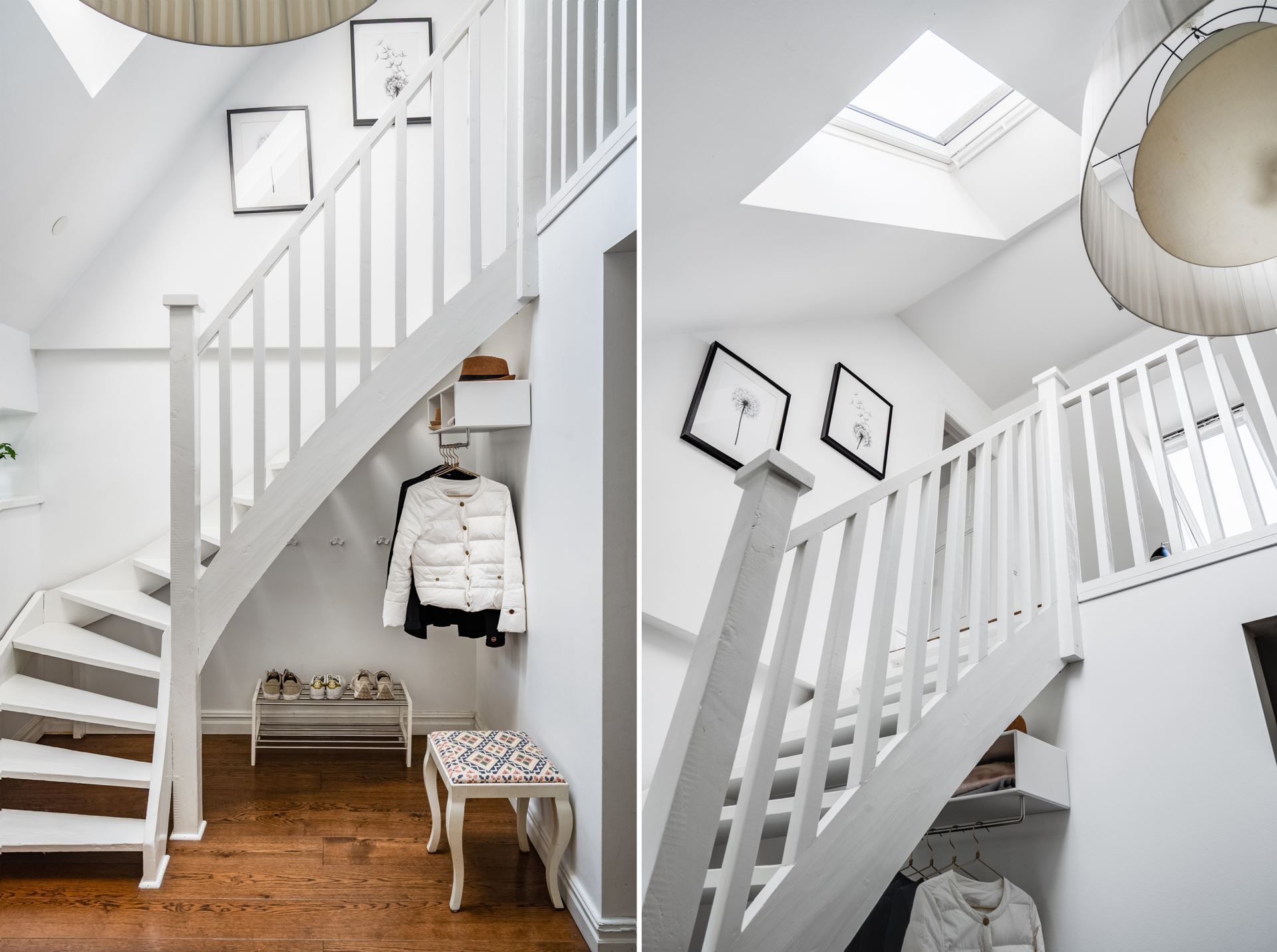 Entré/Hall: Kährs plankgolv och vita väggar. Här finns plats för ytterkläder, skor och förvaringsmöbler om så önskas. Öppet upp till nock och ljusinsläpp genom takfönster (Velux) skapar en luftig känsla. En trappa leder upp till husets andra våning.