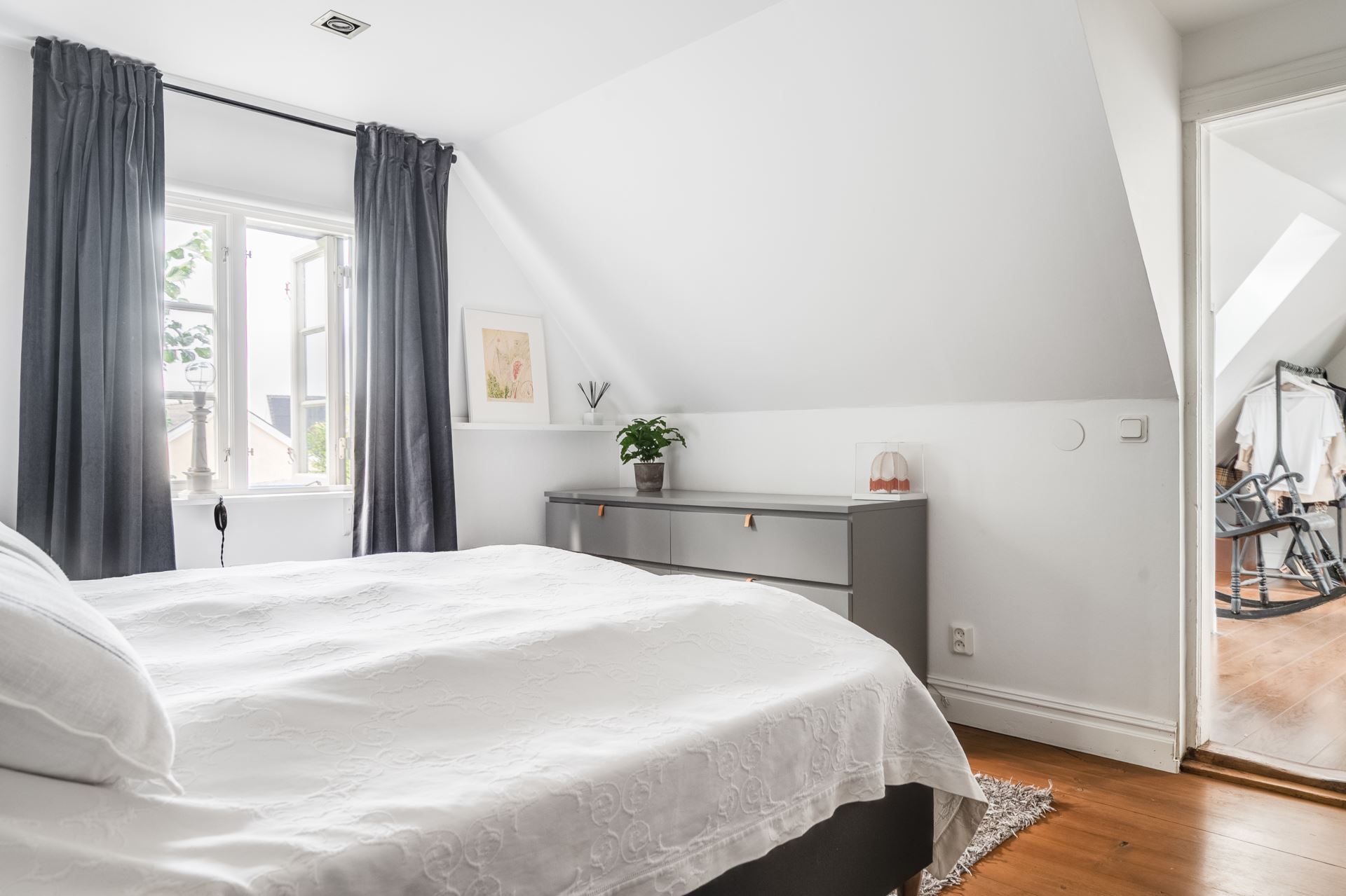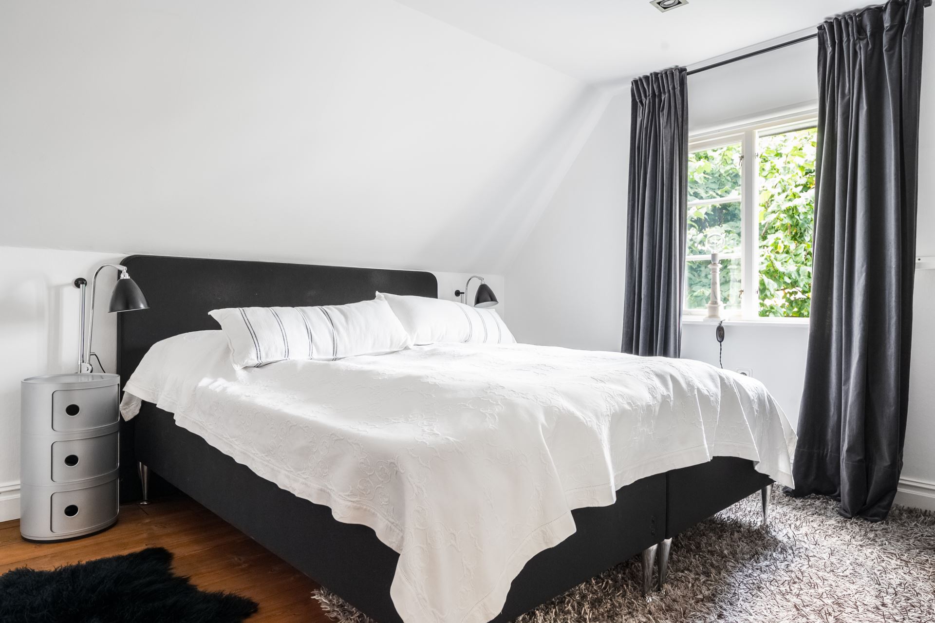 Sovrum 1: Kährs plankgolv och ljusa väggar. Huvudsovrummet ligger i ena gaveln av huset och erbjuder gott om plats för en dubbelsäng och tillhörande möblemang. I anslutning till rummet finns en rymlig klädkammare.
