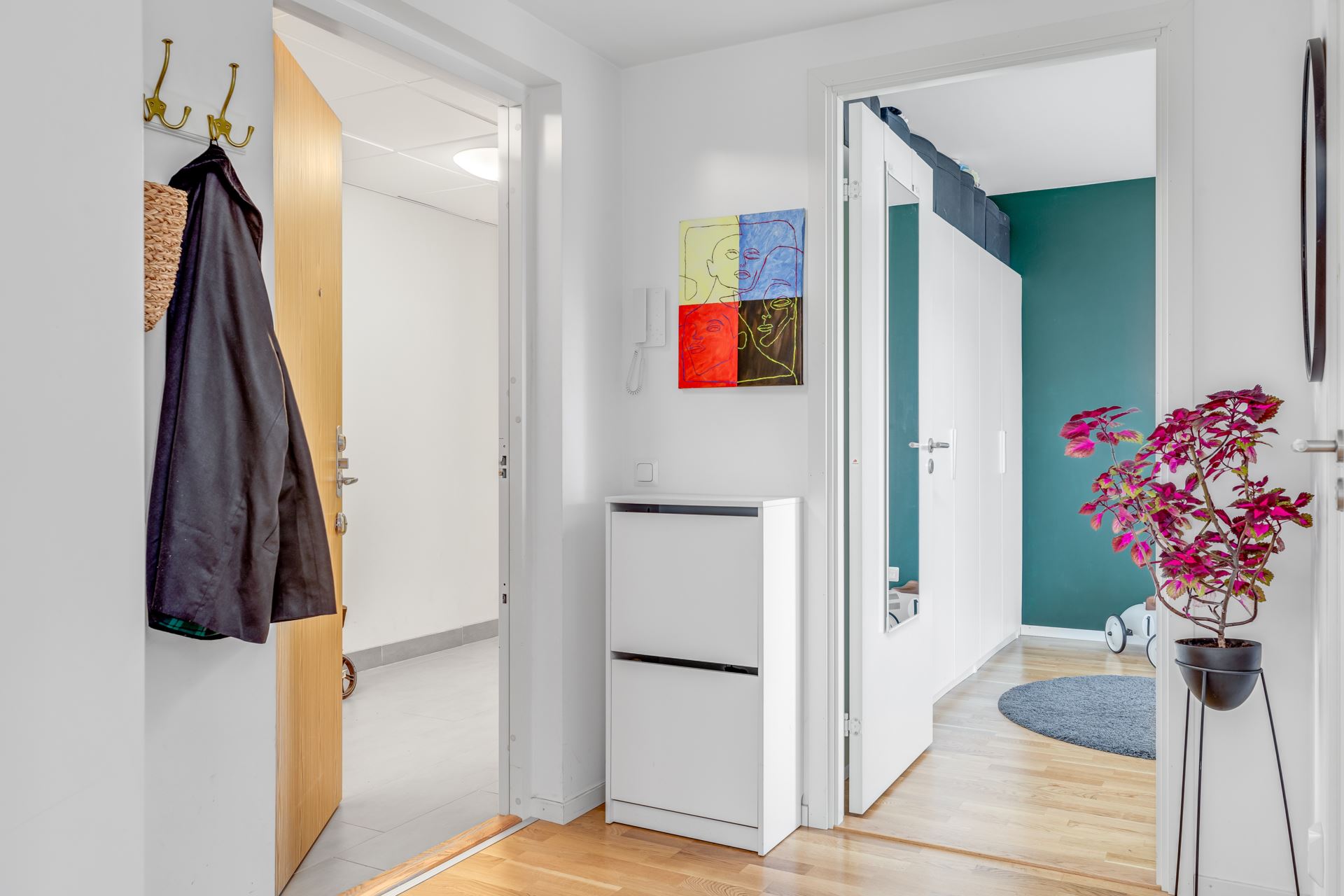 En halv trappa upp välkomnas vi in i hallen som bjuder på avhängningsmöjligheter direkt på vänster sida. Vidare finns plats till ytterligare förvaring i garderober. Trestavig ekparkett vilar på golvet och är enhetligt genomgående för hela lägenheten.