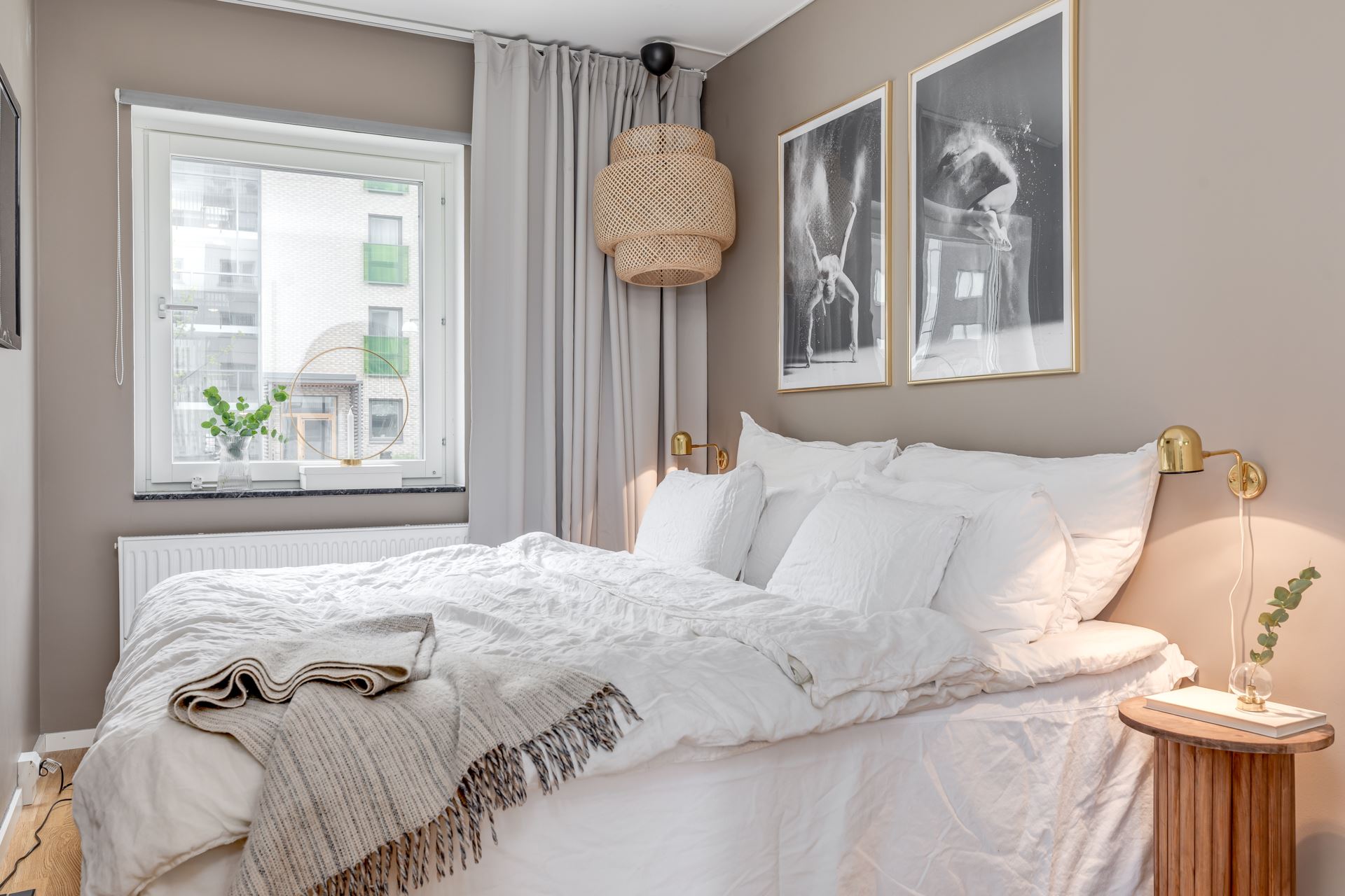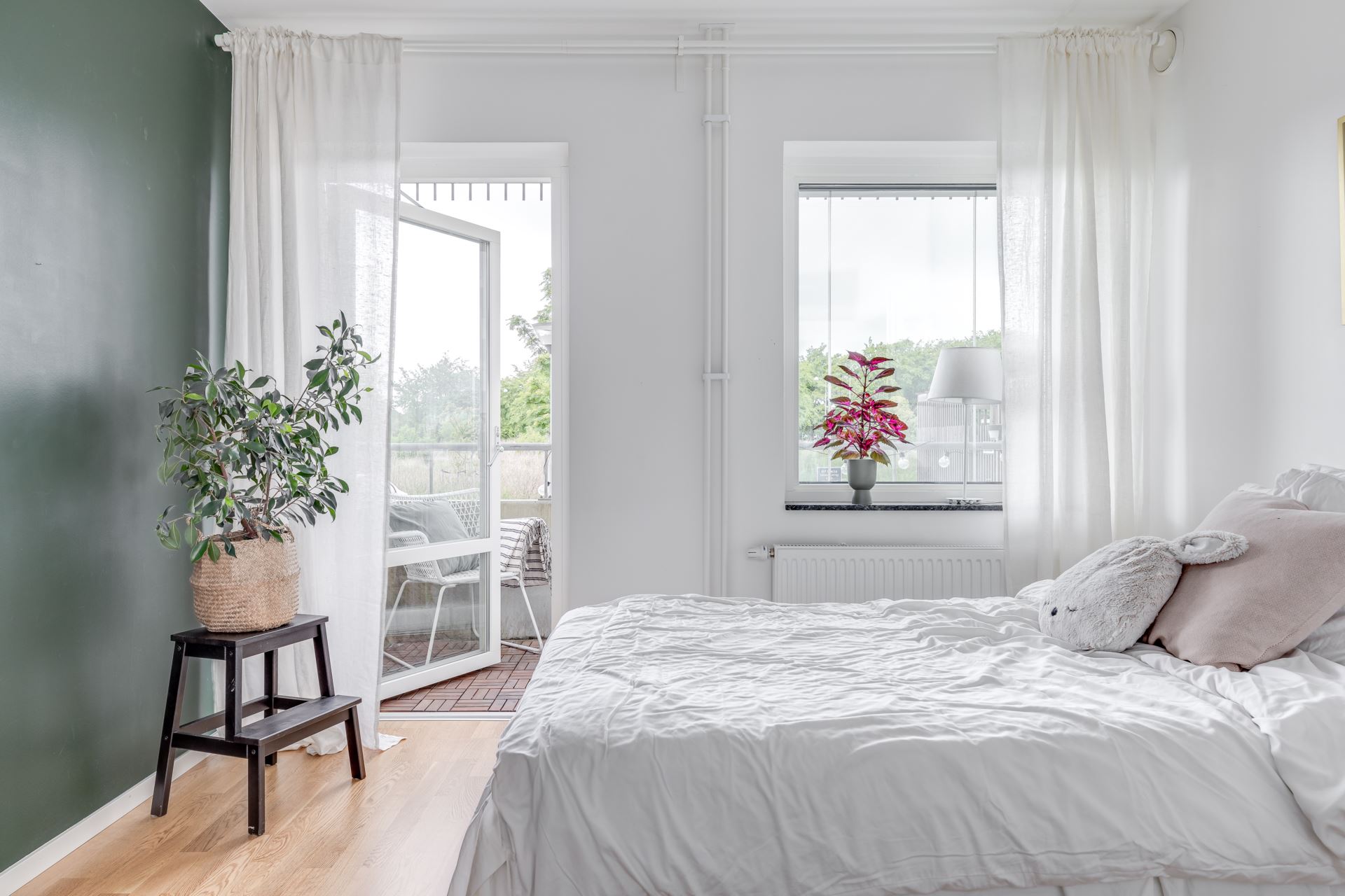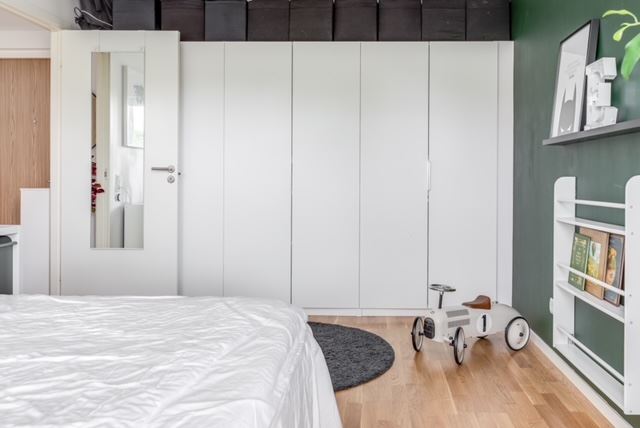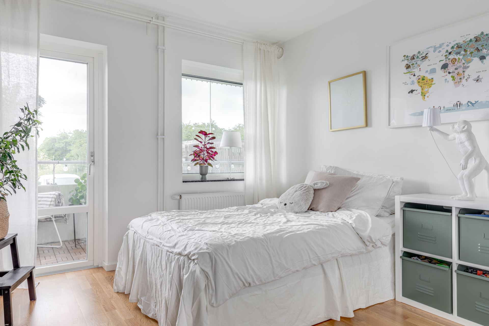 Vägg i vägg med köket finner vi ett av lägenhetens två sovrum. Här finns gott om plats för säng, sängbord och mer därtill. Ytterligare plats till förvaringsmöbel.