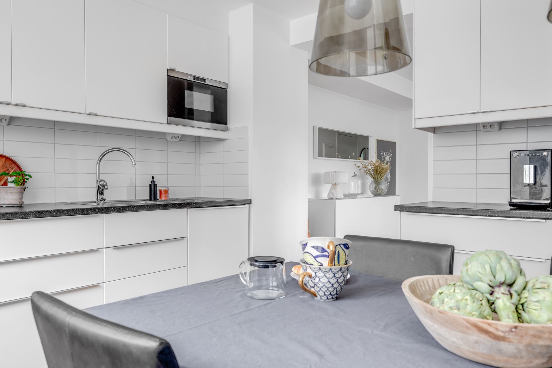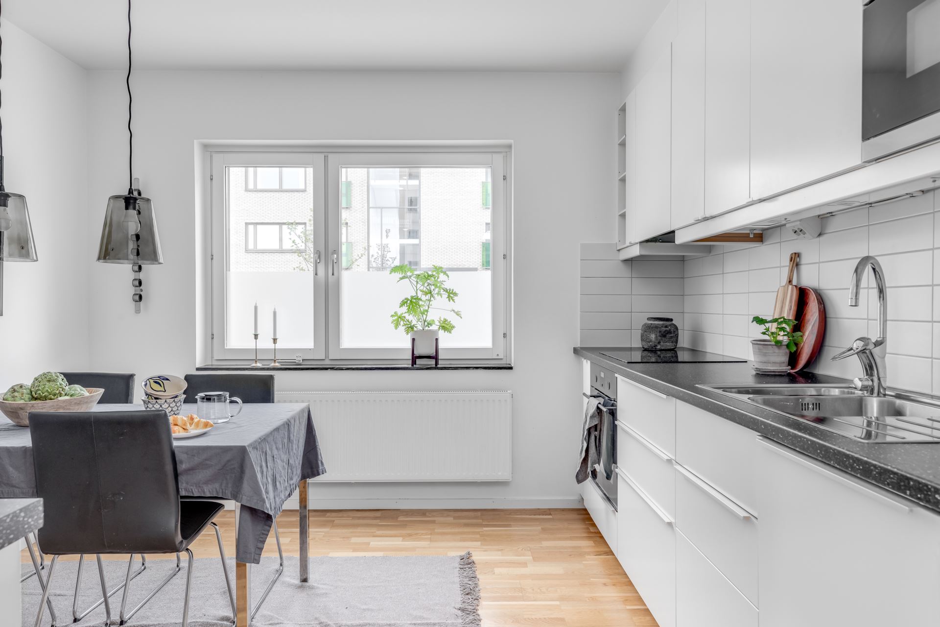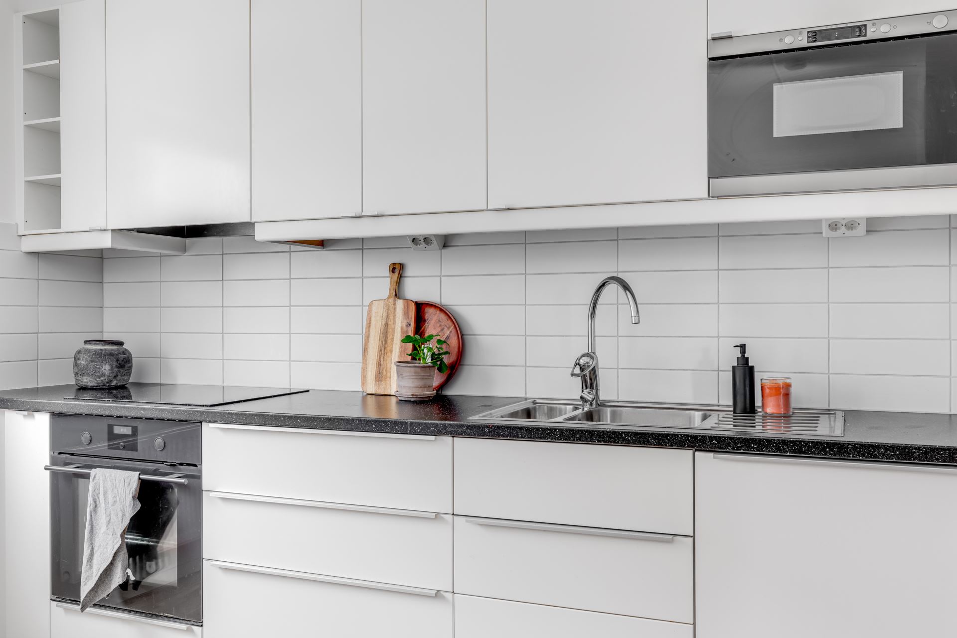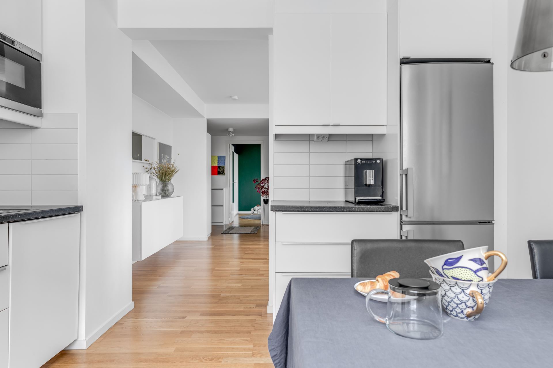 Kök och vardagsrum sammanflätas på ypperligt vis och här finns utmärkta förvaringsmöjligheter i skåp och lådor samt goda arbetsytor. Här kombineras smakfullt vita köksluckor tillsammans med vitt kakel och bänkskiva i laminat. Här finns gott om plats för större matbord. Köket är utrustat med kyl och frys, spishäll, ugn, diskmaskin och köksfläkt.