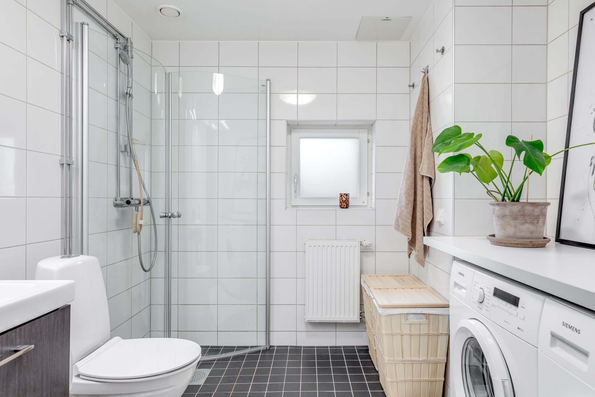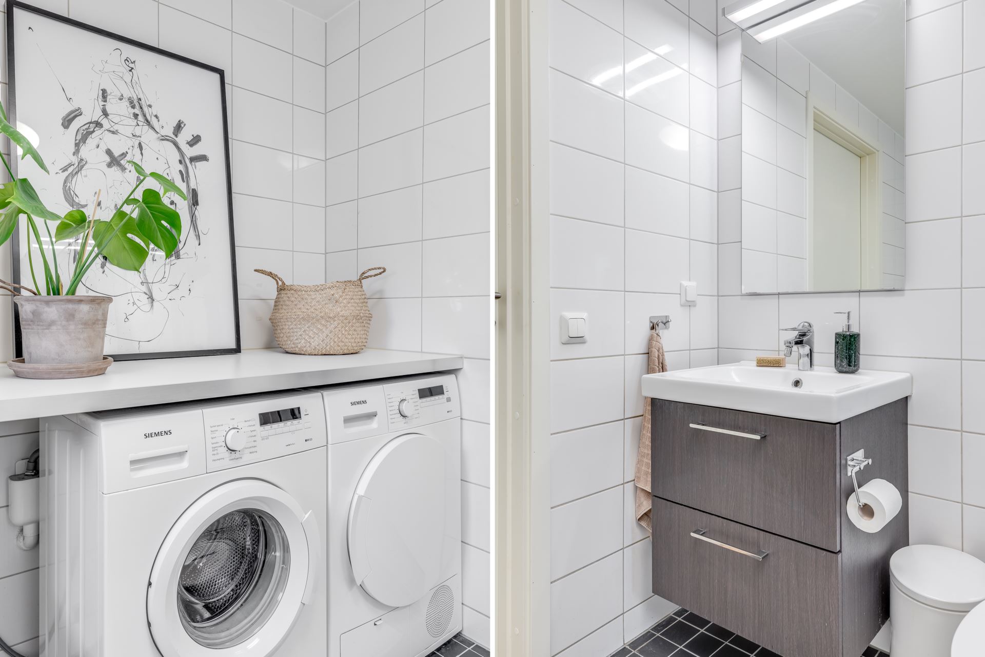 Rakt framifrån hallen finns det helkaklade badrummet. Vitt kakel på väggarna kombineras med mörkare klinkers på golv. Badrummet är utrustat med dusch bakom glasvägg, handfat med kommod, wc, spegel, tvättmaskin och torktumlare (Siemens) samt arbetsbänk ovan. Fönstret i badrummet skänker trevligt ljusinsläpp!