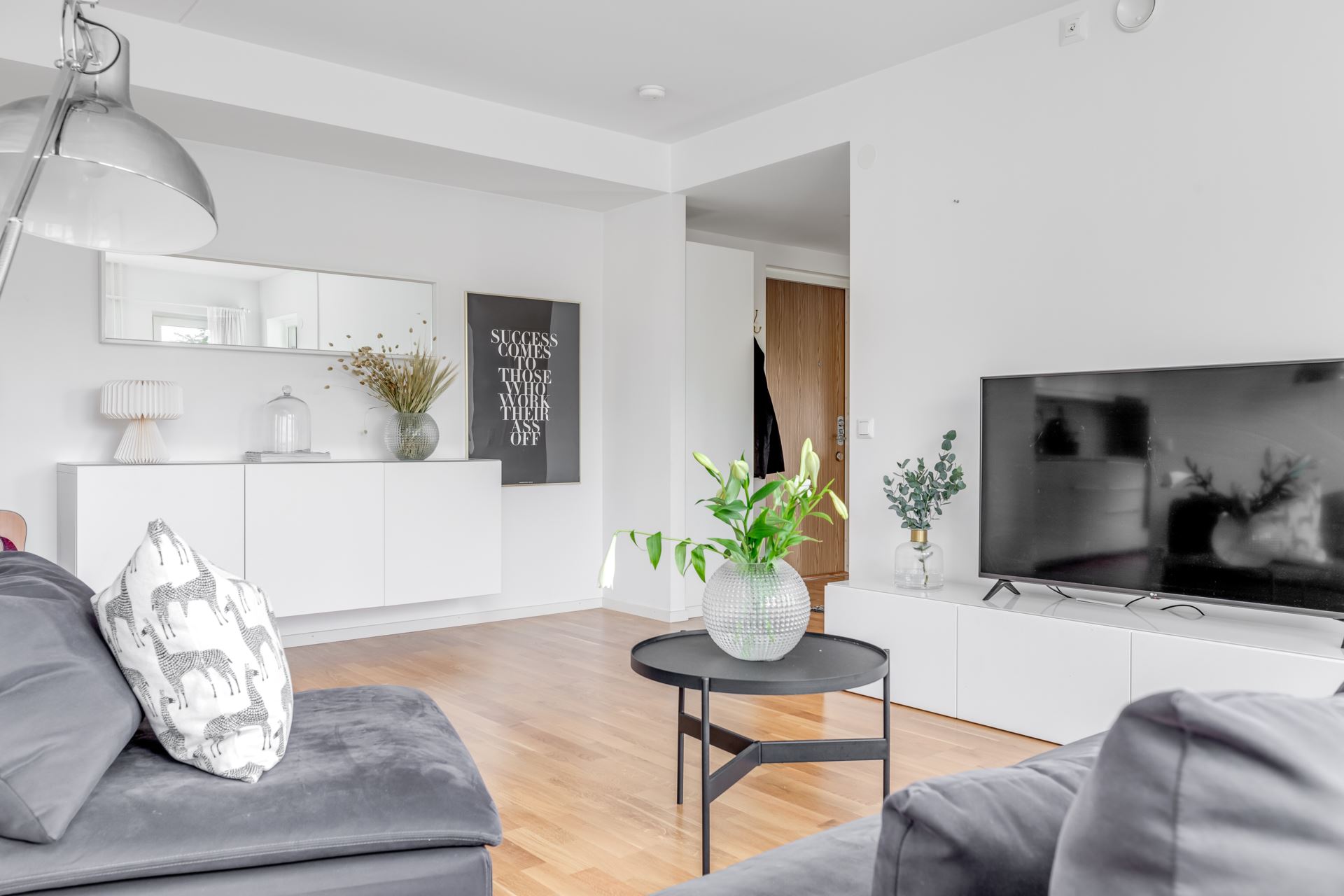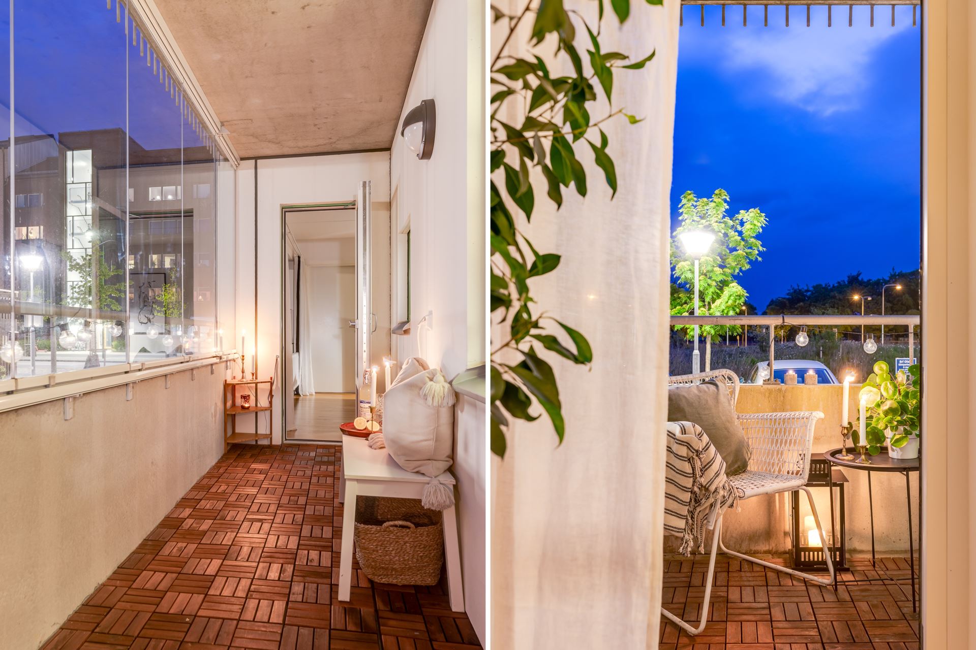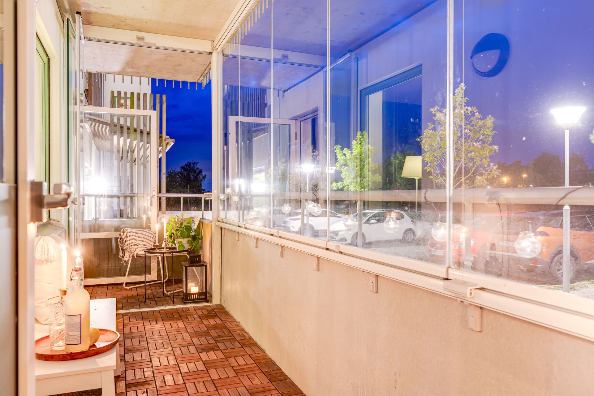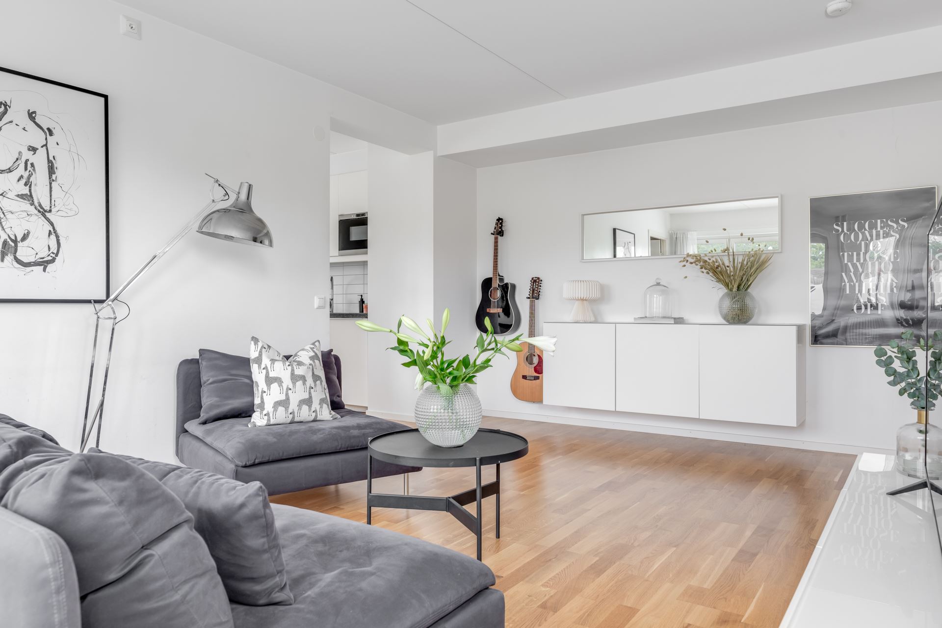 Vidare öppnar vardagsrummet upp och här ryms plats för större soffgrupp och ytterligare möblering. Från vardagsrummet finns även utgången till den inglasade balkongen som bjuder på kvällssol och där kommande sommarkvällar kan avnjutas på bästa vis!