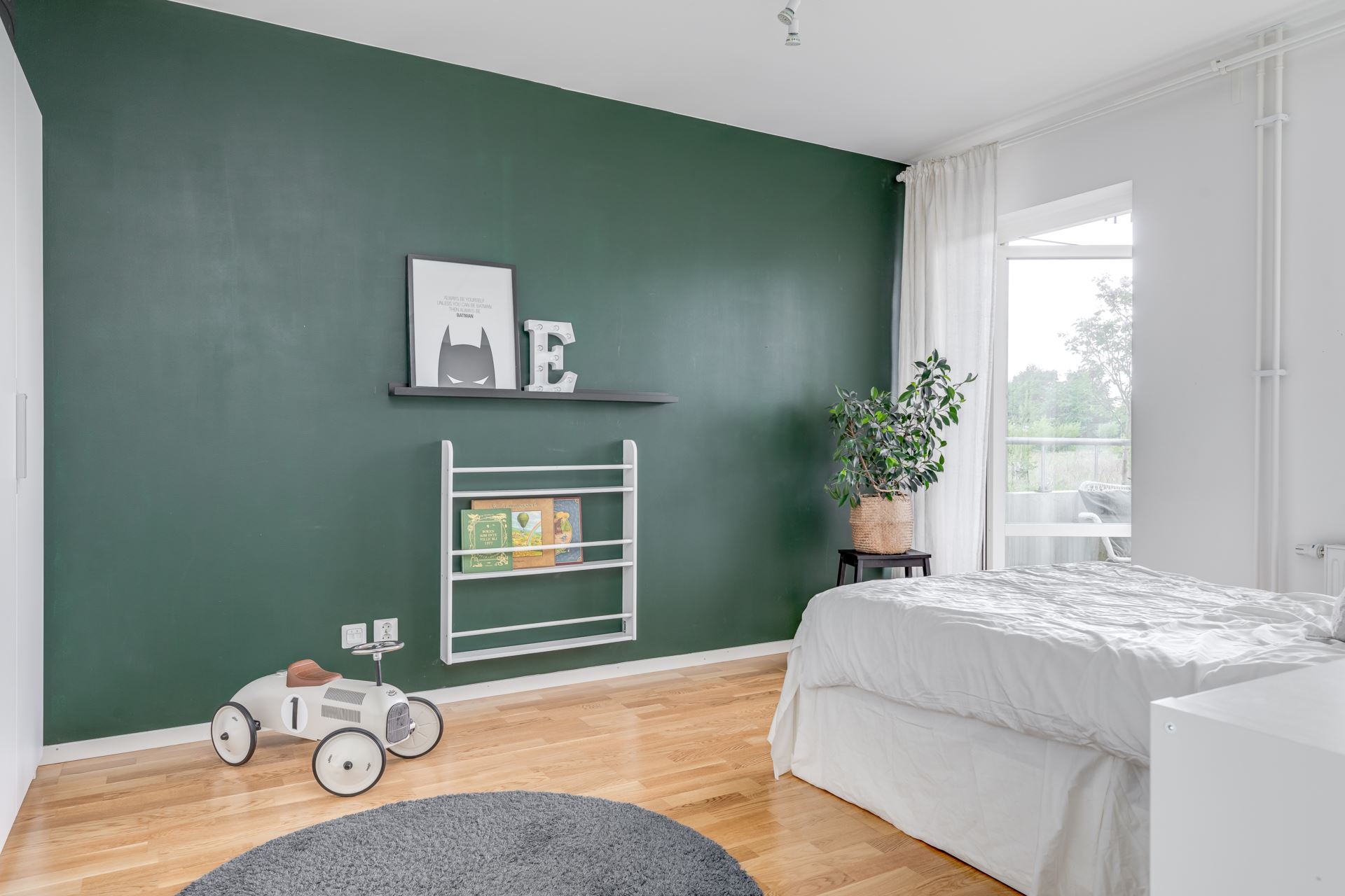 Från hallen nås det större sovrummet som är av generösa kvadratmeter och rymmer gott om plats för större säng, sängbord och mer därtill. Ytterligare förvaring finns i garderober längst med ena väggen. Mörkgrön fondvägg kombineras på ytterst smakfullt vis mot ekparkett på golv. Här ifrån når vi även utgången till den öppna balkongen som finns i anslutning till den inglasade balkongdelen.