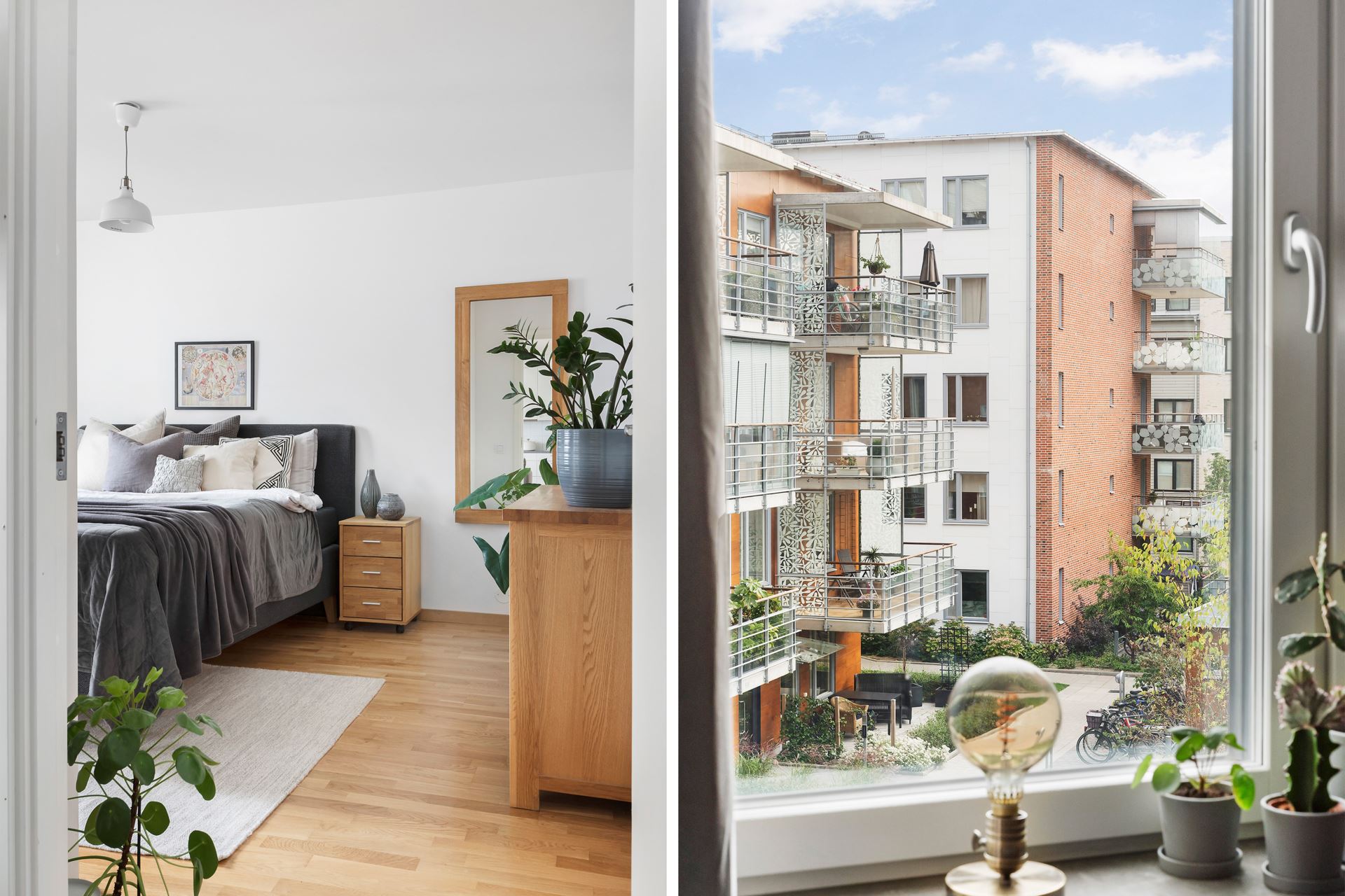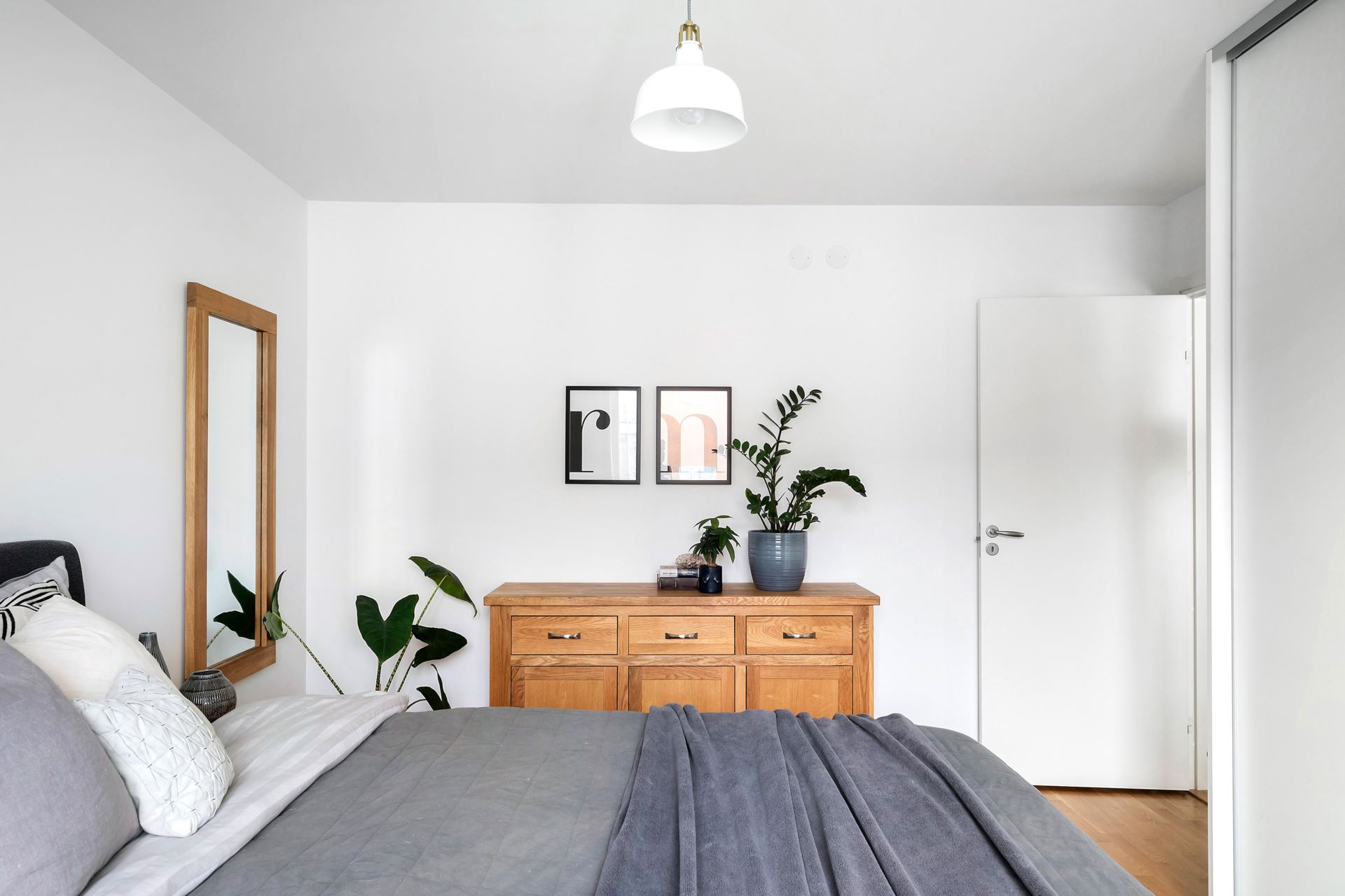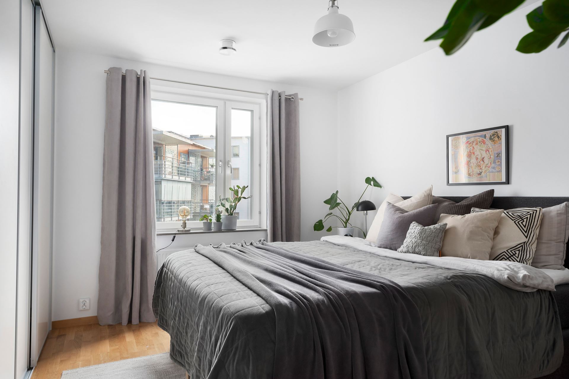 Sovrummet som vetter mot innergården, är väl tilltaget med gott om plats för både dubbelsäng, sängbord och byrå. En hel garderobsvägg med skjutdörrar tar hand om klädförvaringen, praktiskt och välplanerat.