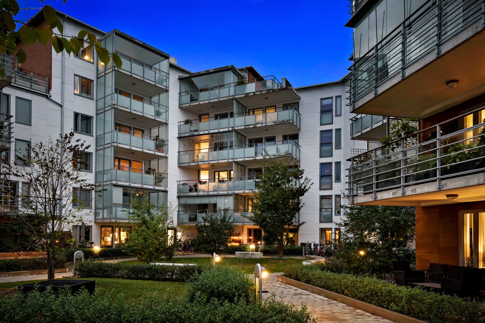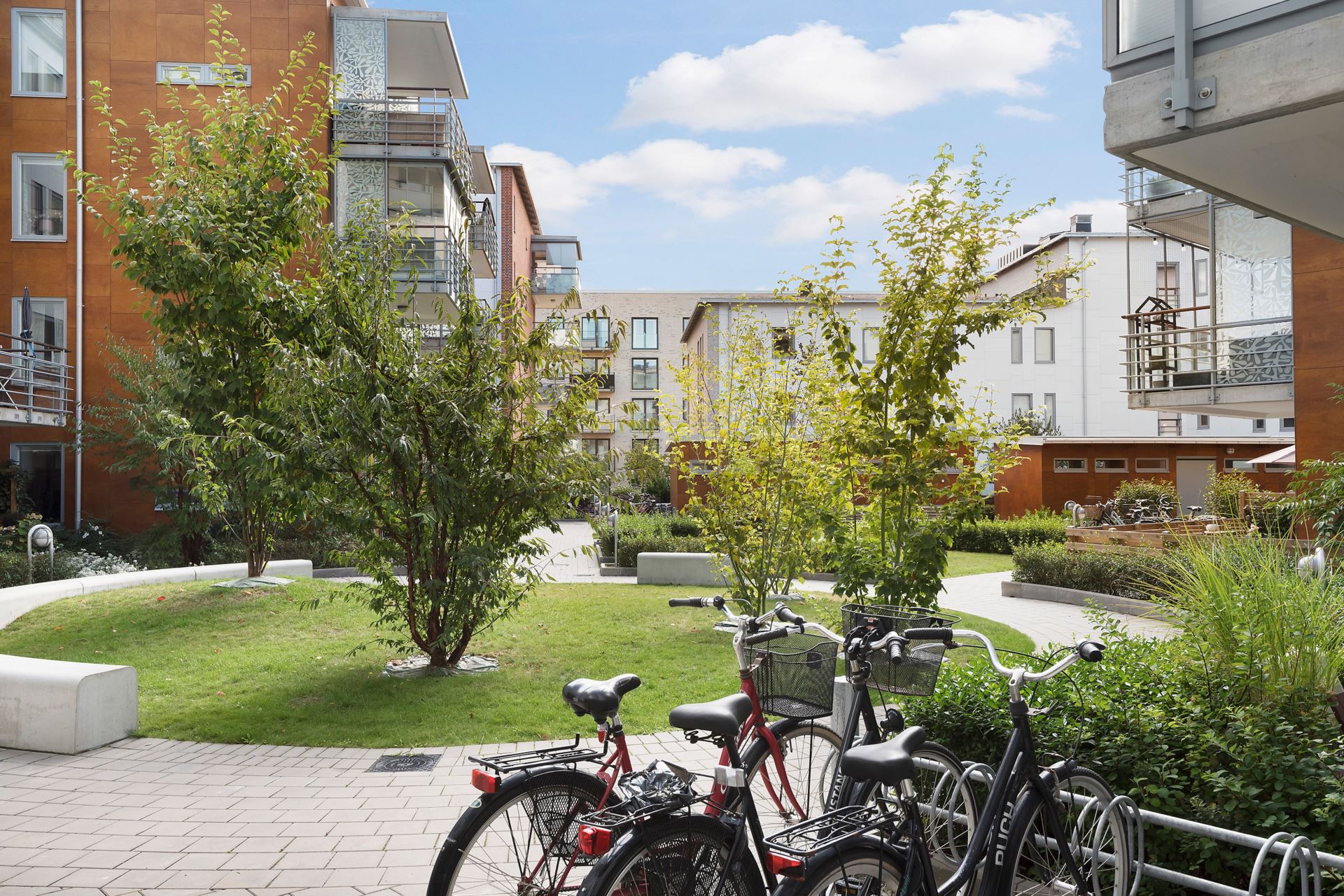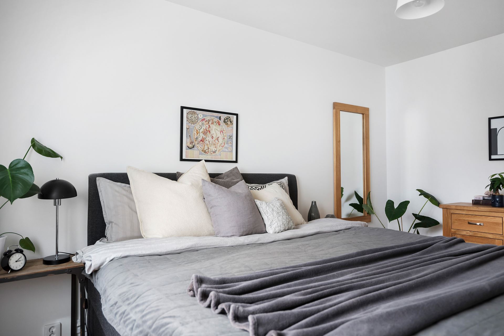 Sovrummet som vetter mot innergården, är väl tilltaget med gott om plats för både dubbelsäng, sängbord och byrå. En hel garderobsvägg med skjutdörrar tar hand om klädförvaringen, praktiskt och välplanerat.