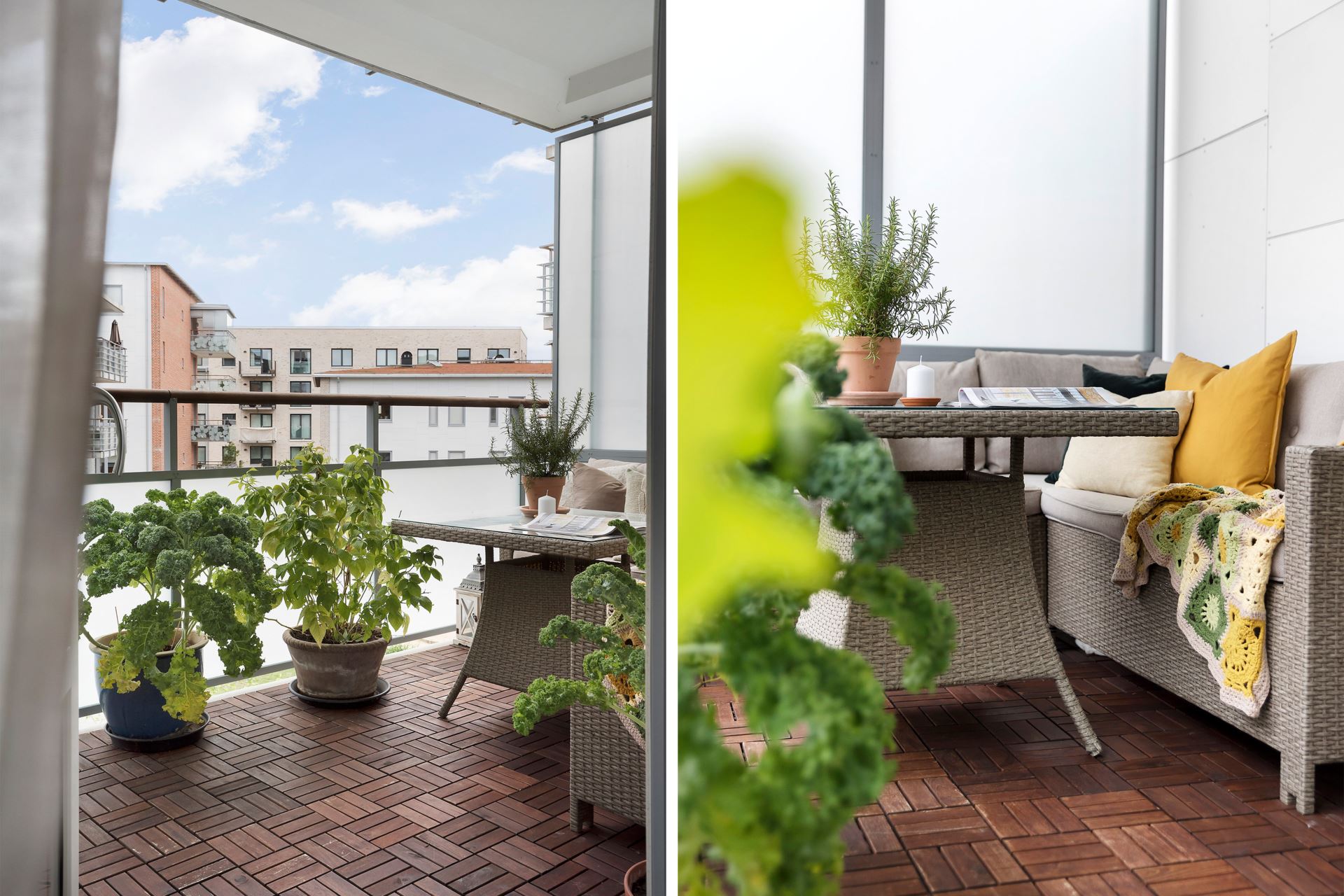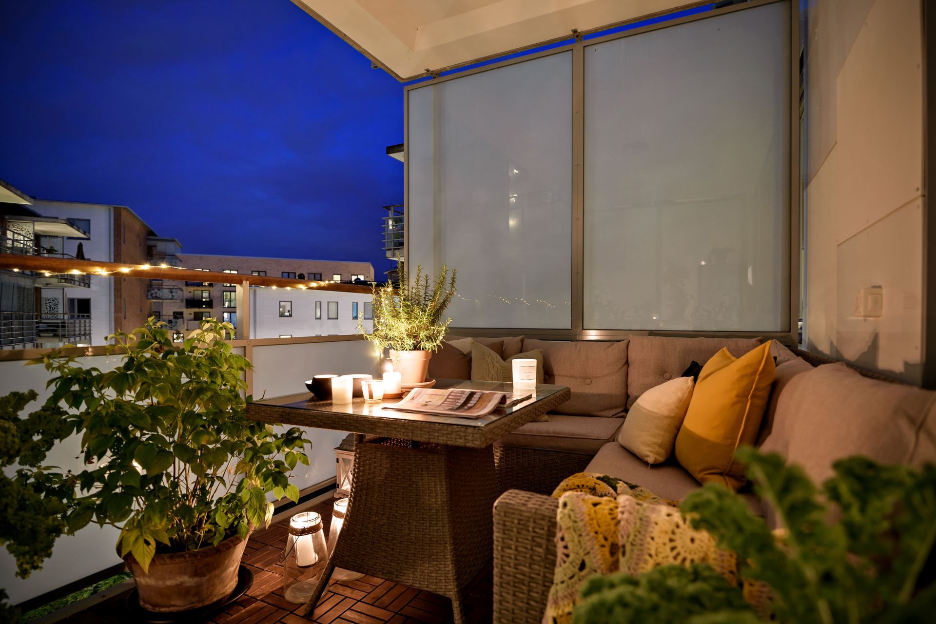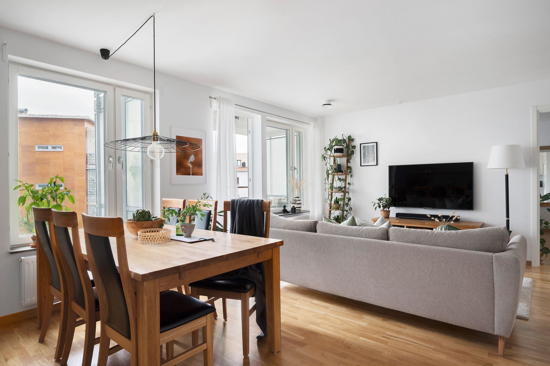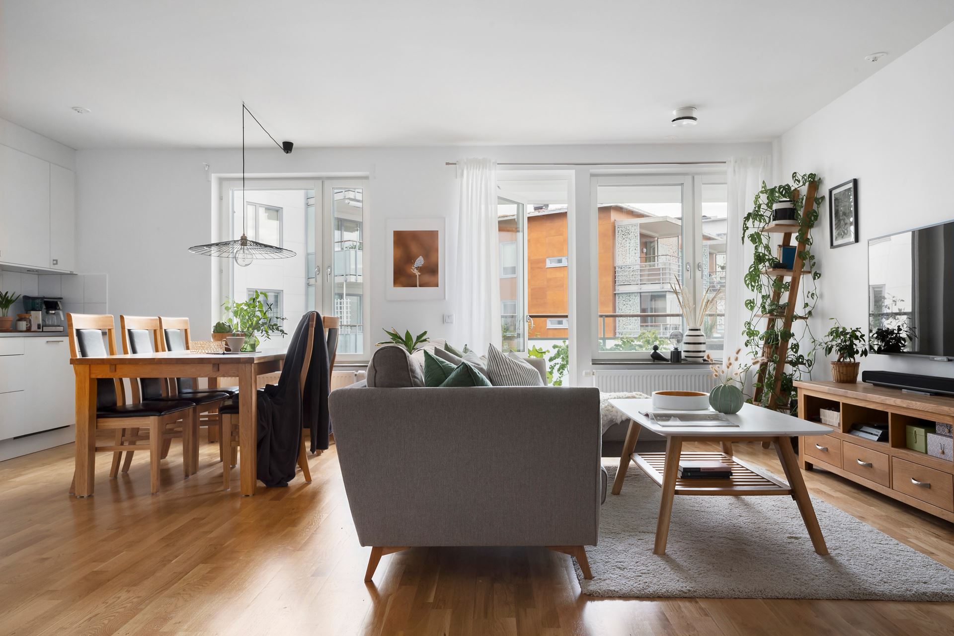 Flertalet fönster och planlösningen mot köket skapar ett rymligt och ljust vardagsrum. Här inreder vi med soffa, soffbord och tv-bänk efter tycke och smak. Från vardagsrummet tar vi oss ut på den generösa balkongen med mysig förmiddagssol. Bord, stolar eller loungemöbler får plats utan problem.