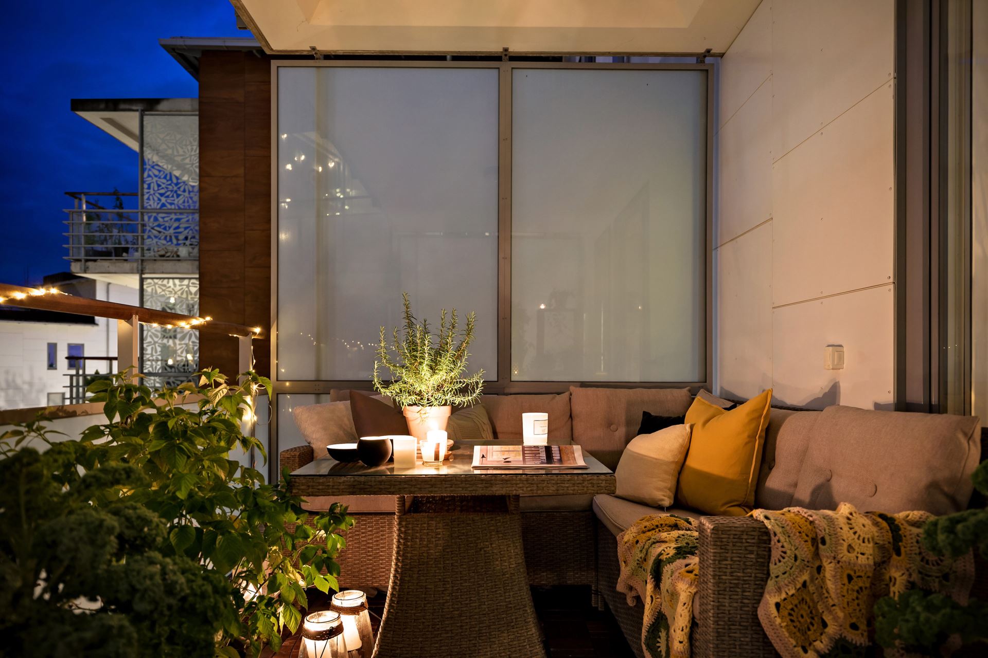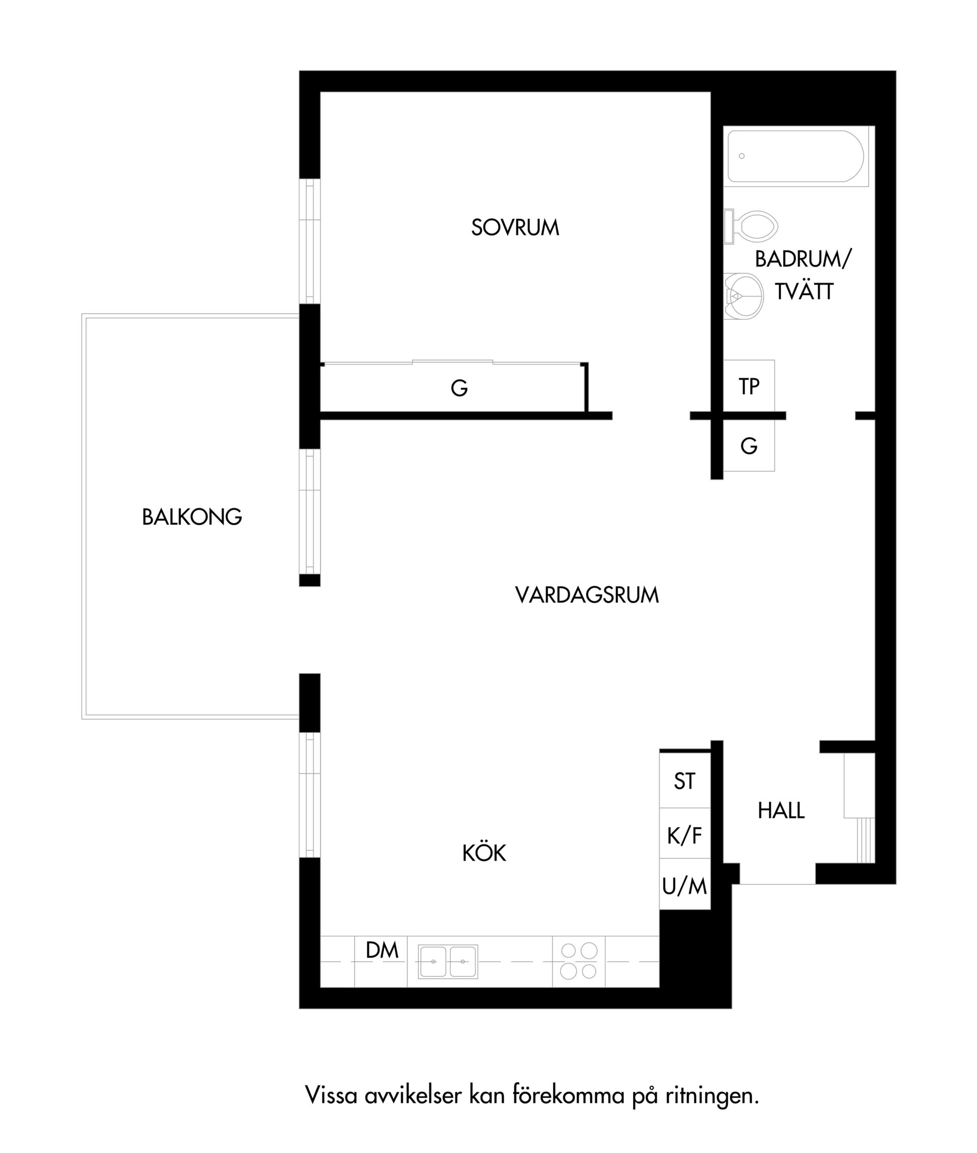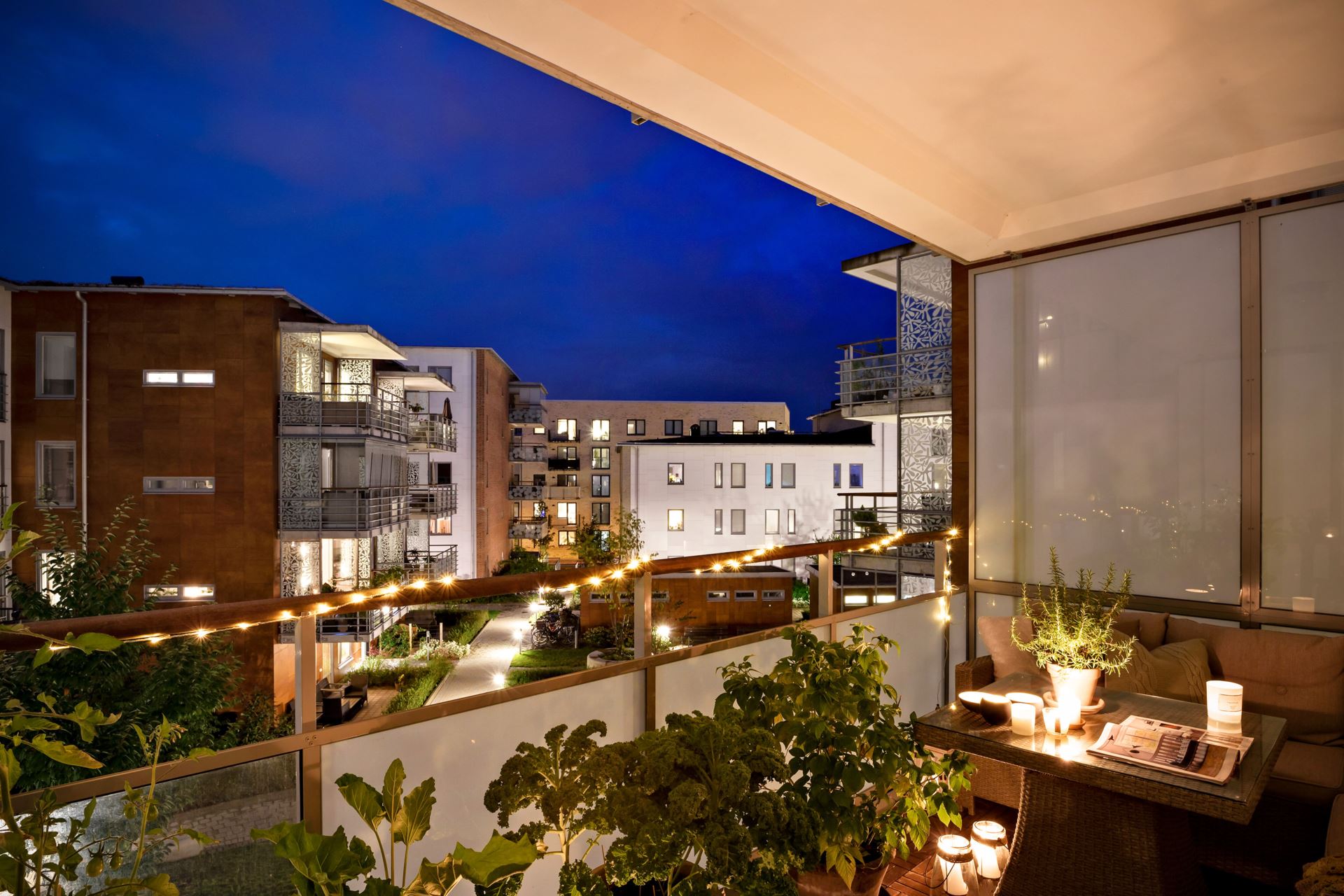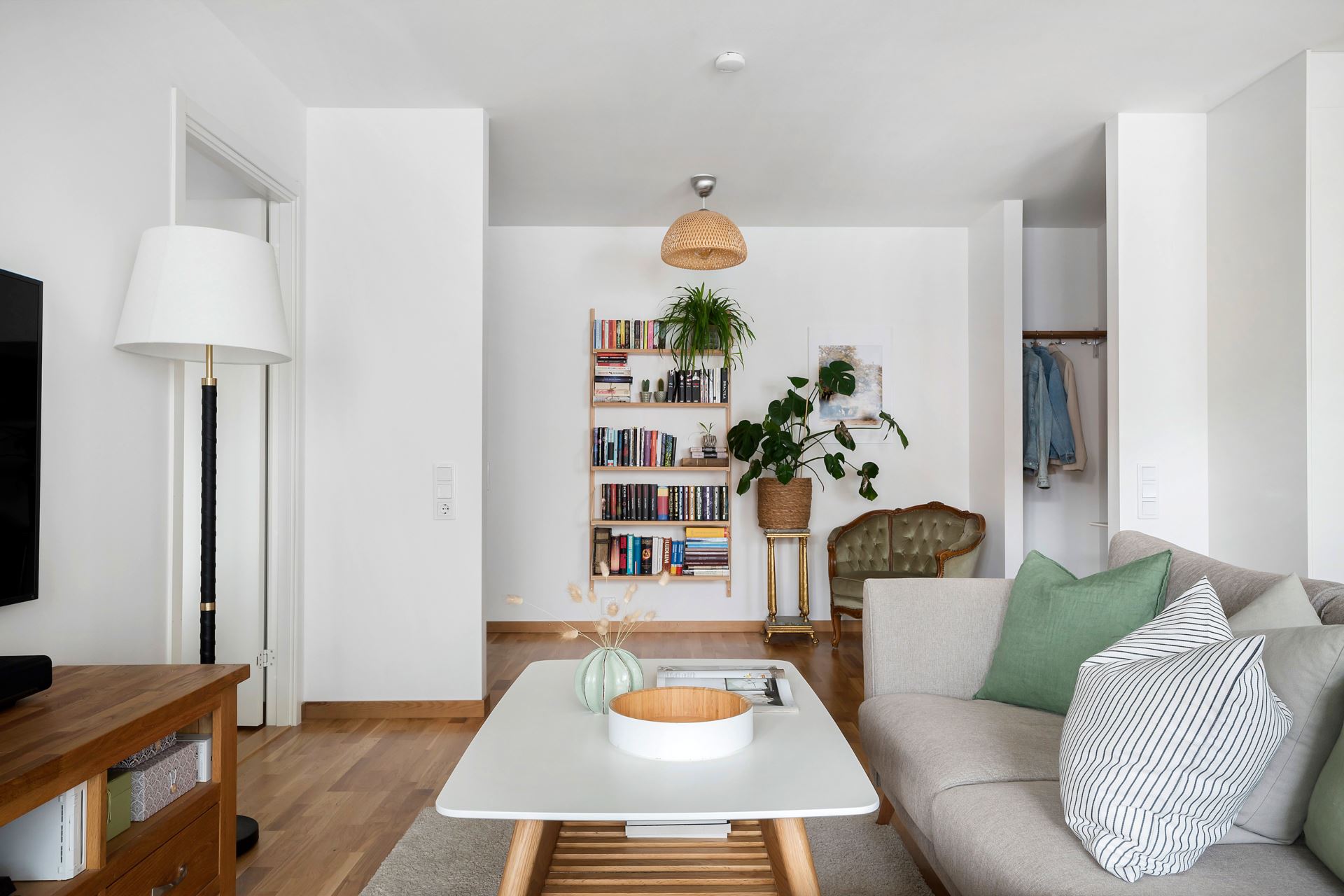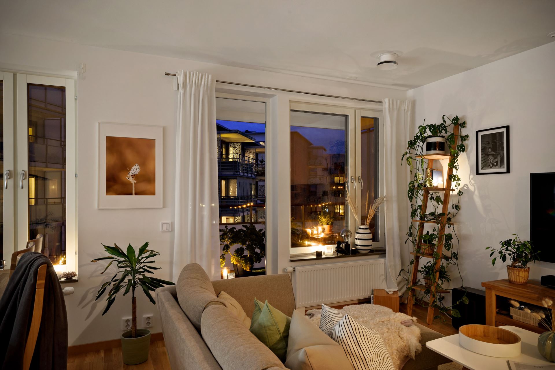 Flertalet fönster och planlösningen mot köket skapar ett rymligt och ljust vardagsrum. Här inreder vi med soffa, soffbord och tv-bänk efter tycke och smak. Från vardagsrummet tar vi oss ut på den generösa balkongen med mysig förmiddagssol. Bord, stolar eller loungemöbler får plats utan problem.
