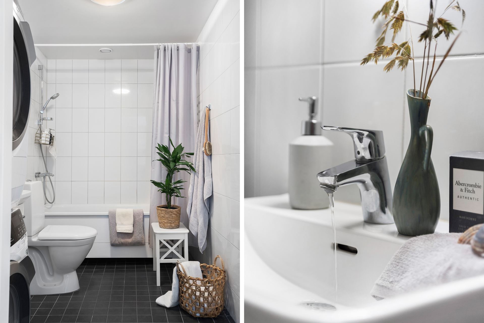 Det helkaklade badrummet har mörkgrå klinkers på golvet och vitt kakel på väggarna. Här finns badkar, wc, handdukstork, handfat med kommod och vägghängt spegelskåp samt tvättmaskin och torktumlare.