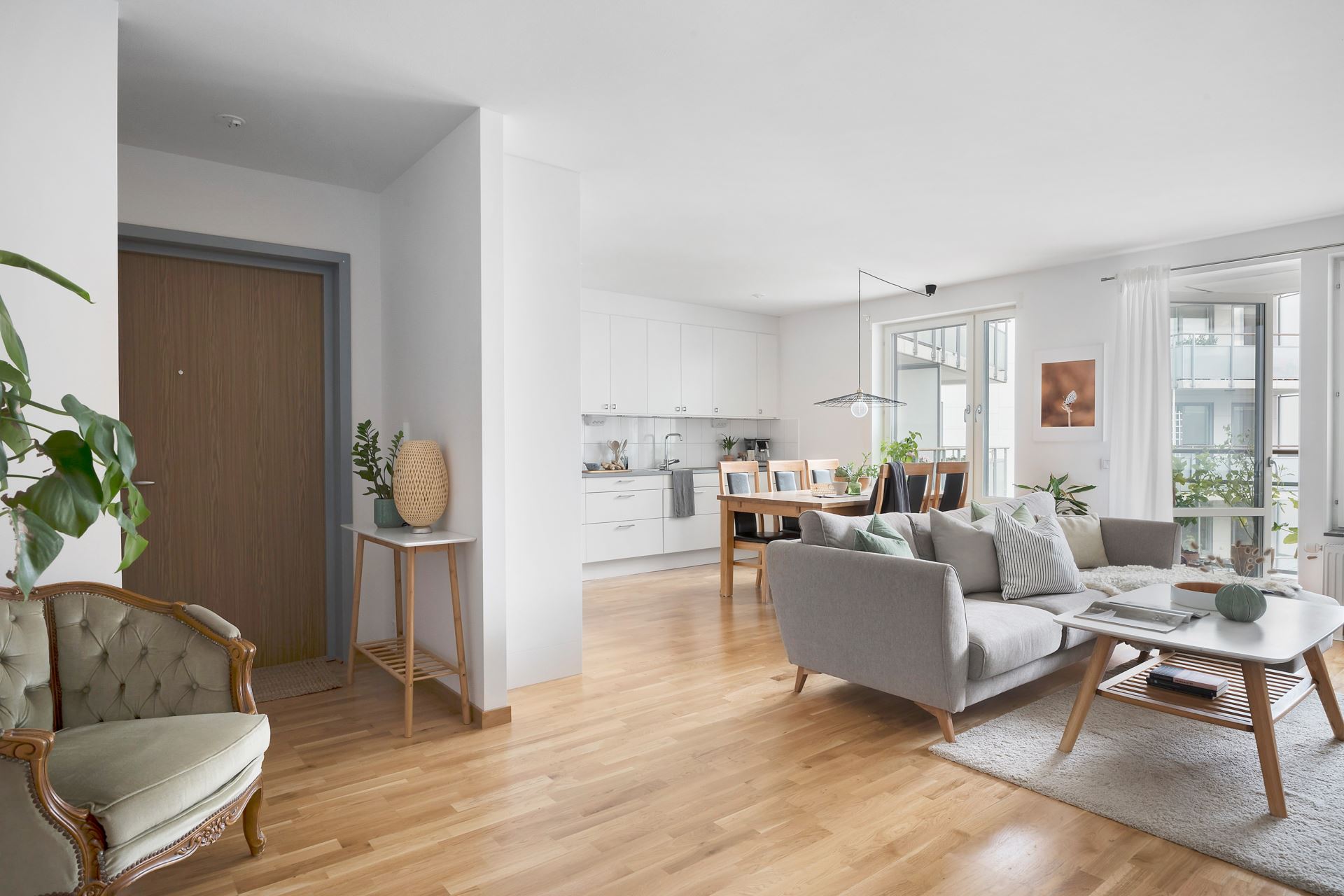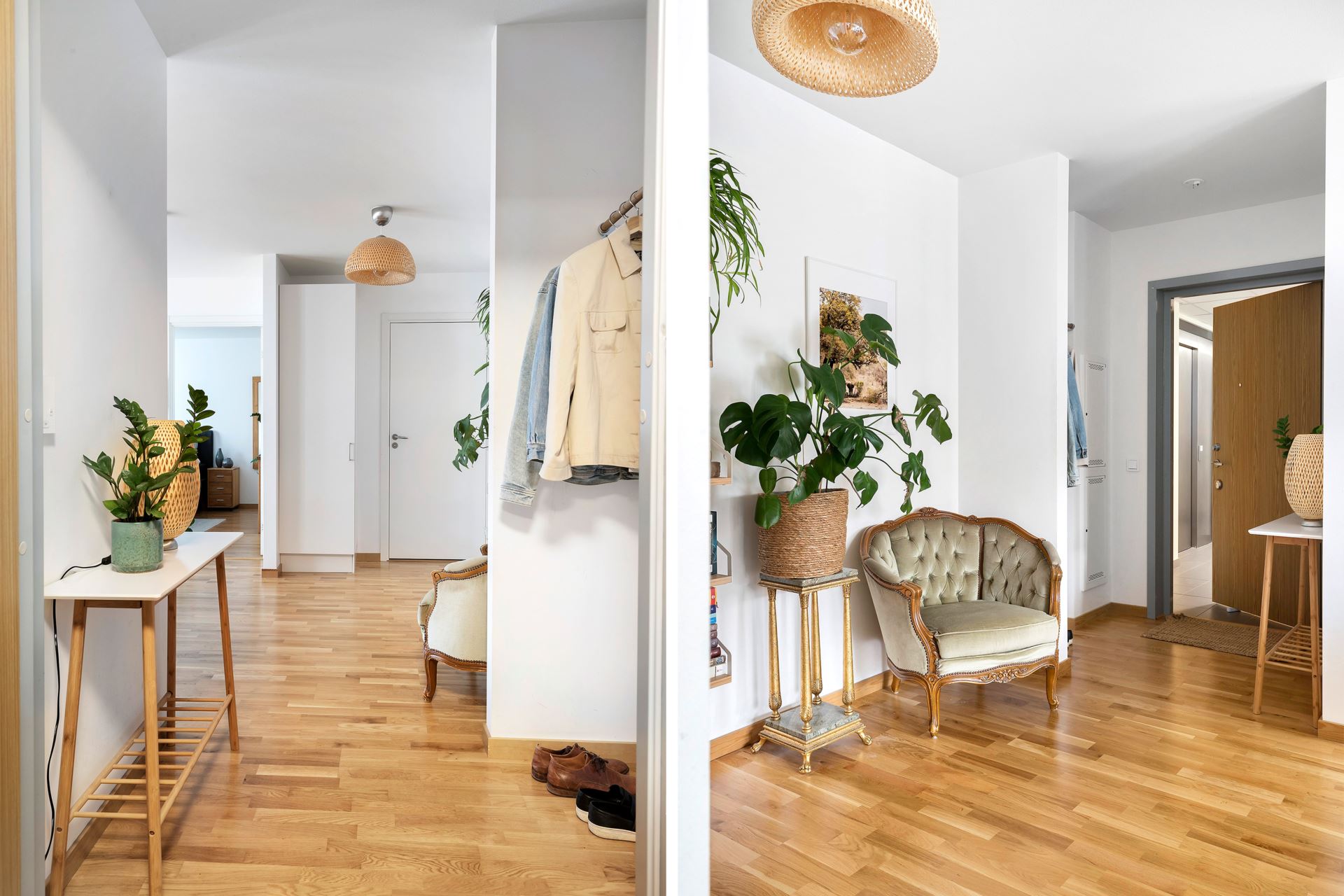 Varmt välkomna till Portvaktsgatan och detta nyproducerade hem från 2017. På tredje våningen stiger vi på och möts av en hall med plats för avhängning av ytterkläder och skor. Väggarna är vitmålade och på golvet vilar ekparkett, vilket är genomgående för hela bostaden.