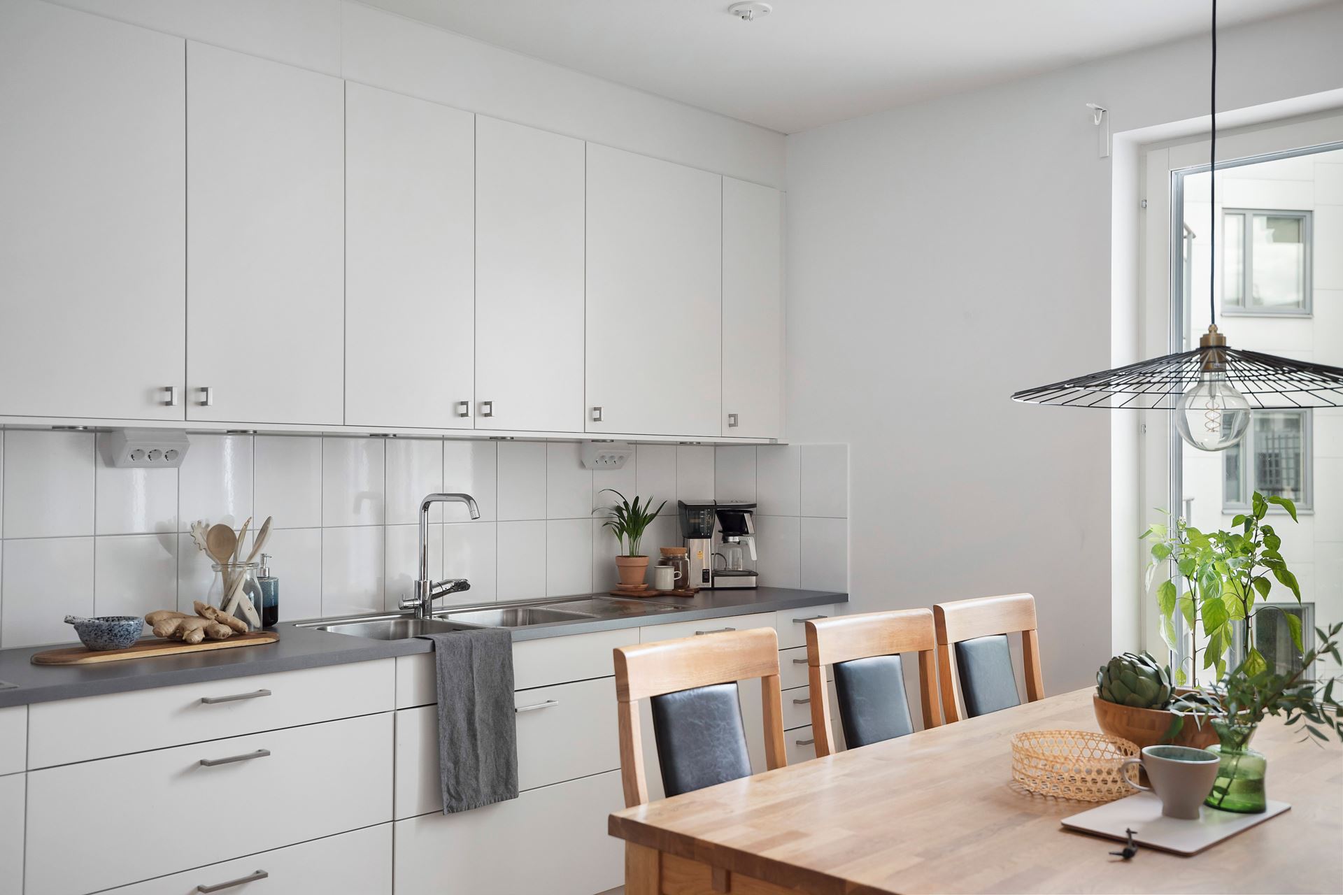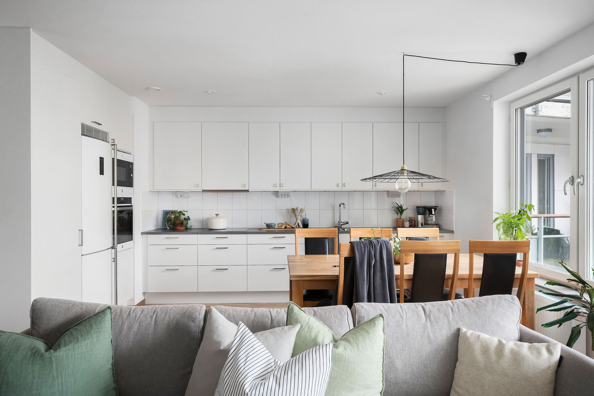 Modernt kök med vita luckor (Marbodal), vitt kakel och grå bänkskiva som bryter av snyggt. Köket är utrustat med induktionshäll, inbyggd ugn och micro, fläkt, kyl/frys och diskmaskin. Ett större matbord ryms enkelt invid köket tack vare den öppna planlösningen mot vardagsrummet.