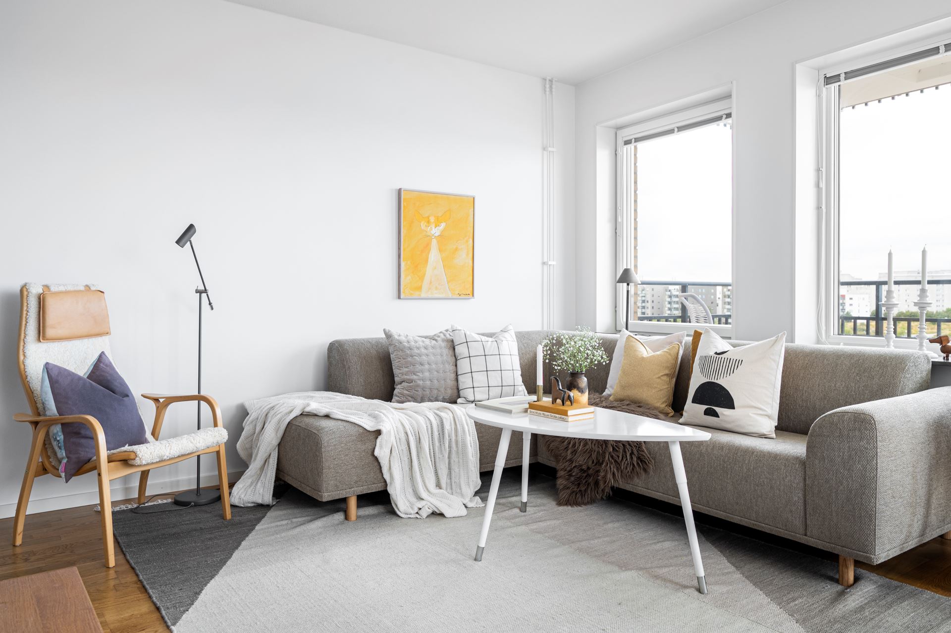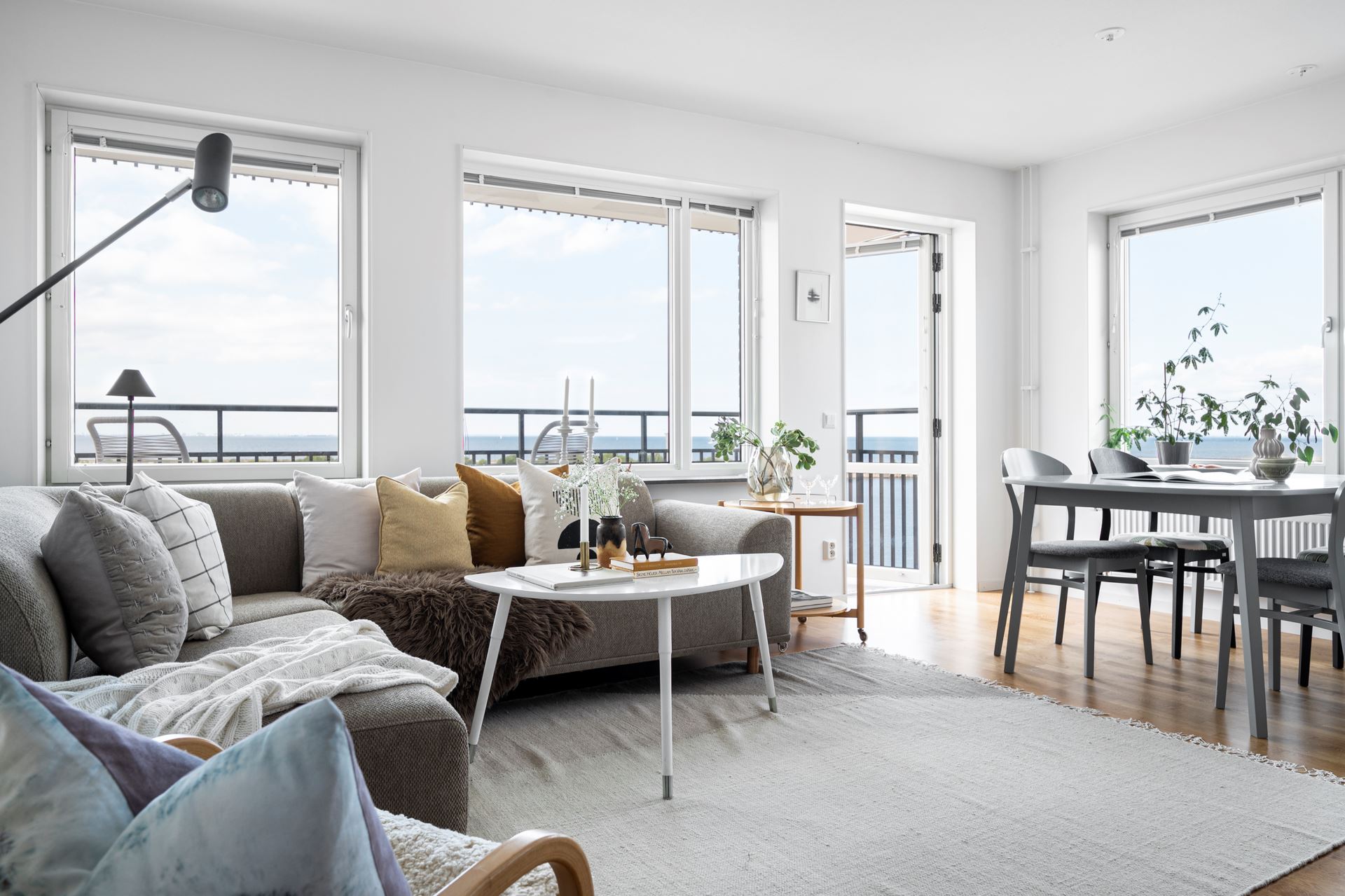 Hemmets naturliga mittpunkt bjuder på fantastiskt ljus och är öppet mot köket. Det har samma vackra parkettgolv som resten av lägenheten samt vita väggar. Utgång till en av balkongerna som ligger i perfekt västerläge där du kan koppla av, äta middag och se solen gå ner efter dagens slut.