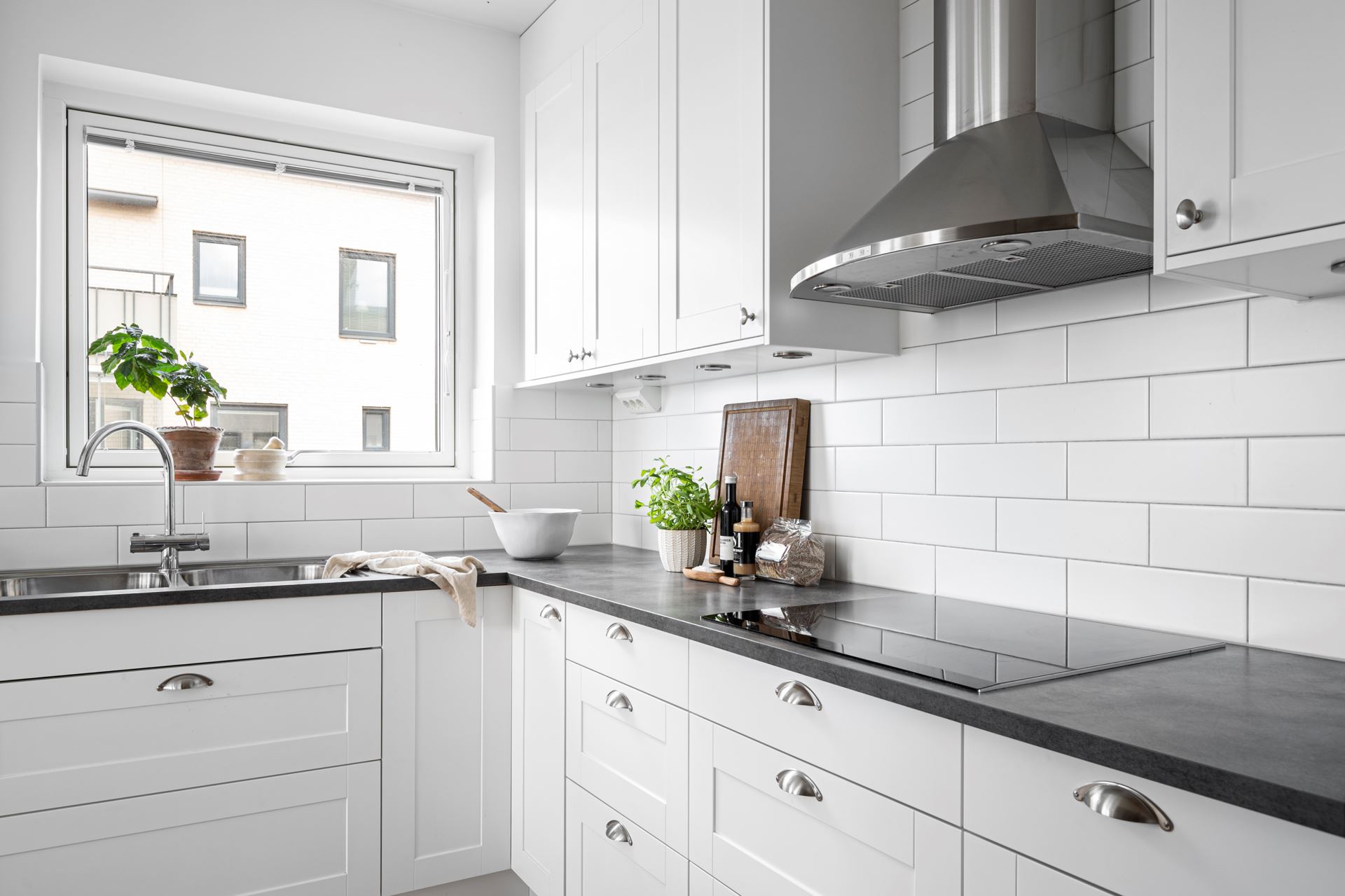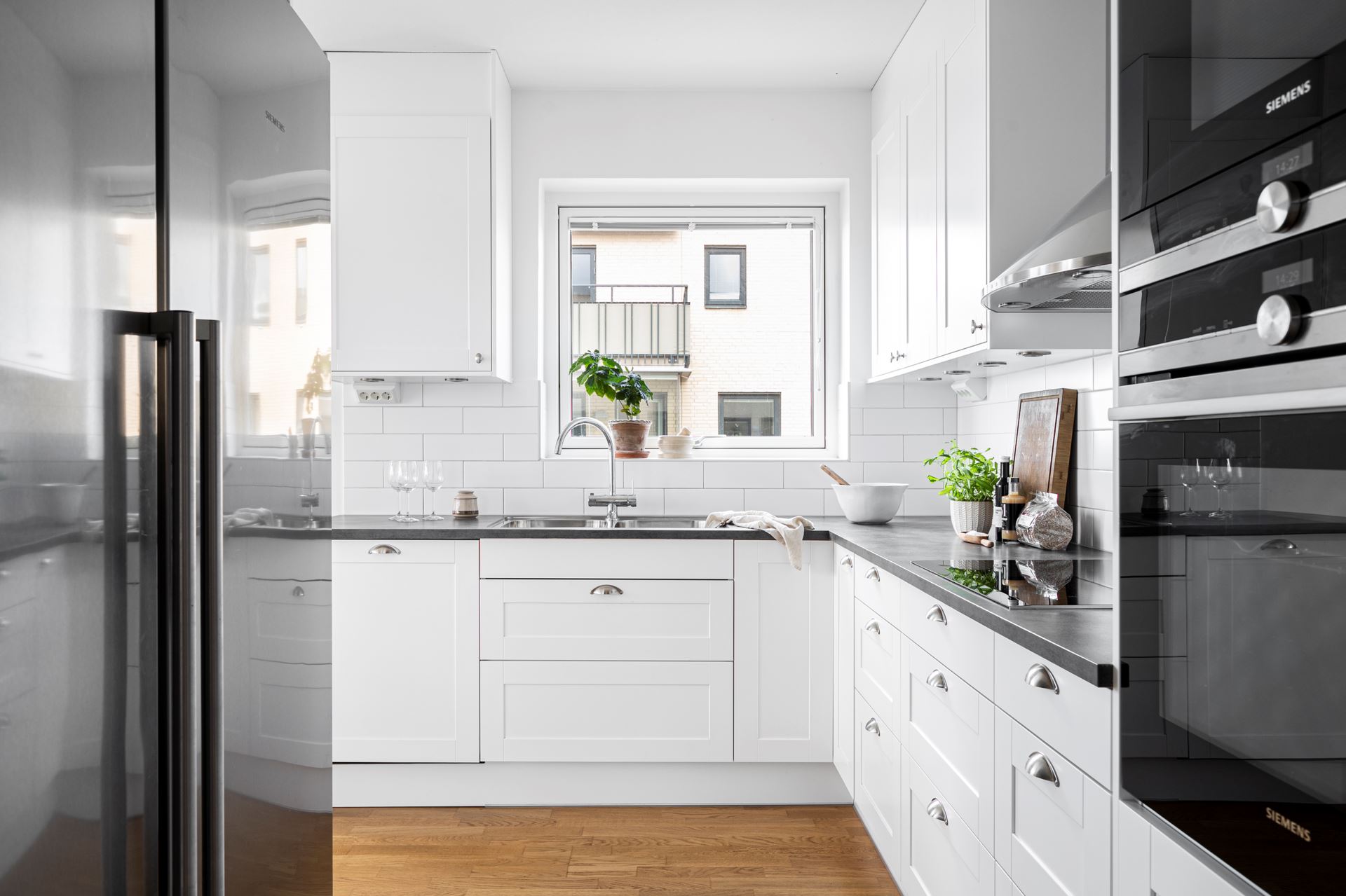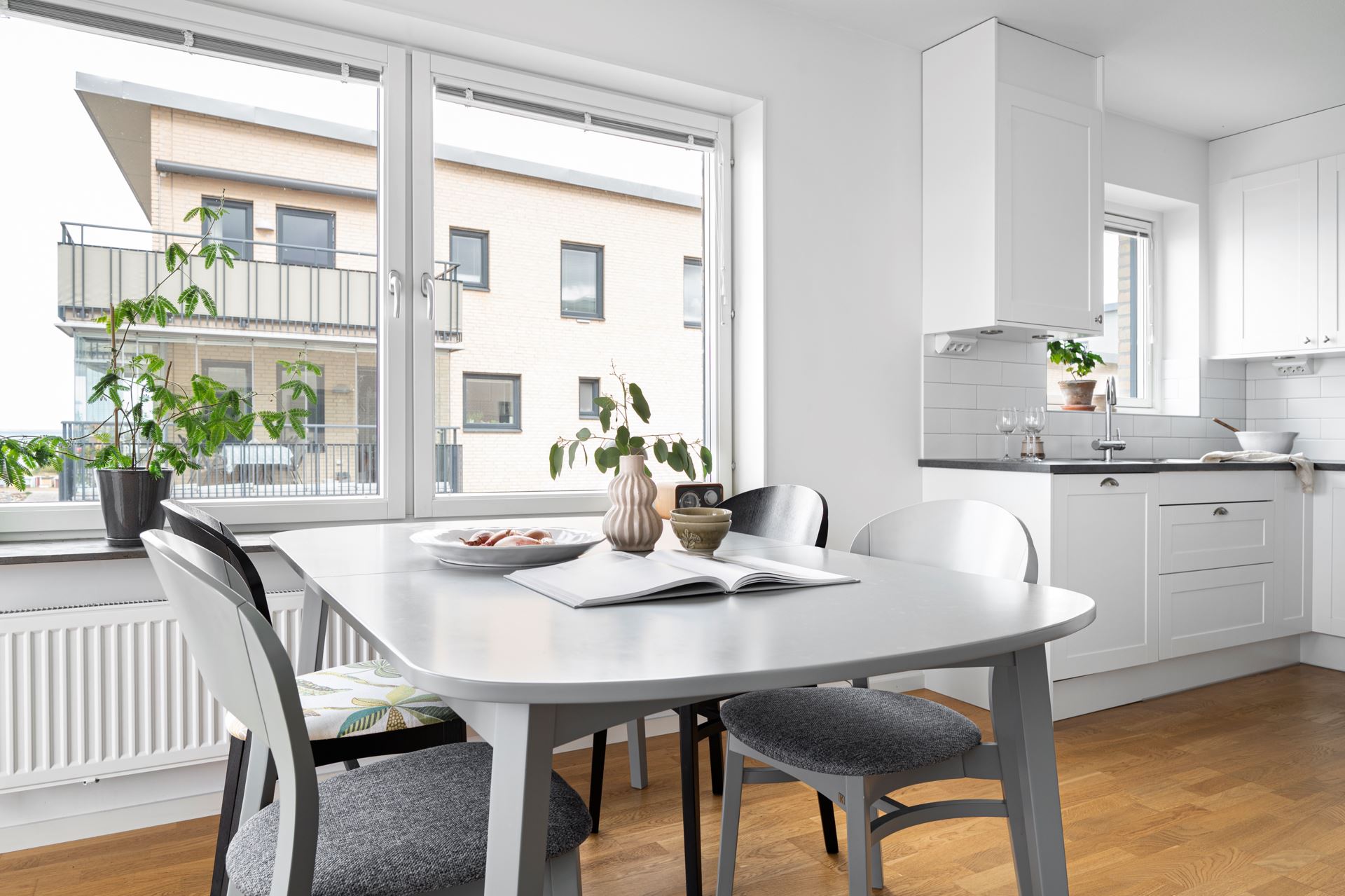Bostadens kök har parkettgolv, vita väggar och fönster med fint ljusinsläpp över diskbänken. Smakfull och klassisk köksinredning från Marbodal - profilerade luckor i vitt, rostfria beslag, spotlights i överskåp, grå bänkskiva i laminat och vitt kakel över arbetsytorna. Köket är välutrustat med kyl och frys i fullhöjd, modern induktionshäll, rostfri fläkt, inbyggd varmluftsugn med pyrolysfunktion, inbyggd mikrovågsugn samt integrerad diskmaskin. Samtliga vitvaror från Siemens förutom fläkten som är från Franke. Köket ligger i en tilltalande semiöppen planlösning mot vardagsrummet och i anslutning finns en trevlig integrerad matplats.