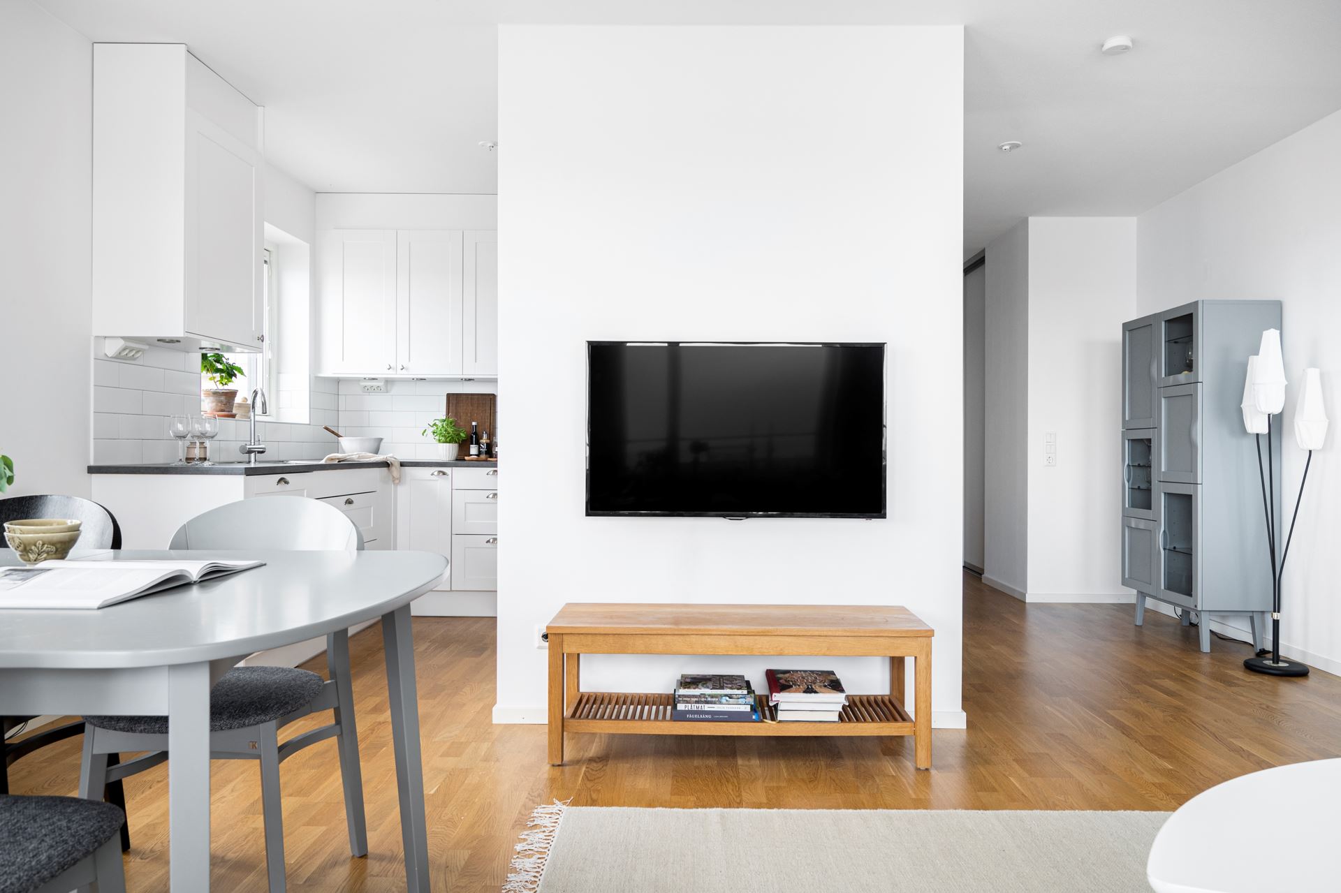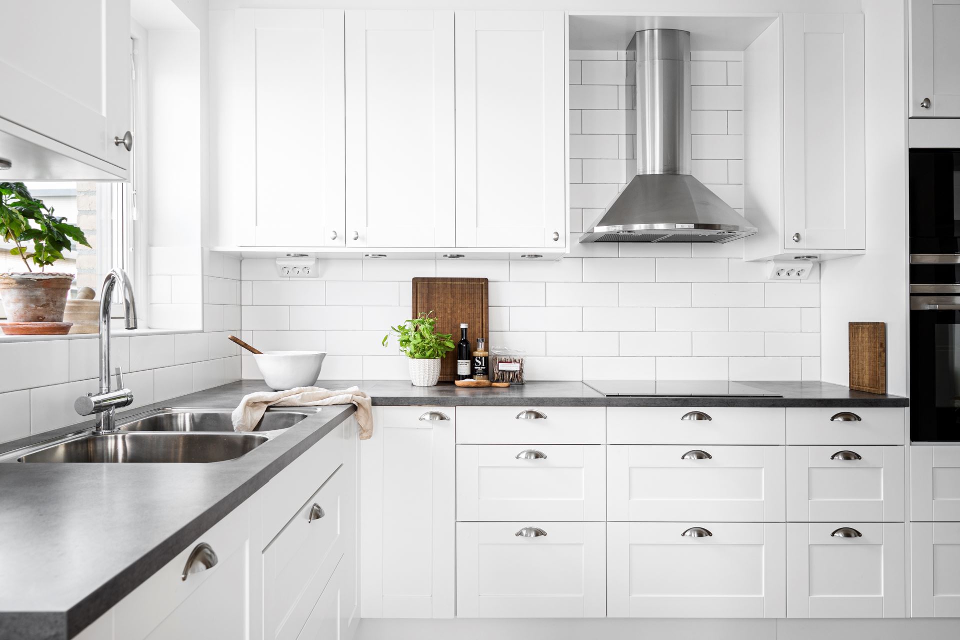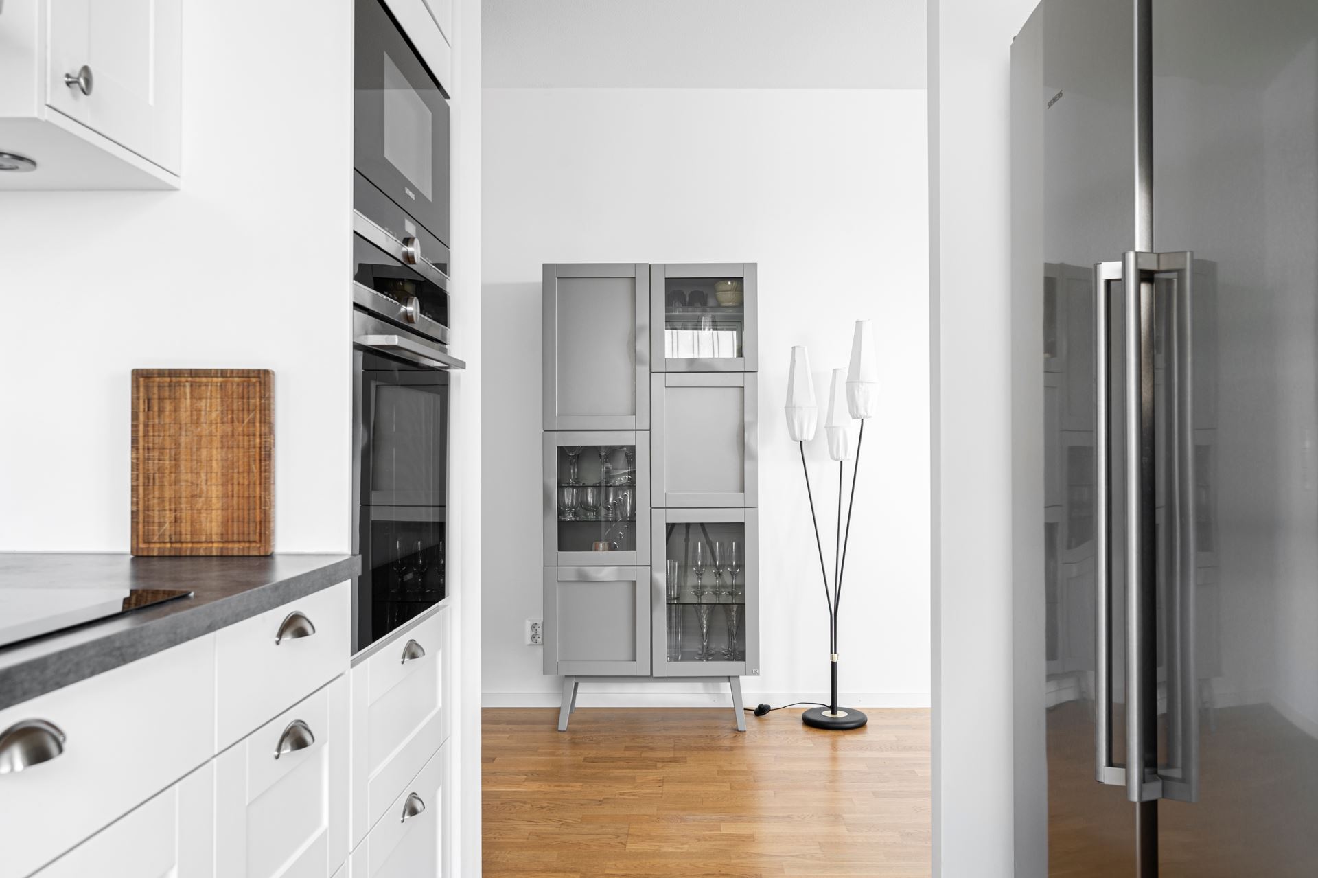 Bostadens kök har parkettgolv, vita väggar och fönster med fint ljusinsläpp över diskbänken. Smakfull och klassisk köksinredning från Marbodal - profilerade luckor i vitt, rostfria beslag, spotlights i överskåp, grå bänkskiva i laminat och vitt kakel över arbetsytorna. Köket är välutrustat med kyl och frys i fullhöjd, modern induktionshäll, rostfri fläkt, inbyggd varmluftsugn med pyrolysfunktion, inbyggd mikrovågsugn samt integrerad diskmaskin. Samtliga vitvaror från Siemens förutom fläkten som är från Franke. Köket ligger i en tilltalande semiöppen planlösning mot vardagsrummet och i anslutning finns en trevlig integrerad matplats.