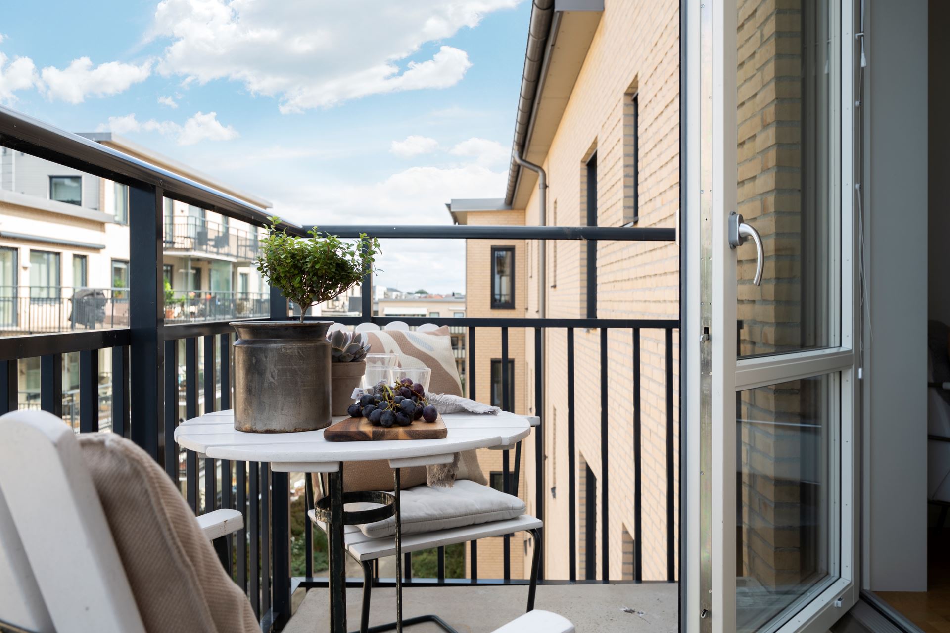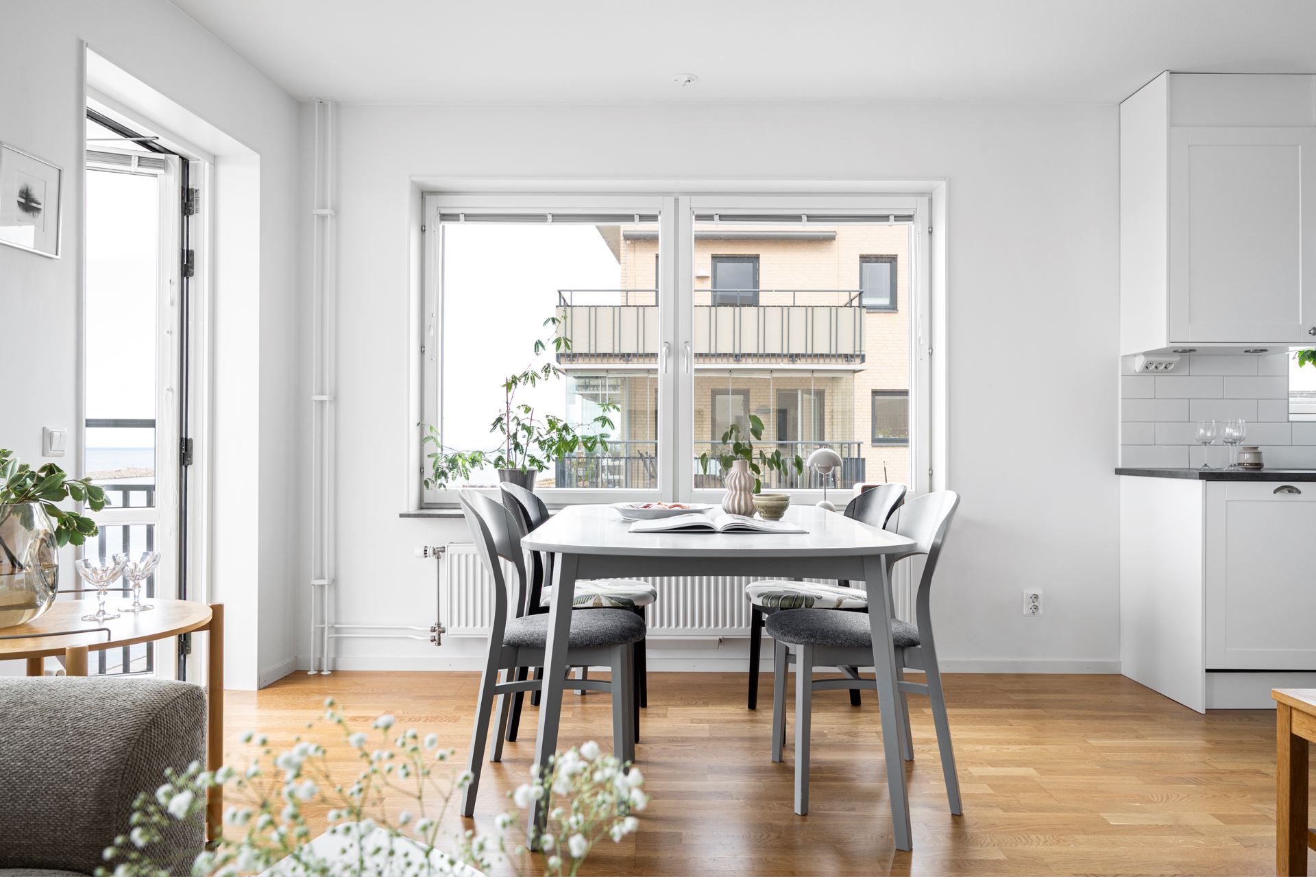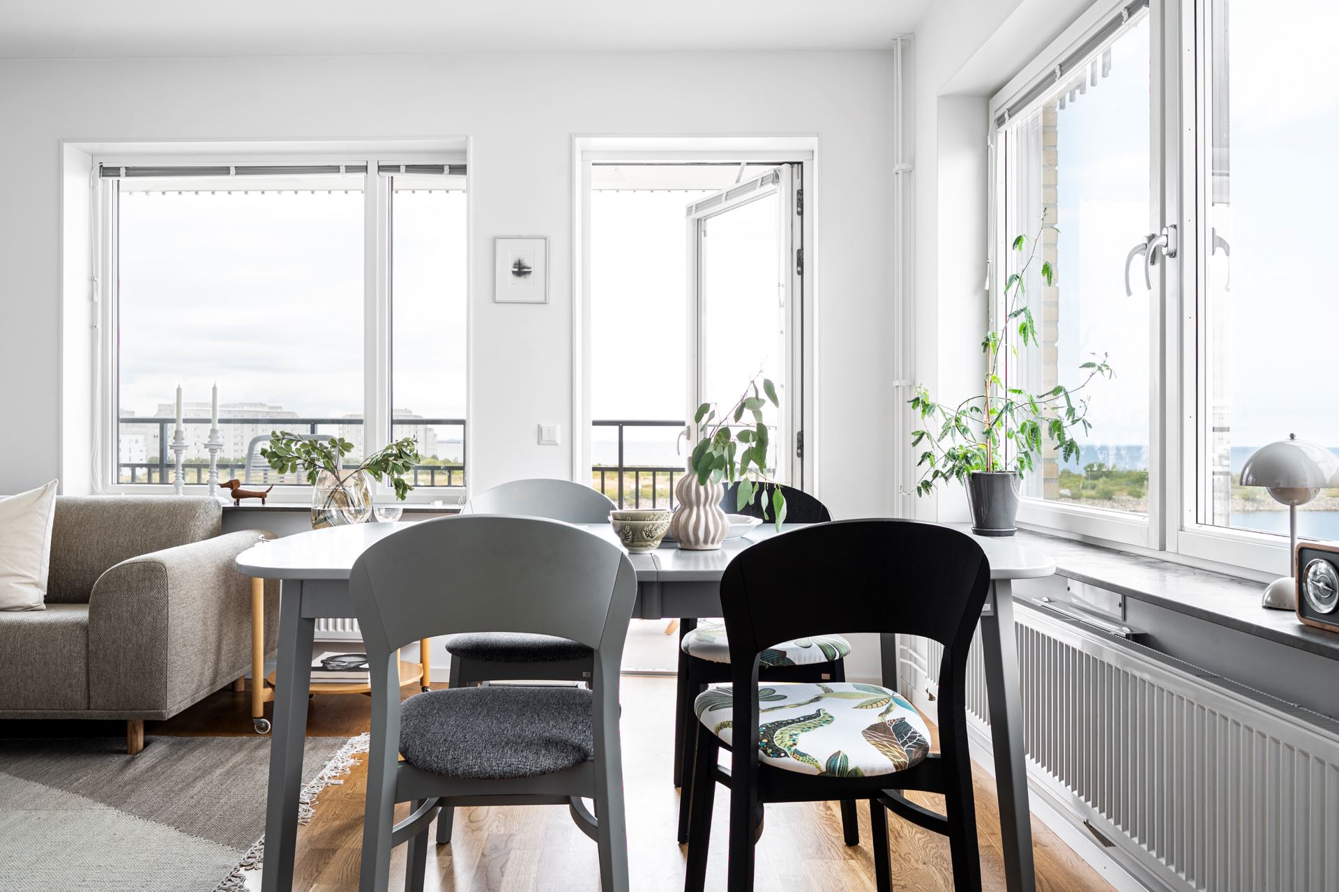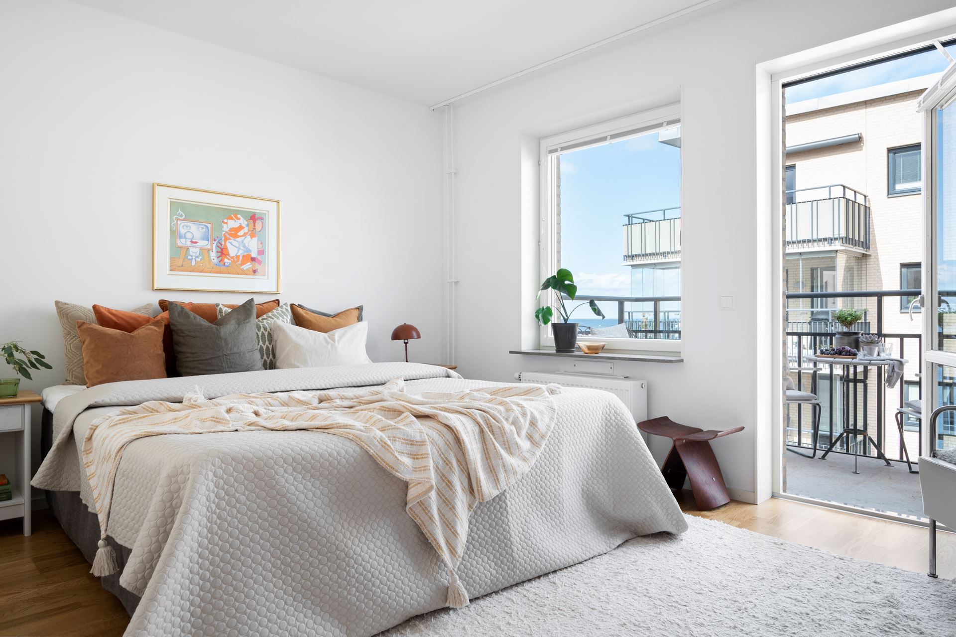 Ljuvligt sovrum med extra ljusinsläpp tack vare utgången till den andra balkongen. Norrläget gör balkongen perfekt för långa helgfrukostar och inte minst som vädringsbalkong. Dessutom har du även här havsutsikten att avnjuta. På golvet ligger parkett och väggarna är vita.