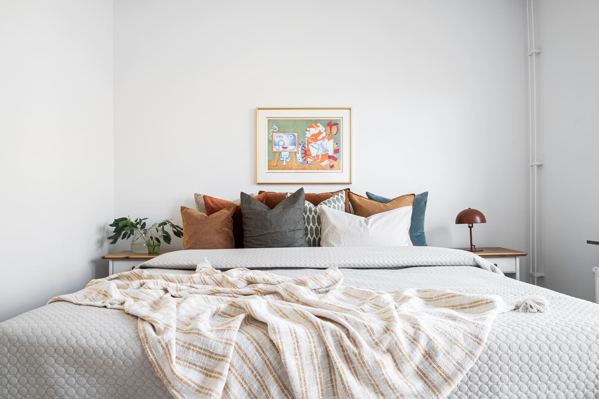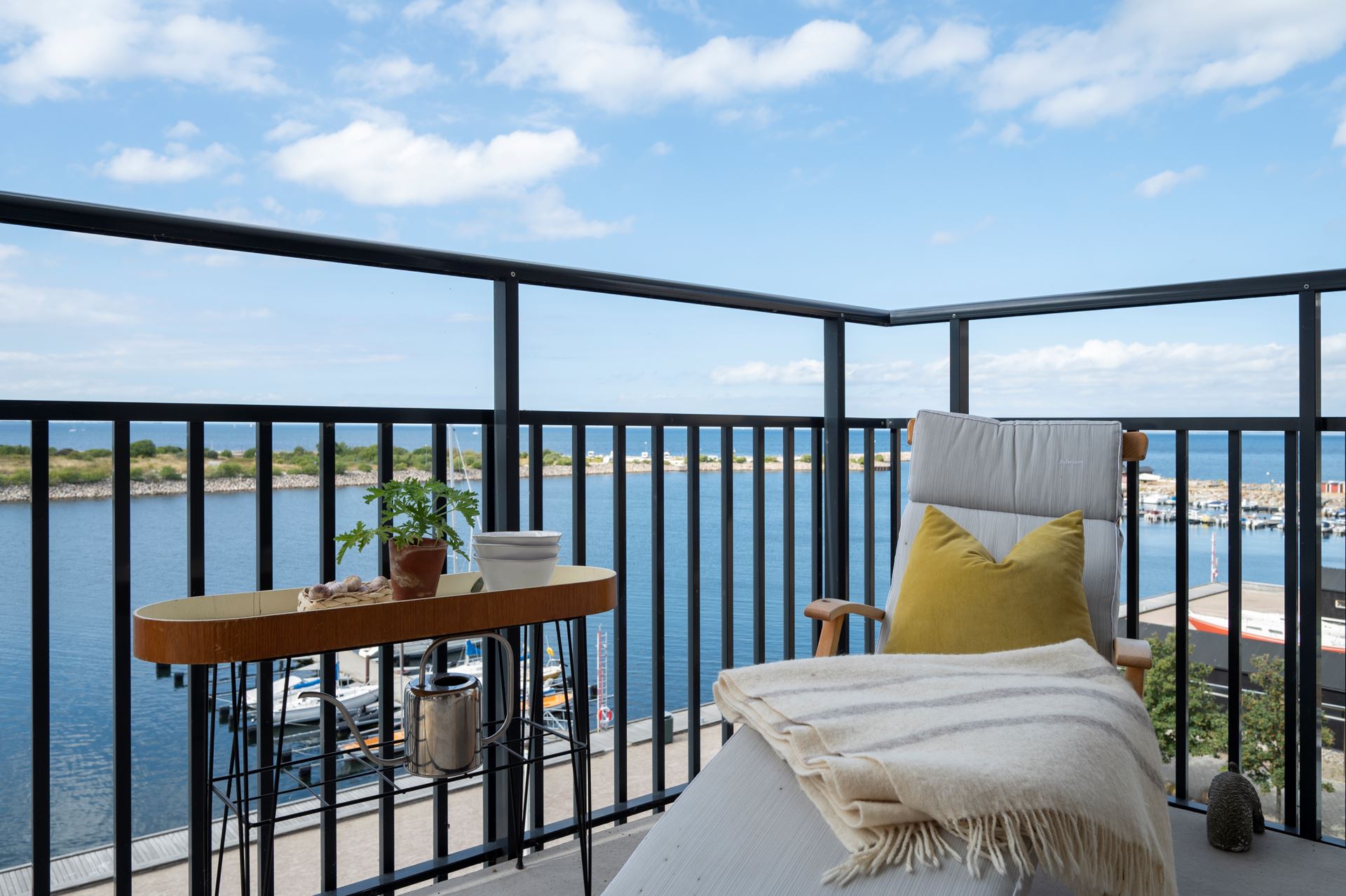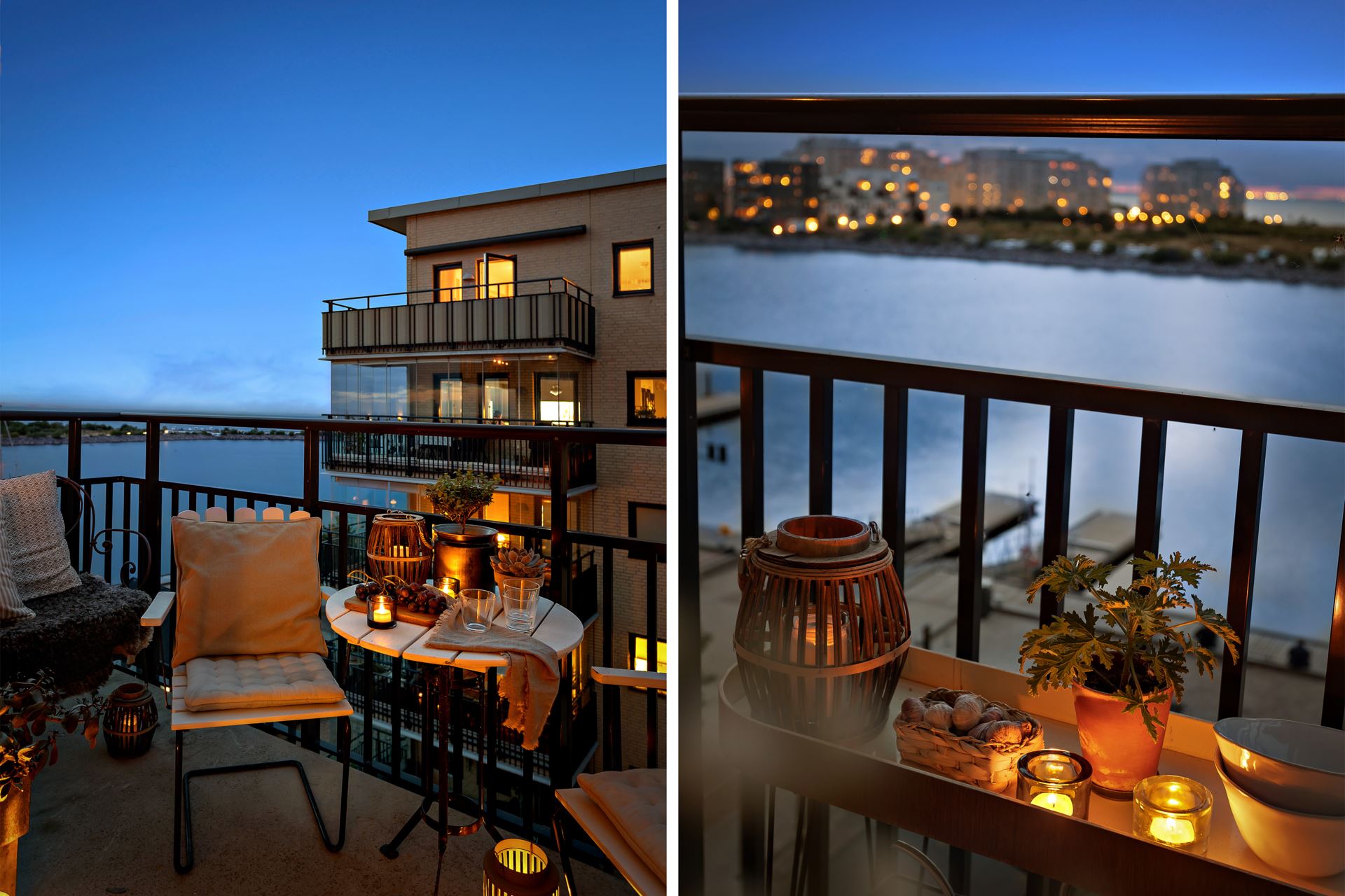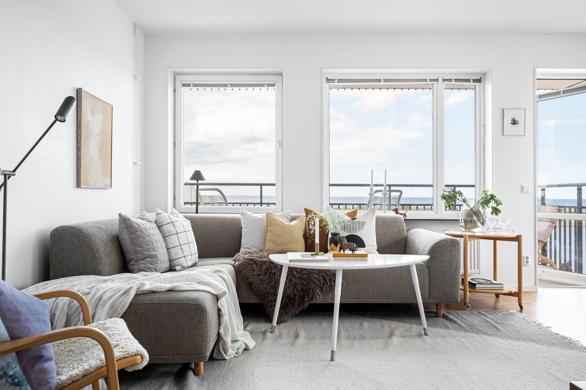 Ljuvligt sovrum med extra ljusinsläpp tack vare utgången till den andra balkongen. Norrläget gör balkongen perfekt för långa helgfrukostar och inte minst som vädringsbalkong. Dessutom har du även här havsutsikten att avnjuta. På golvet ligger parkett och väggarna är vita.