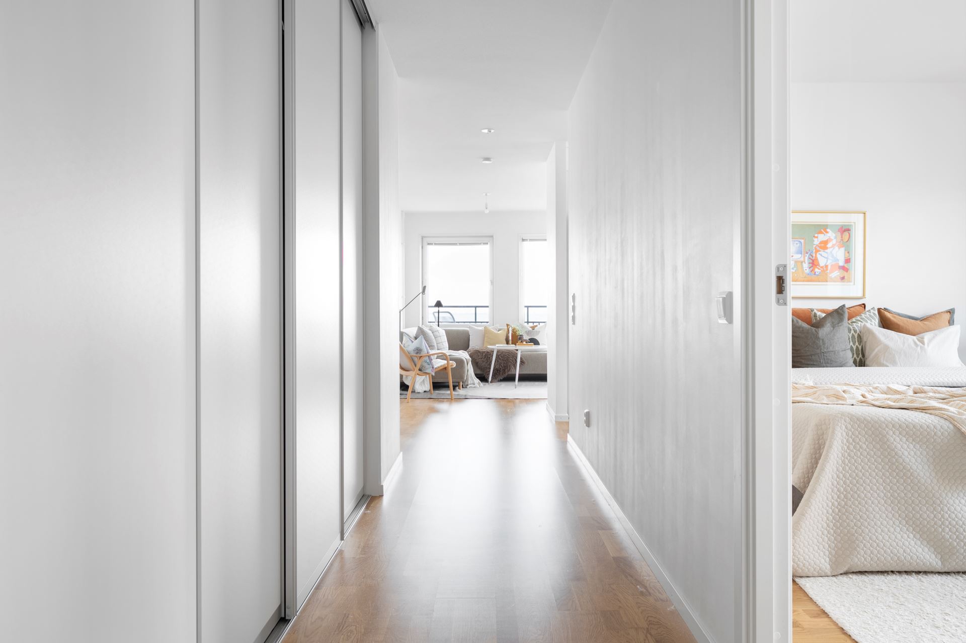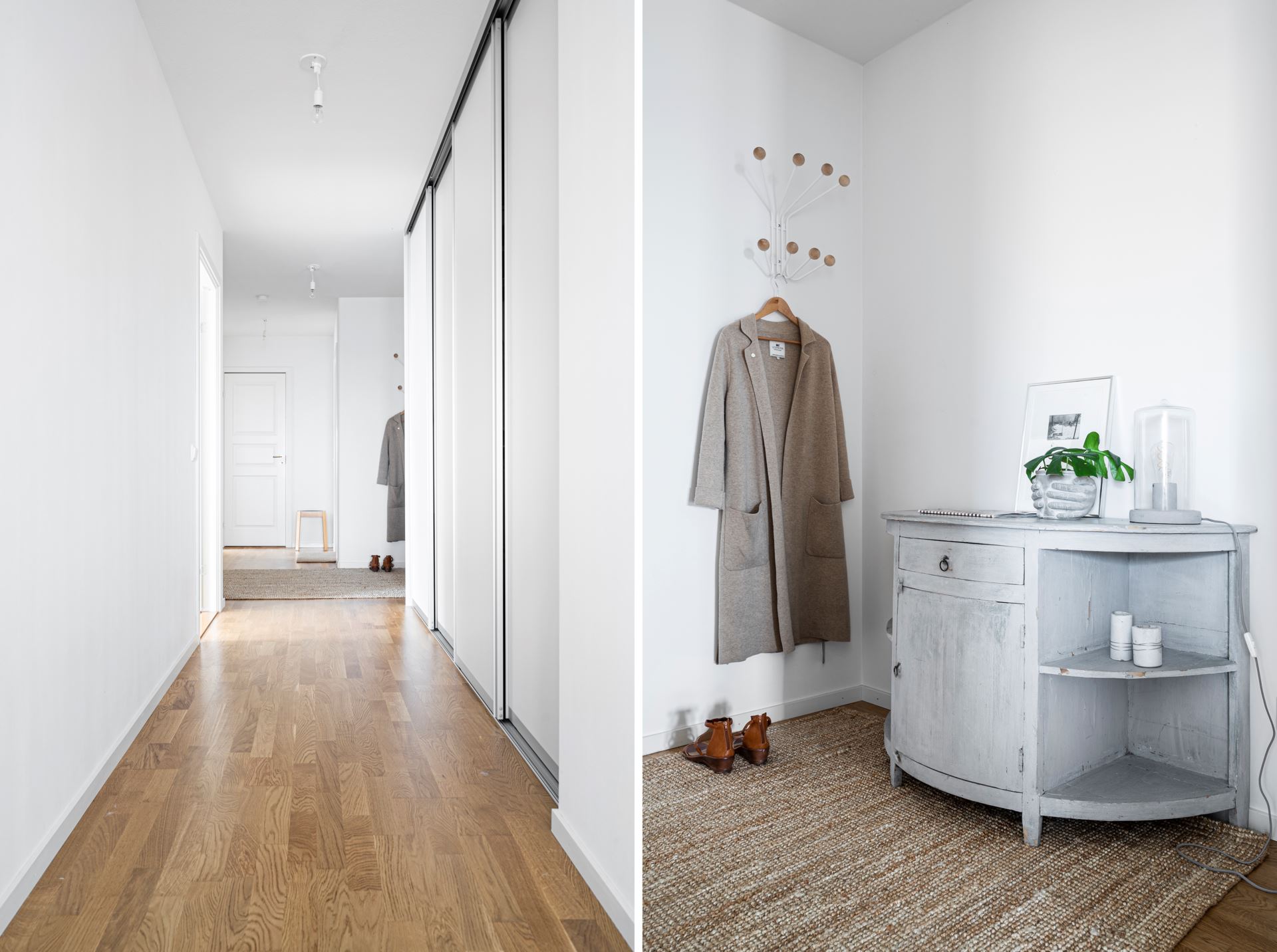 Välkomnande hall med parkettgolv och vita väggar. Plats för avhängning med mindre hallmöblemang. Hallen erbjuder både klädkammare och platsbyggd garderob med skjutdörrar.