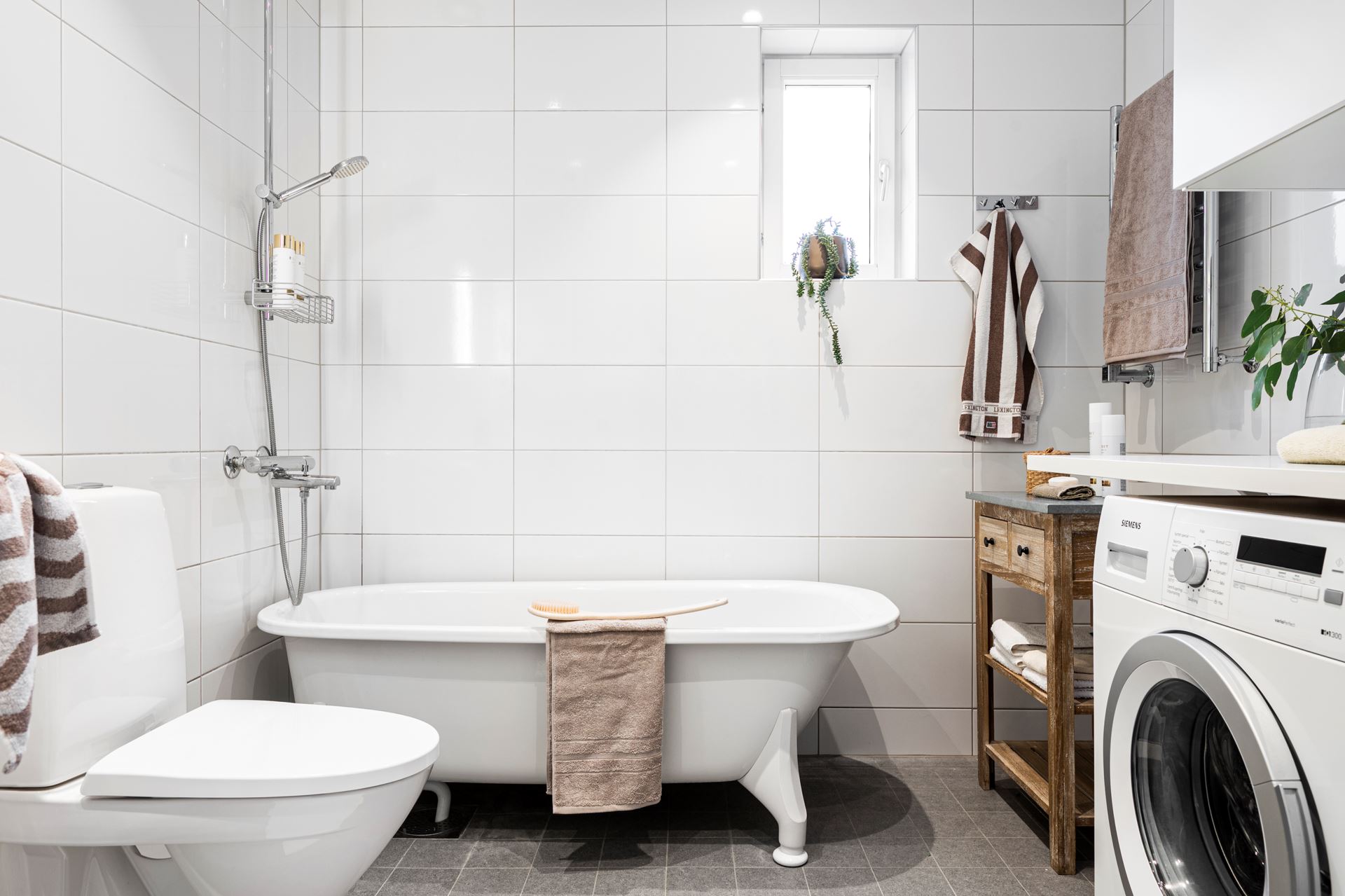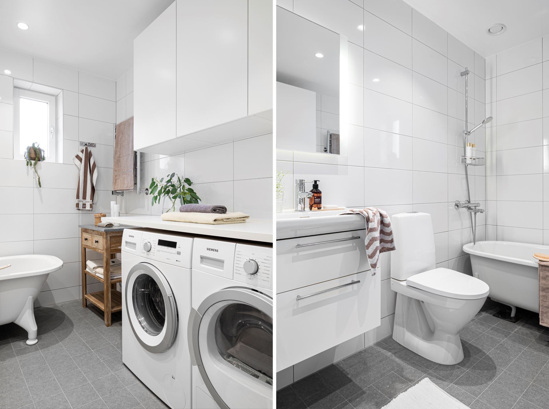 Badrummet är härligt med ljusbringande vädringsfönster över badkaret på fot med dusch. Grå klinker på golvet och vitt kakel på väggarna. Övrig inredning är WC, handfat med vit kommod, spegel med belysning och handdukstork. Badrummet fungerar även som kombinerat tvättrum med tvättmaskin och torktumlare (Siemens) under vit bänkskiva som har vita vägghängda skåp över sig.