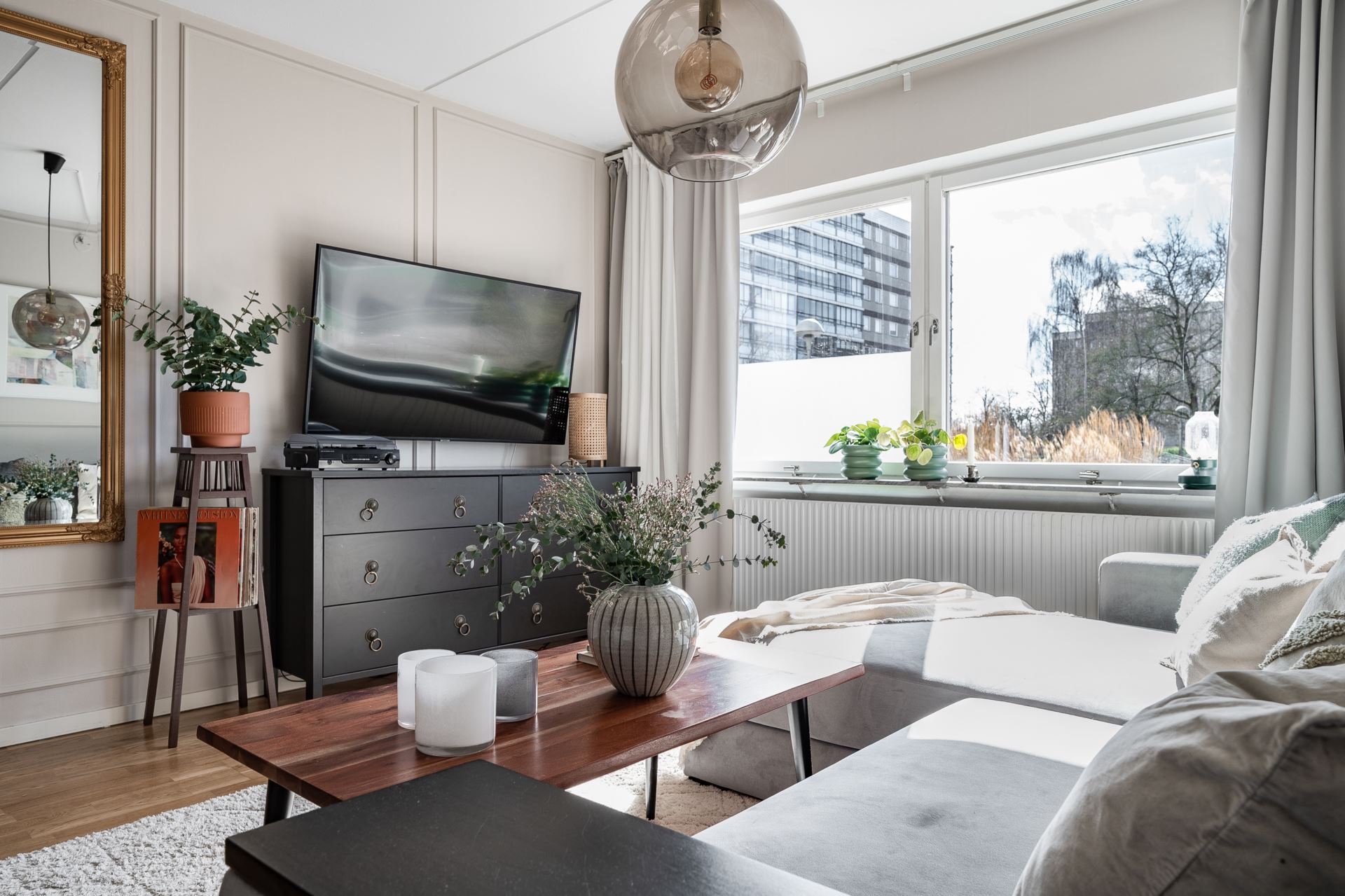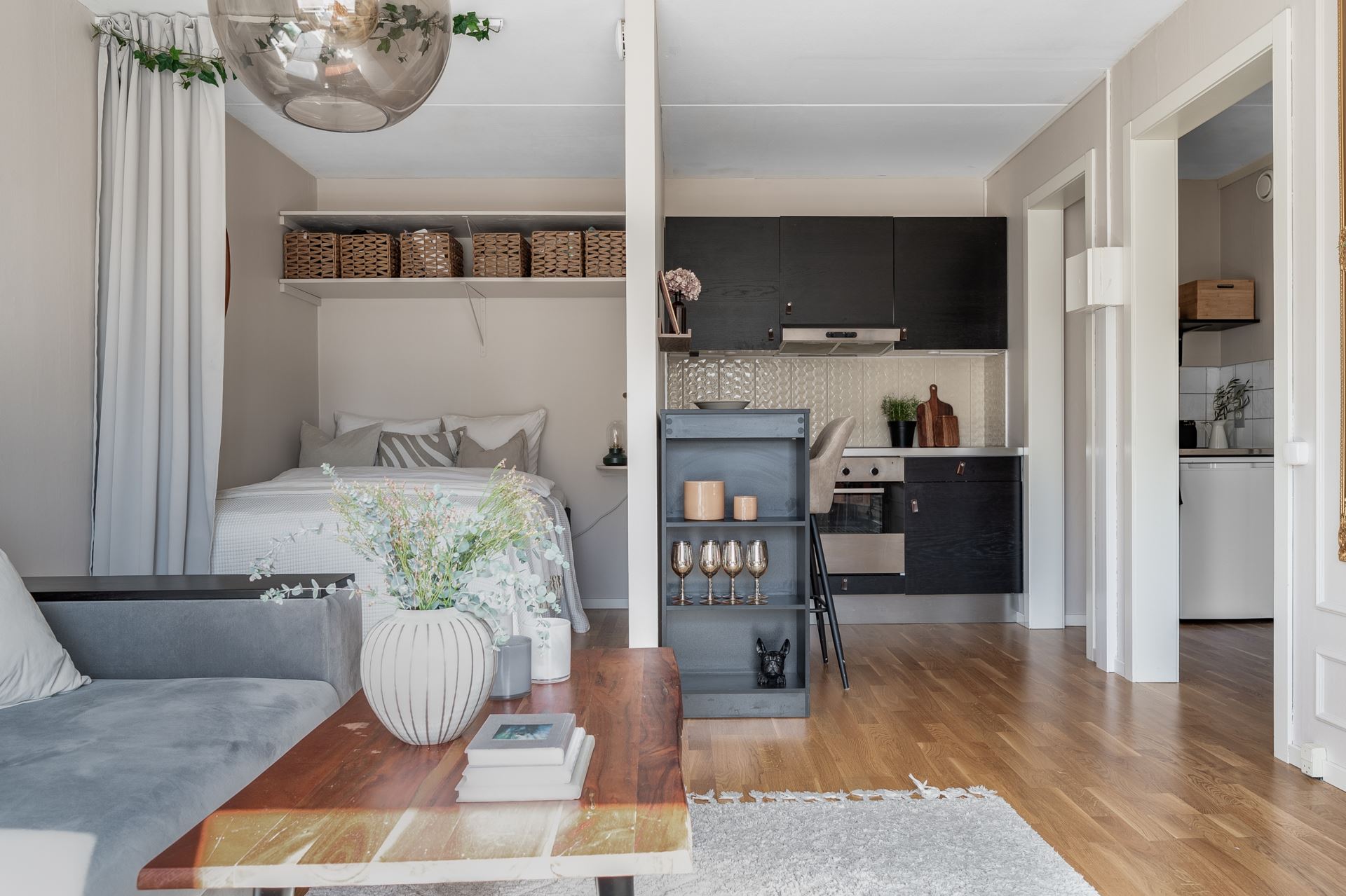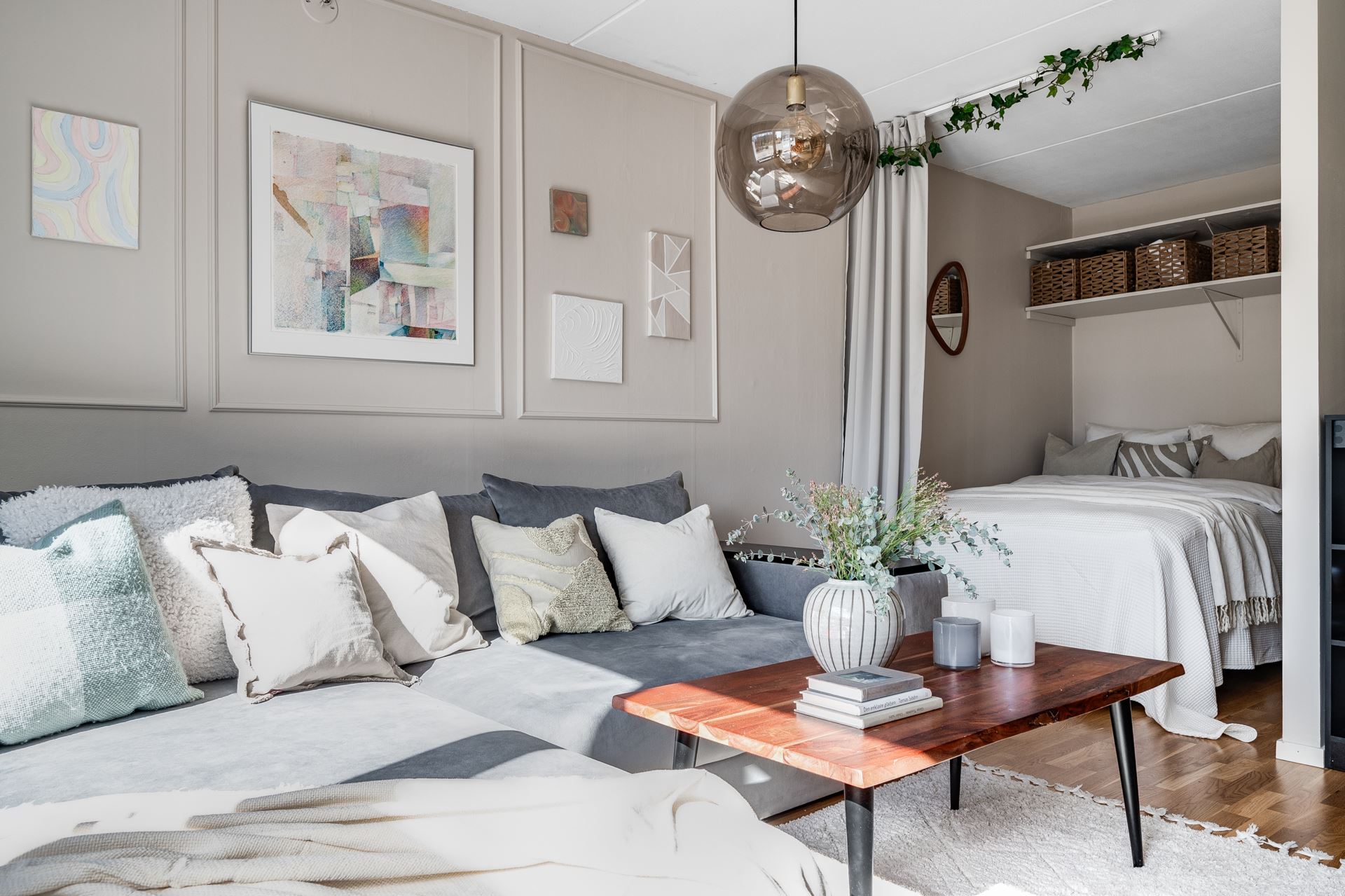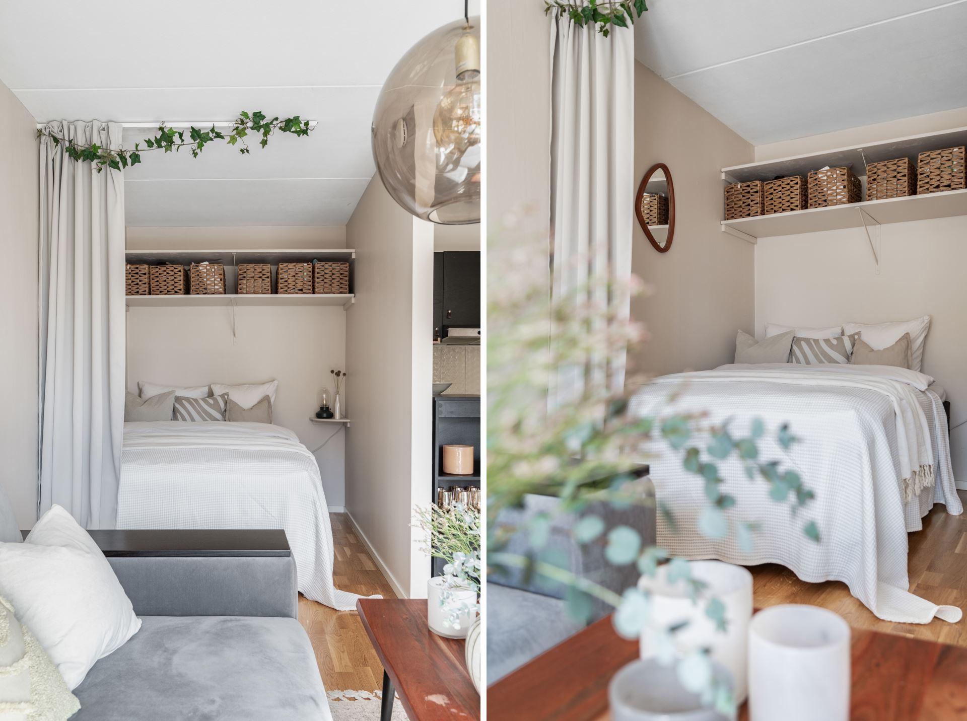 Välplanerade kvadratmeter som enkelt kan möbleras med soffgrupp och tv samt skrivbord. I alkovdelen ryms gott om plats till större säng och sängbord.
