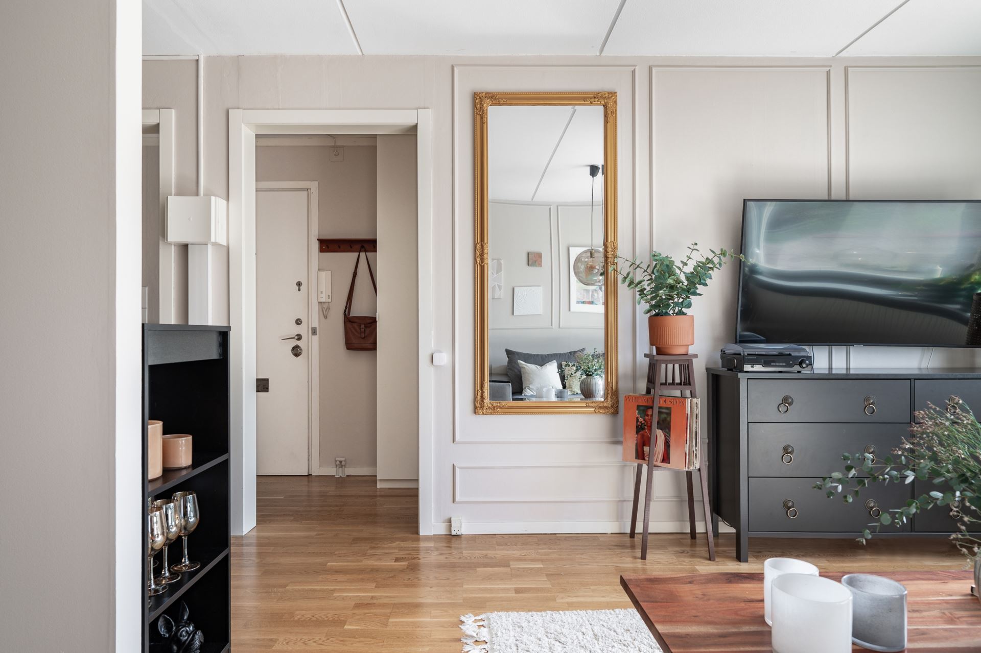 Hallen välkomnar med plats till avhängningsmöjligheter på höger sida. Fina beiga väggar kombineras med ekparkett som vilar på golv i hela bostaden.