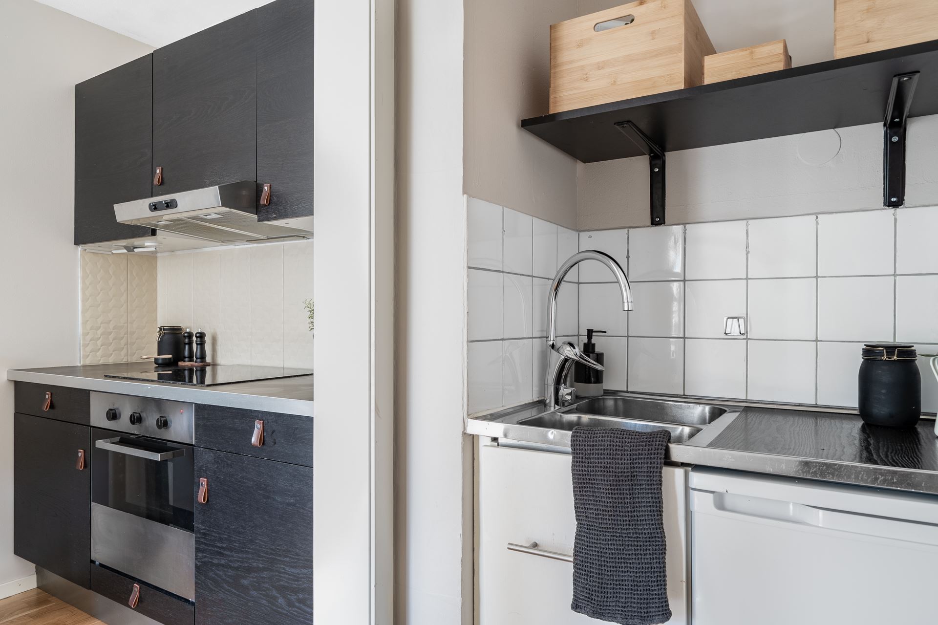 Mörka köksluckor (IKEA) tillsammans med mörk bänkskiva och kakel i beige ton. Köksdelen är utrustad med spishäll, ugn, köksfläkt, vask och kyl med frysfack.