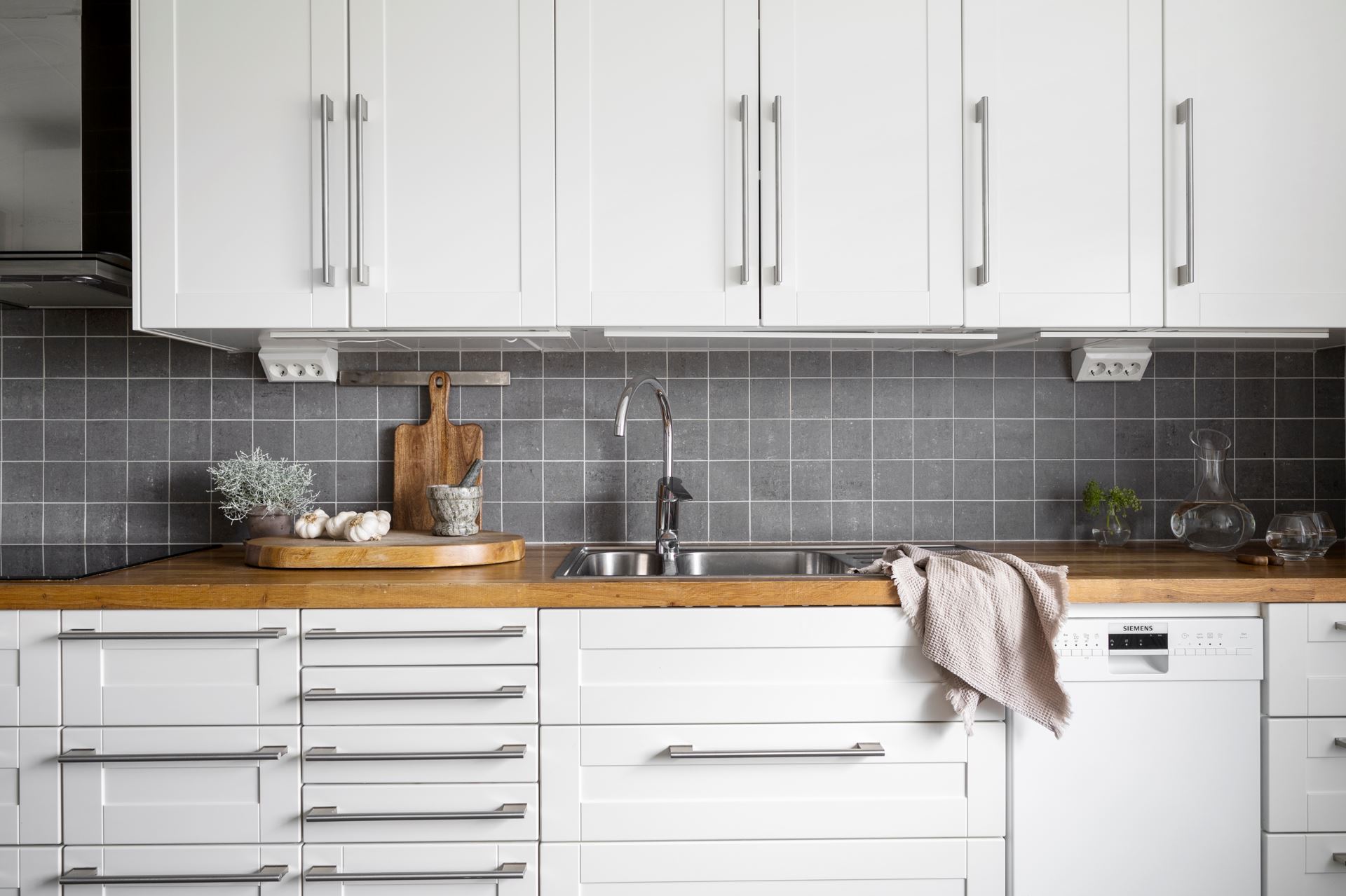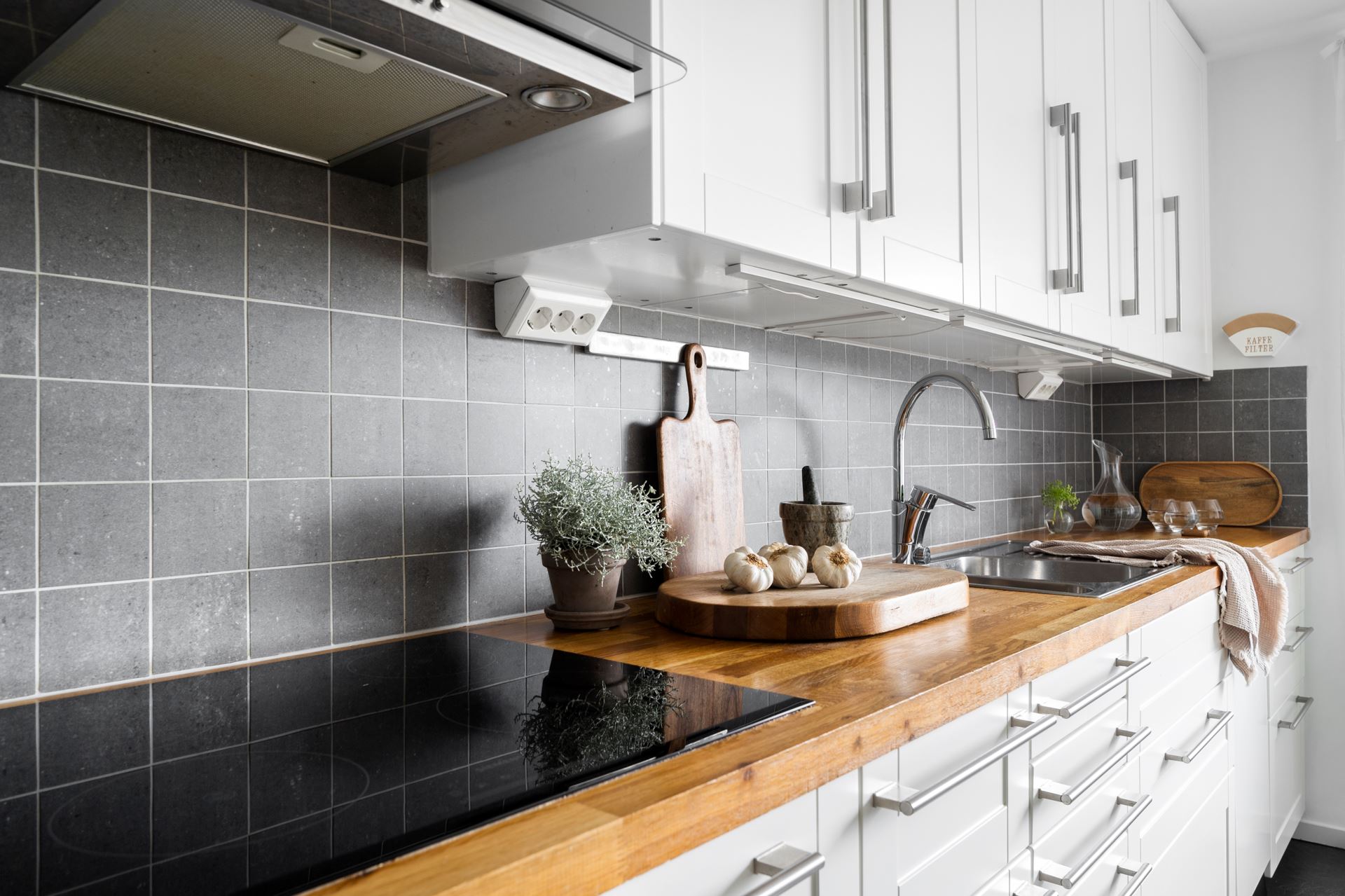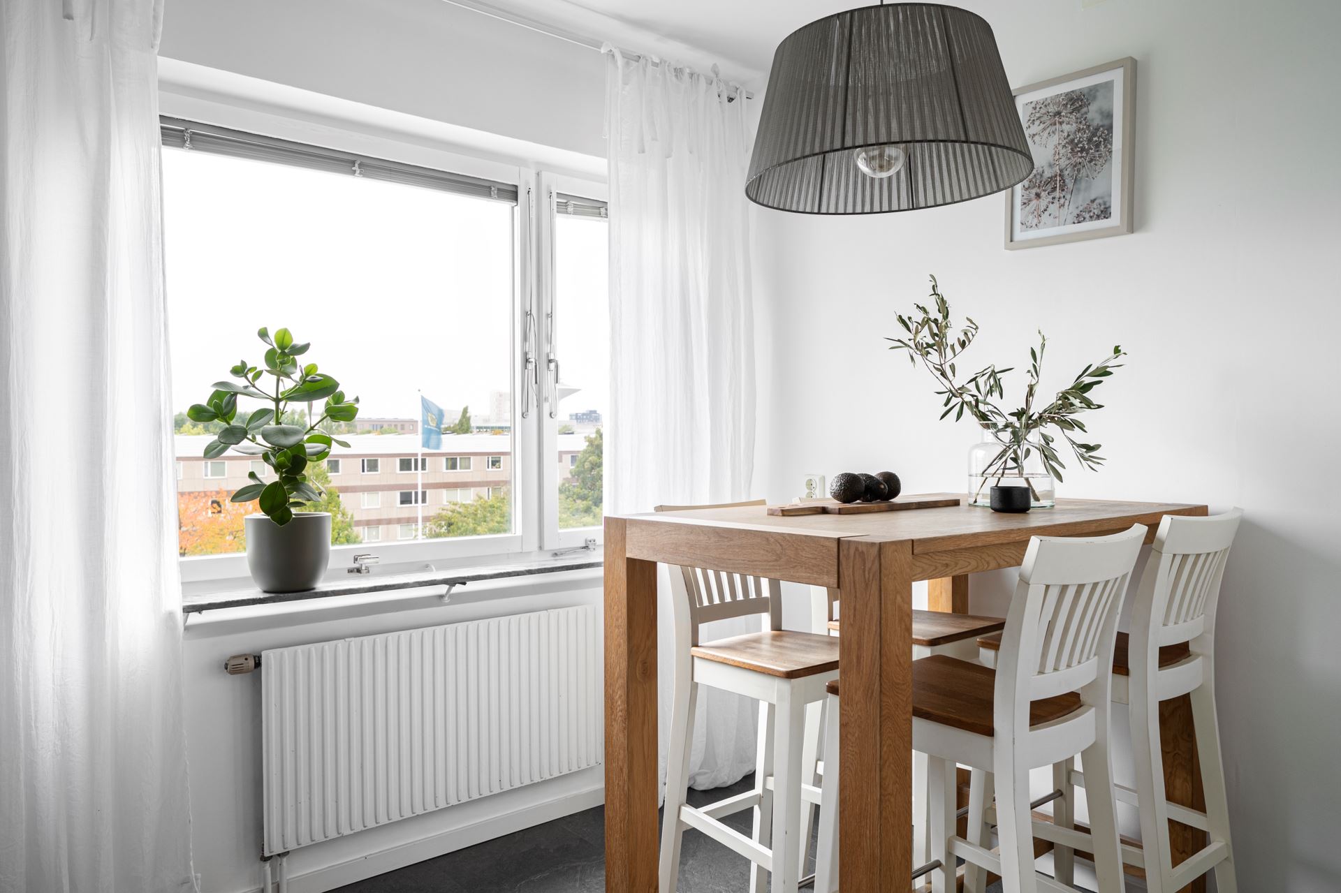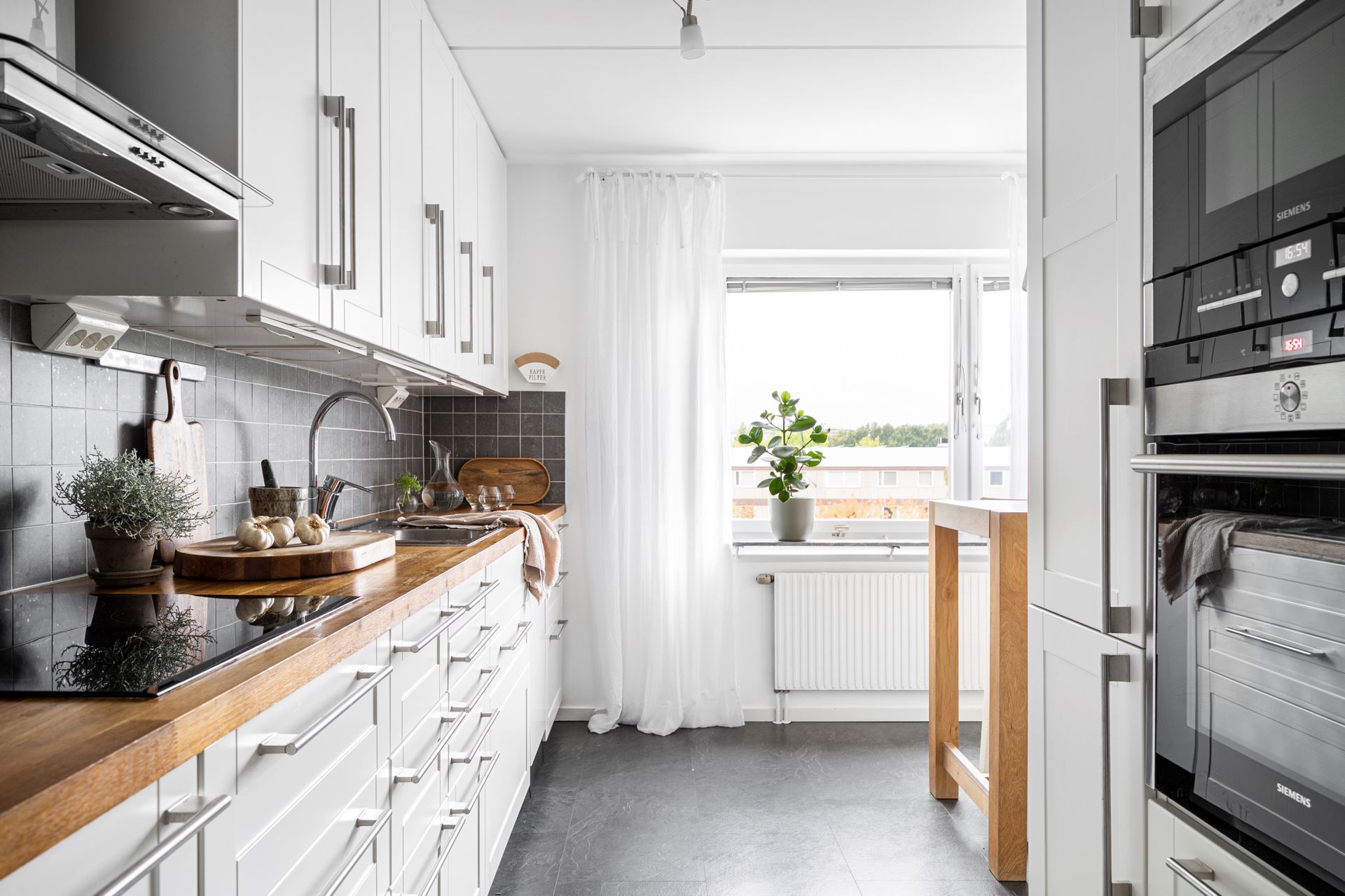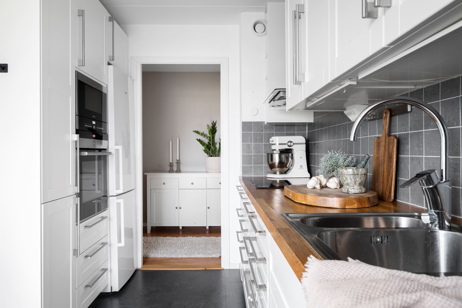 Lägenheten öppnar upp mot ett stilrent kök. Här finns utmärkt med förvaringsutrymme bakom vita skåpsluckor som kombineras fint med bänkskiva i trä. Köket erbjuder kyl/frys, induktionshäll, ugn, köksfläkt, mikro och diskmaskin. Här finns bekvämt med plats för fyra personer mot fönsterparti som tillför extra ljusinsläpp.