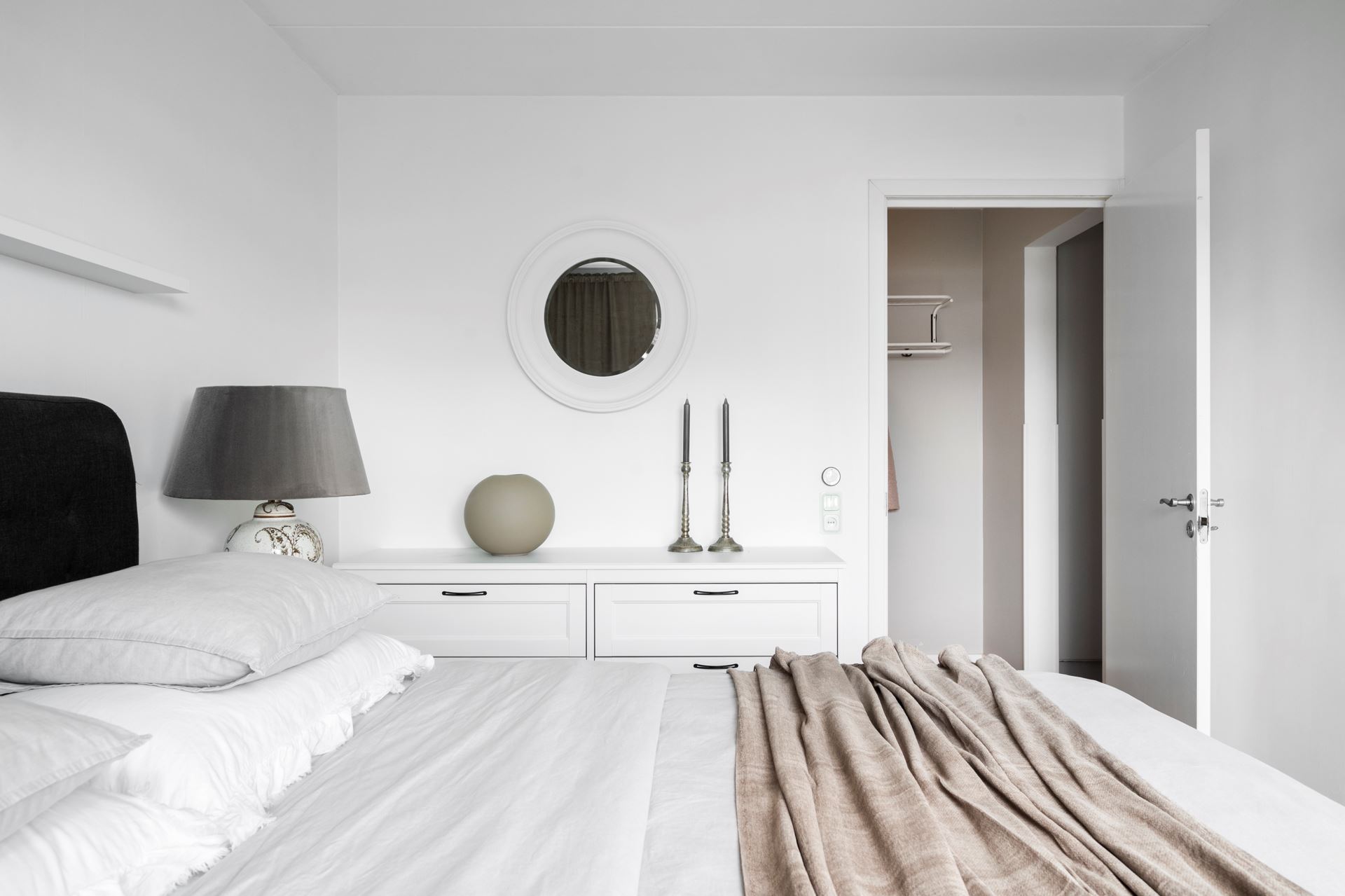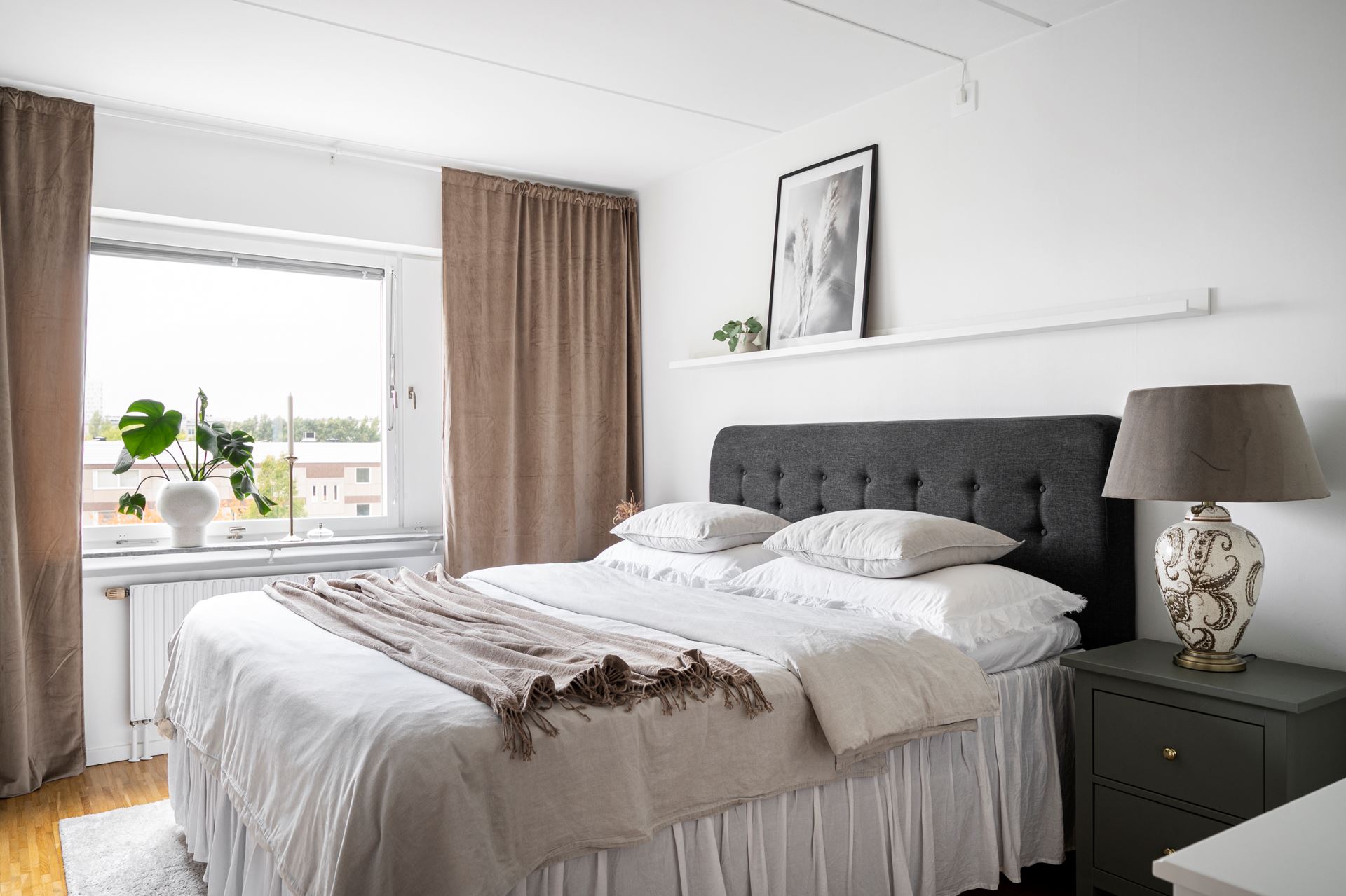 Från hallen når vi bostadens sovrum. Bra till storleken där det finns plats för dubbelsäng, samt ytterligare förvaring hittar vi i rymlig garderob. Även här hittar vi fint parkettgolv som kombineras snyggt med ljusmålade väggar.