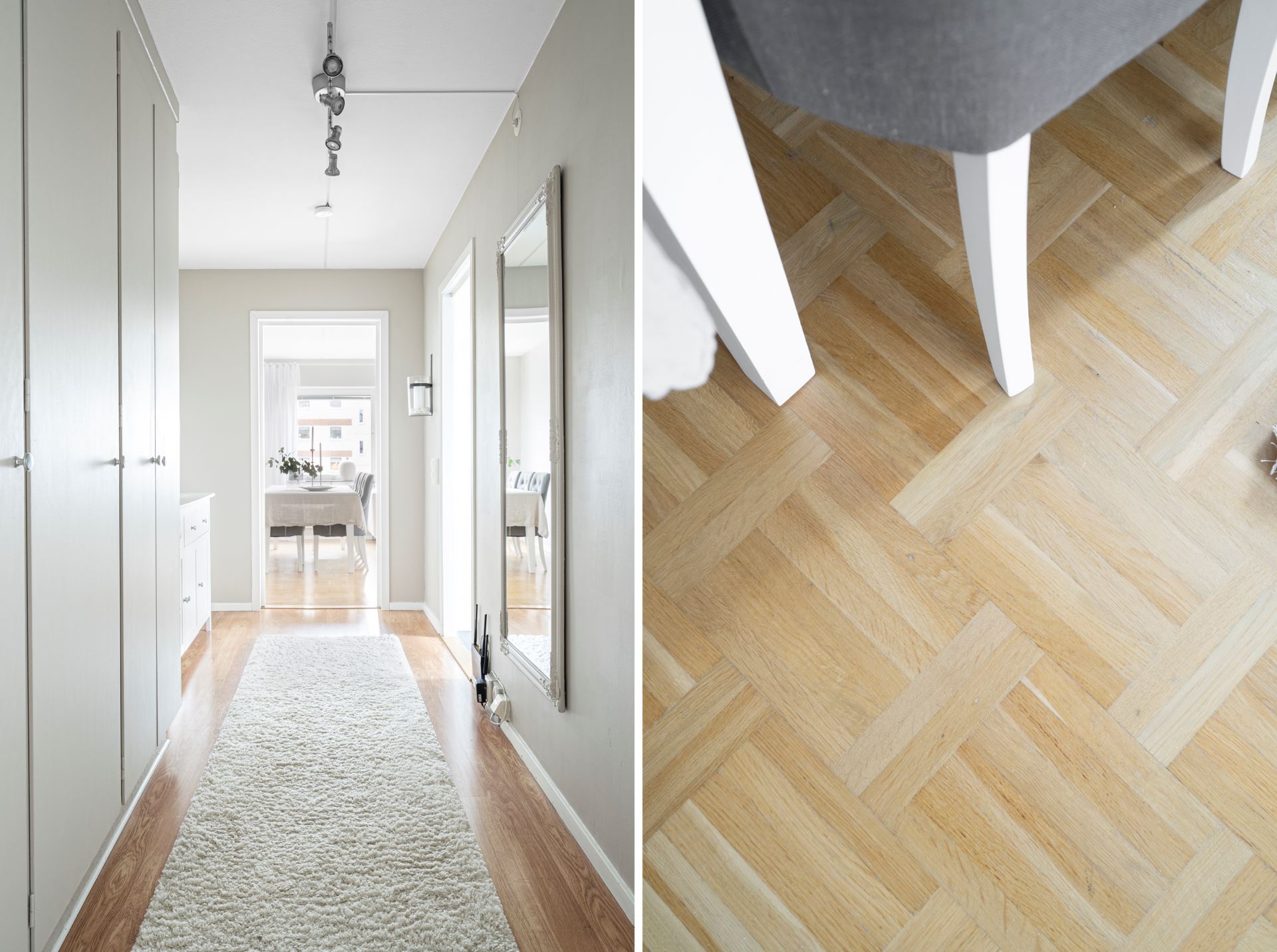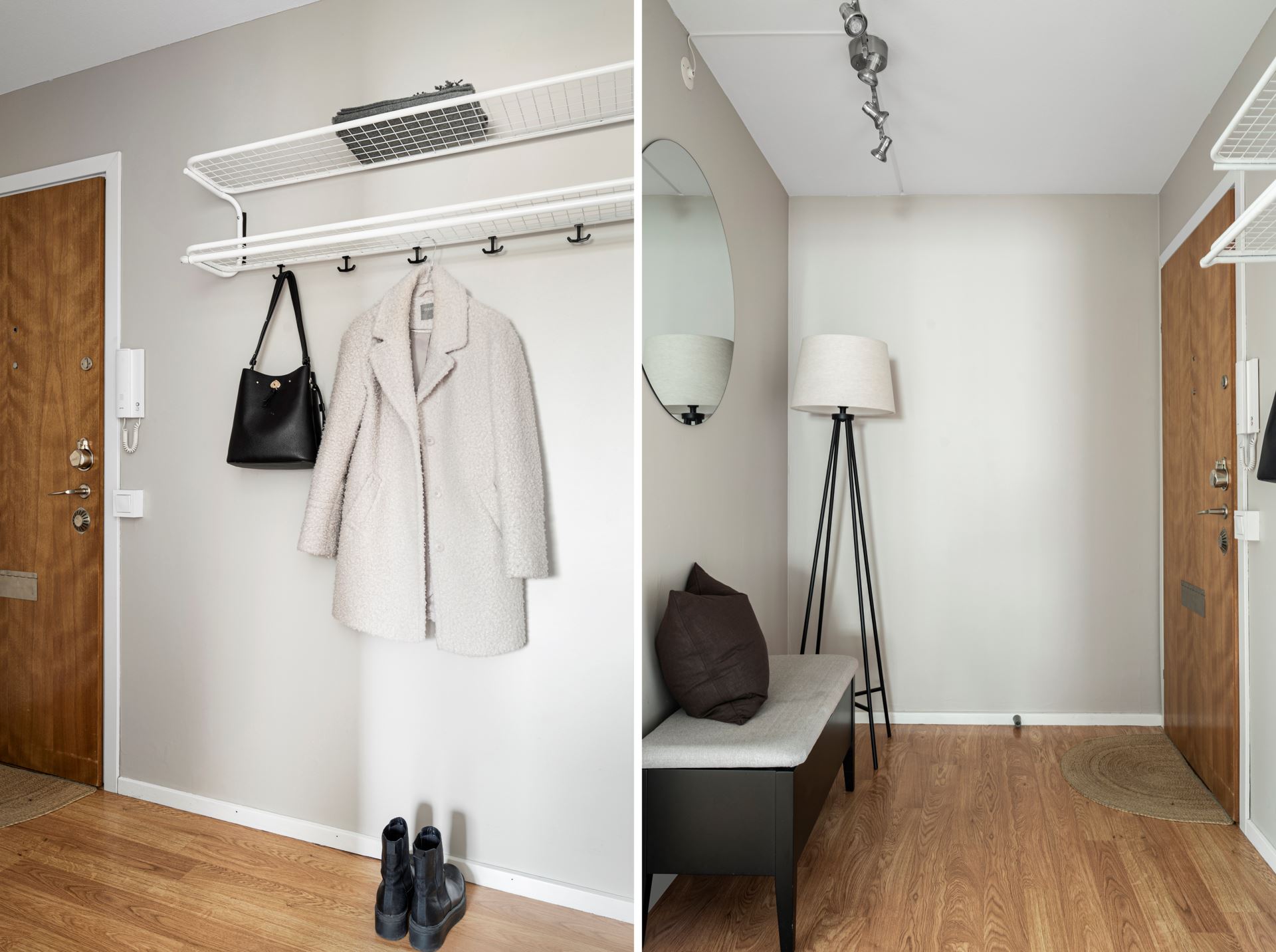 Vi tar hissen från markplan till fjärde våningen där vi välkomnas in i denna välplanerade bostad. Här finns gott om utrymme för hatt- och skohylla. Längre in i lägenheten finns även ytterligare förvaringsmöjligheter i praktiska garderober.
