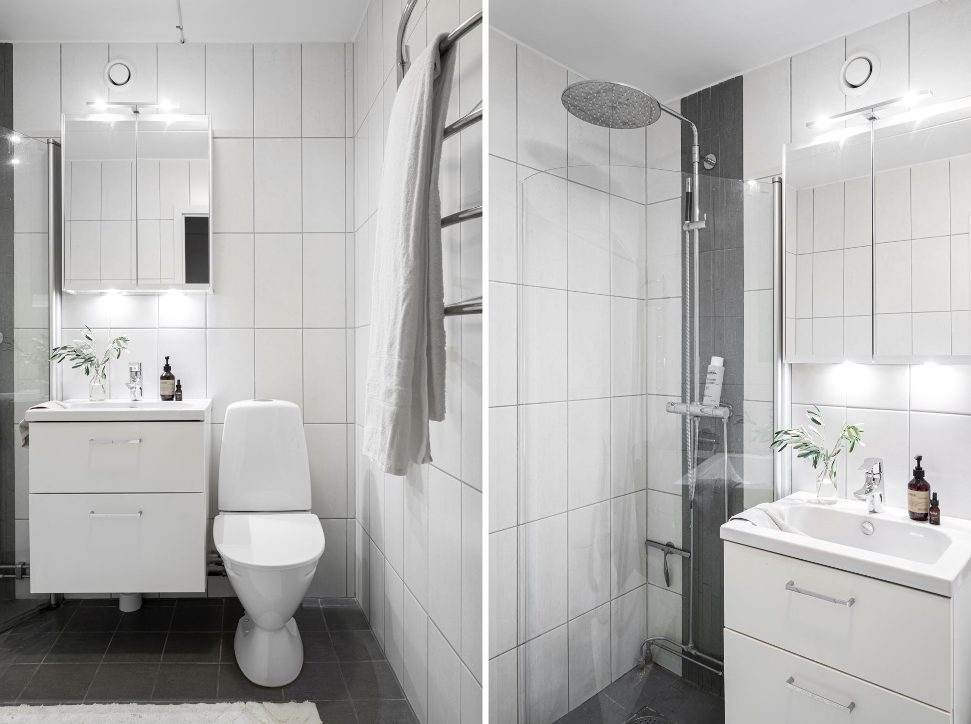 Helkaklat badrum med ljust kakel och gråa klinkers på golv. Badrummet är utrustat med dusch bakom glasvägg, spegelskåp, handfat med kommod och wc.